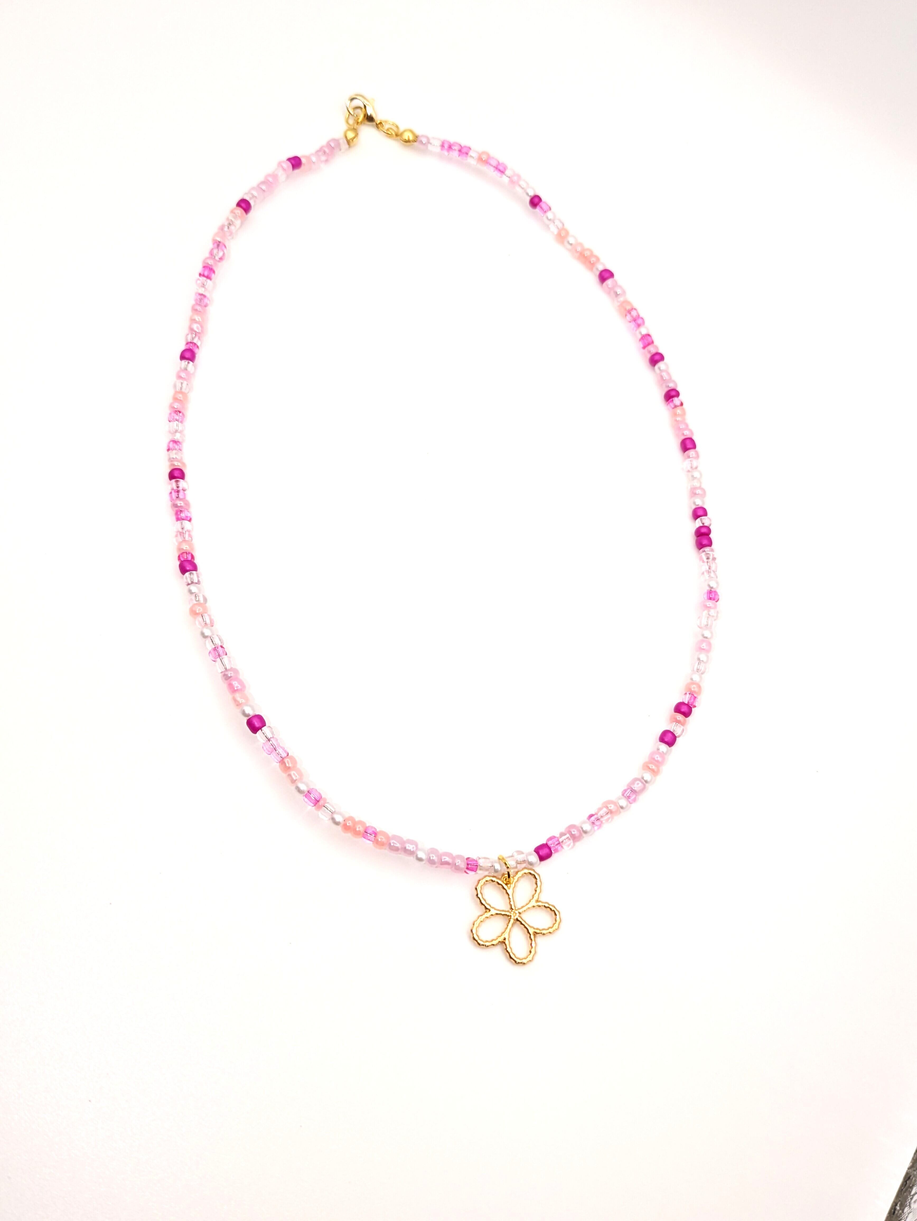 A delicate gold flower charm blooms gracefully, adorned with soft pink glass beads scattered like dewdrops. As light touches it, the necklace sparkles beautifully, adding a touch of elegance to your neckline.