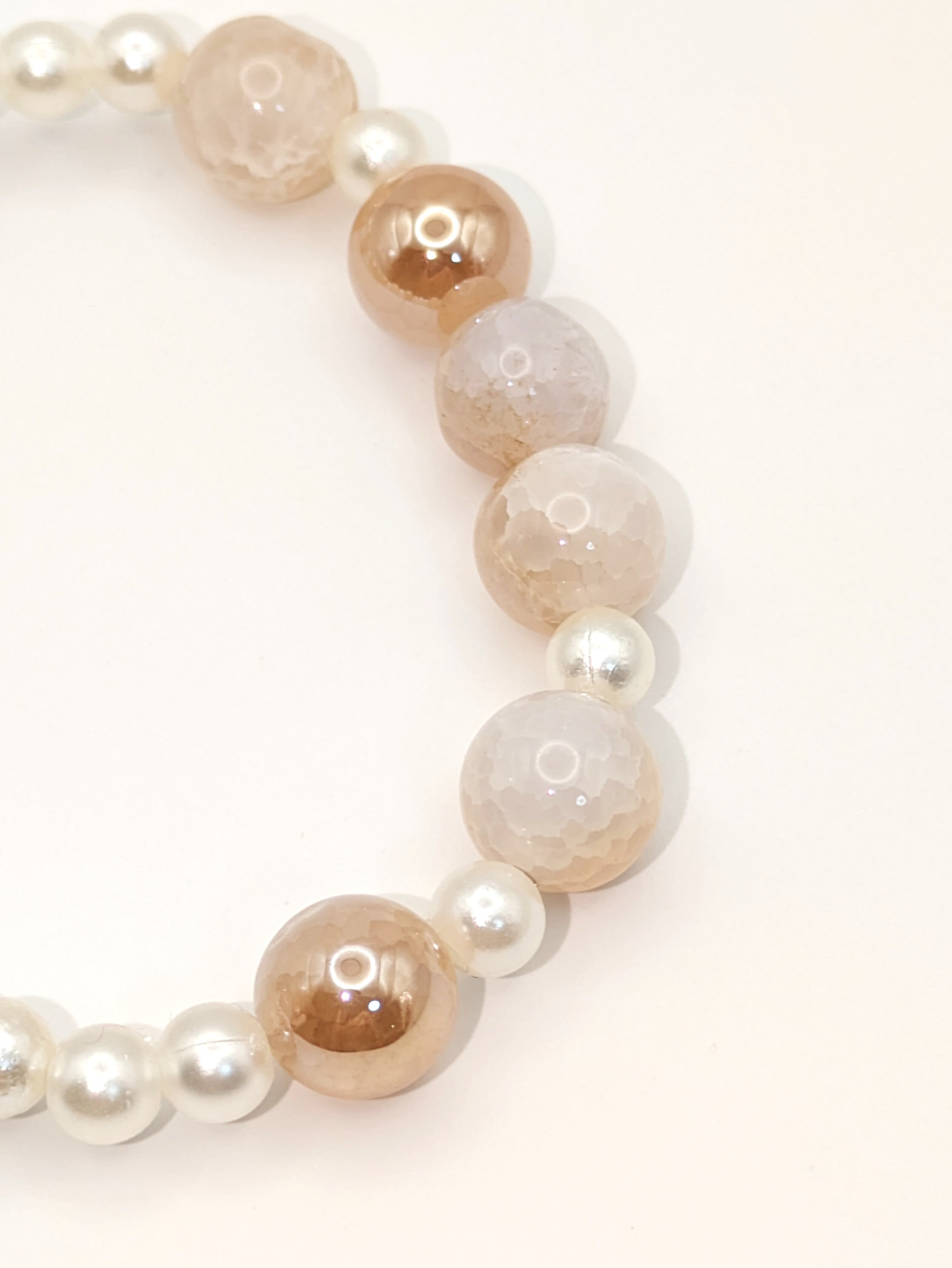 シャンパンゴールドの天然石(クラッシュタイプ 10mm)と、上品なオフホワイトのパール風ビーズ(6mm)を組み合わせたエレガントなブレスレットです。