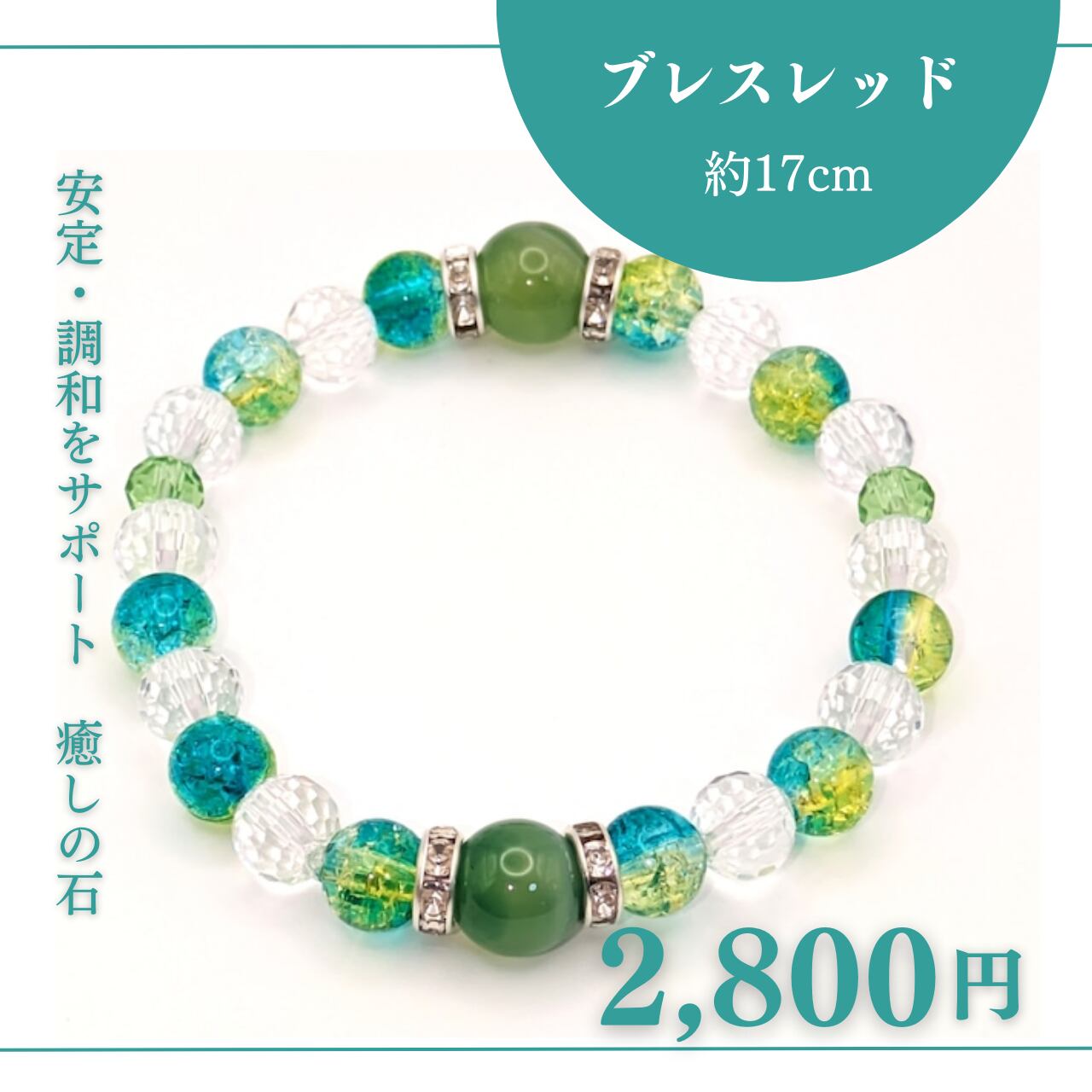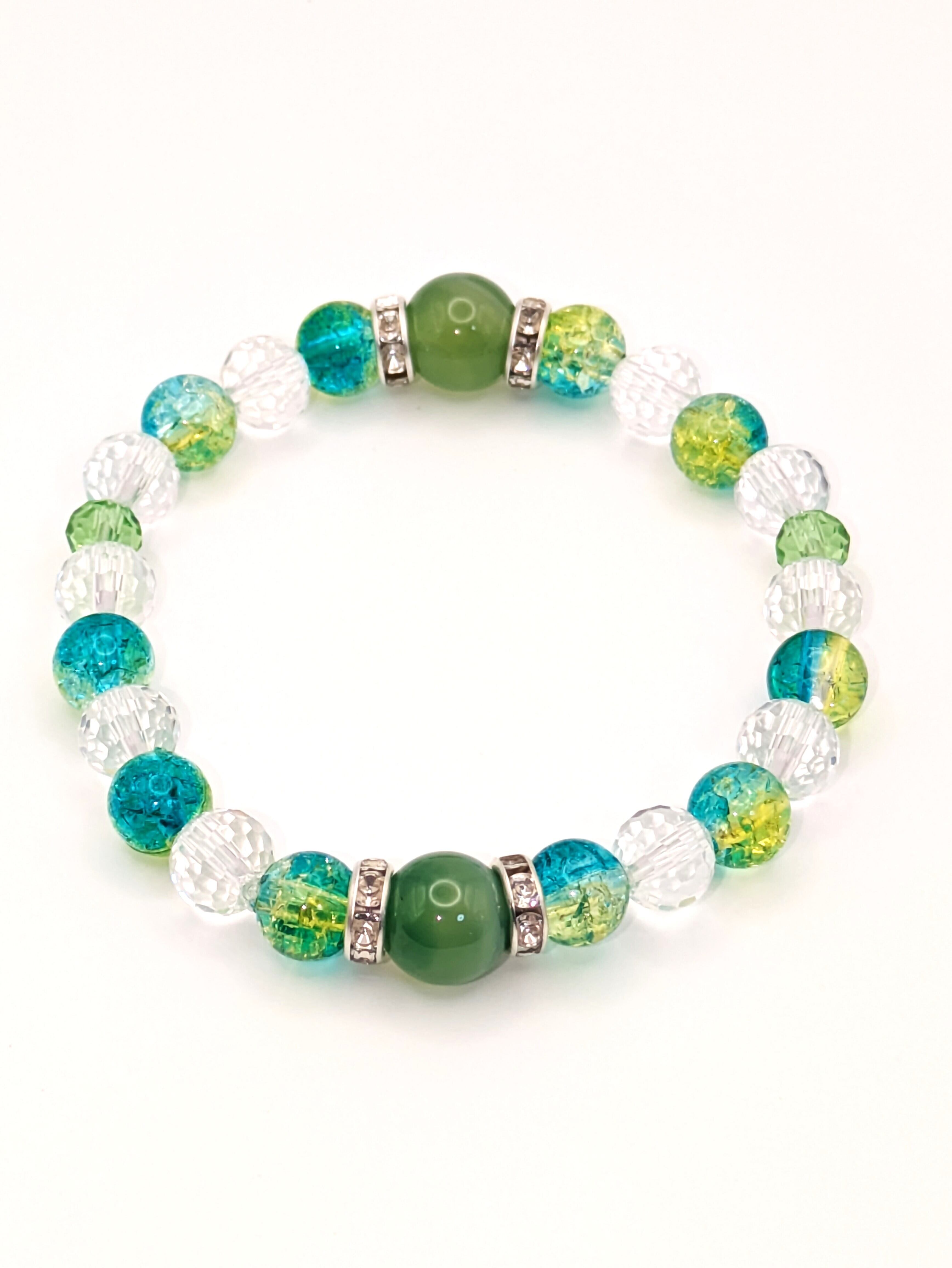 This elegant bracelet features deep green agate (10mm) as its centerpiece, beautifully complemented by silver rhinestones, refreshing light green clear acrylic beads (8mm), shimmering clear-cut glass beads (8mm), and soft light green glass beads (6mm).