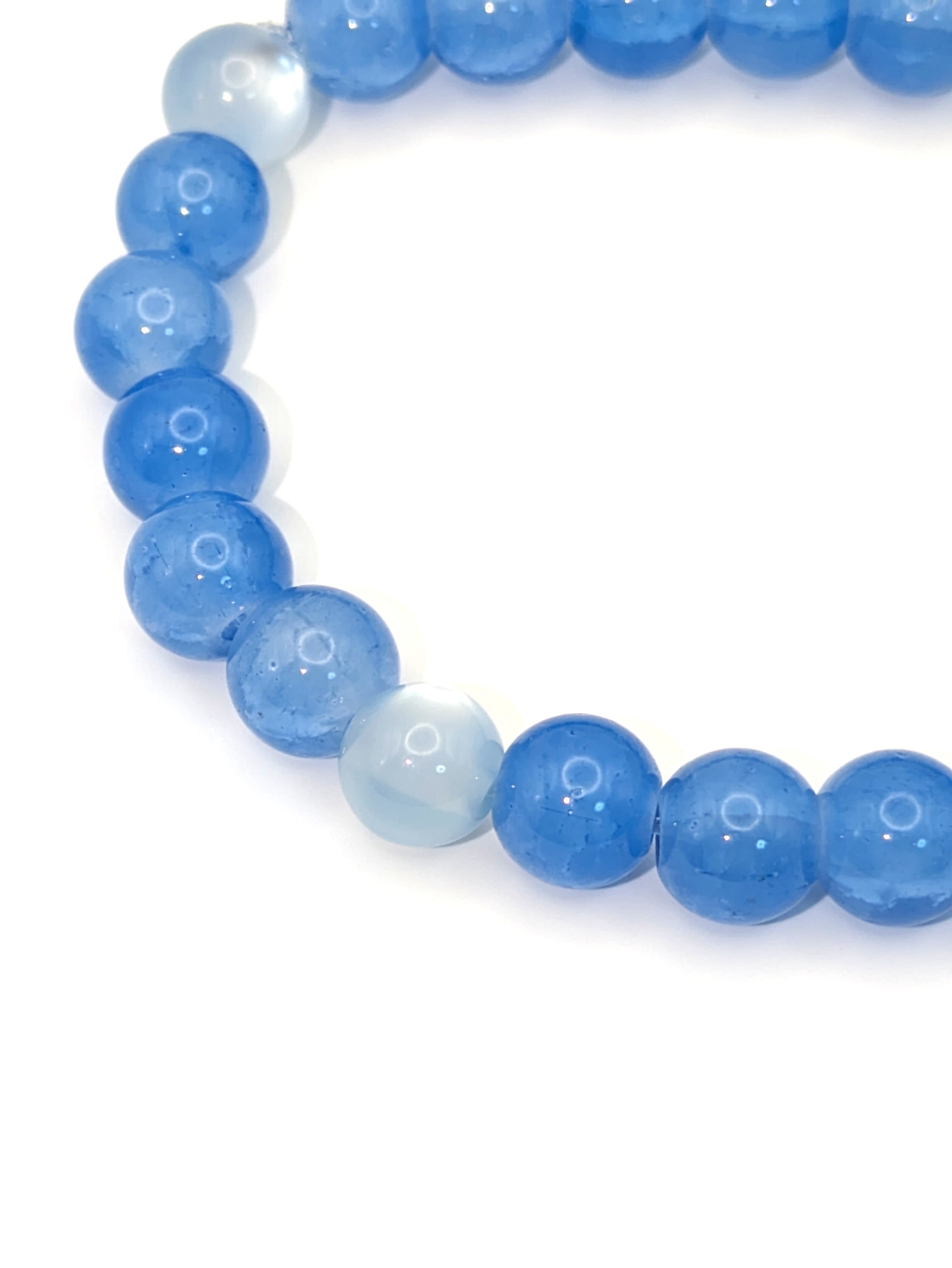 This beautiful and refreshing bracelet combines the deep shine of Cats Eye Blue (8mm) with the transparent elegance of Sky Blue glass beads (8mm).