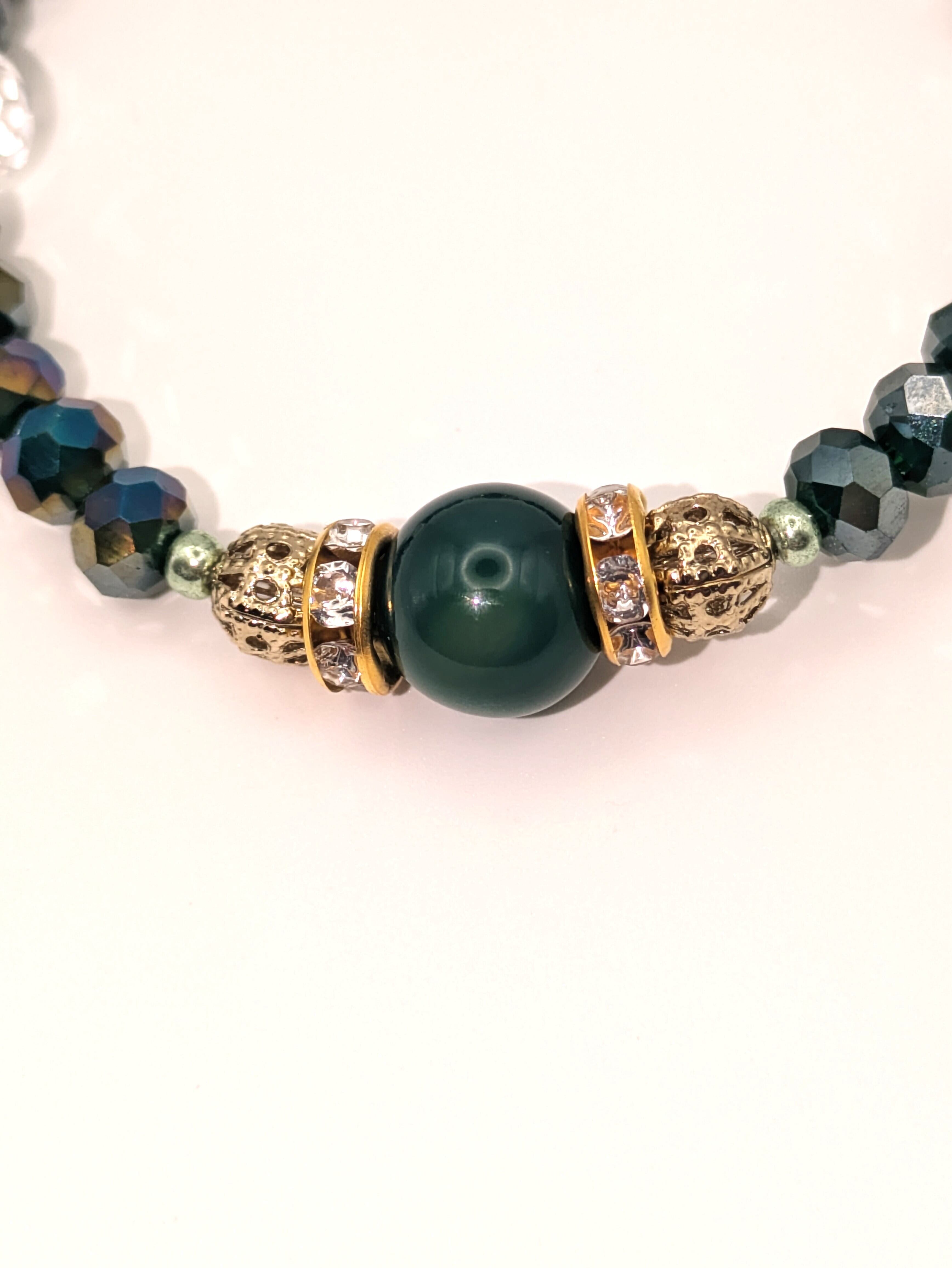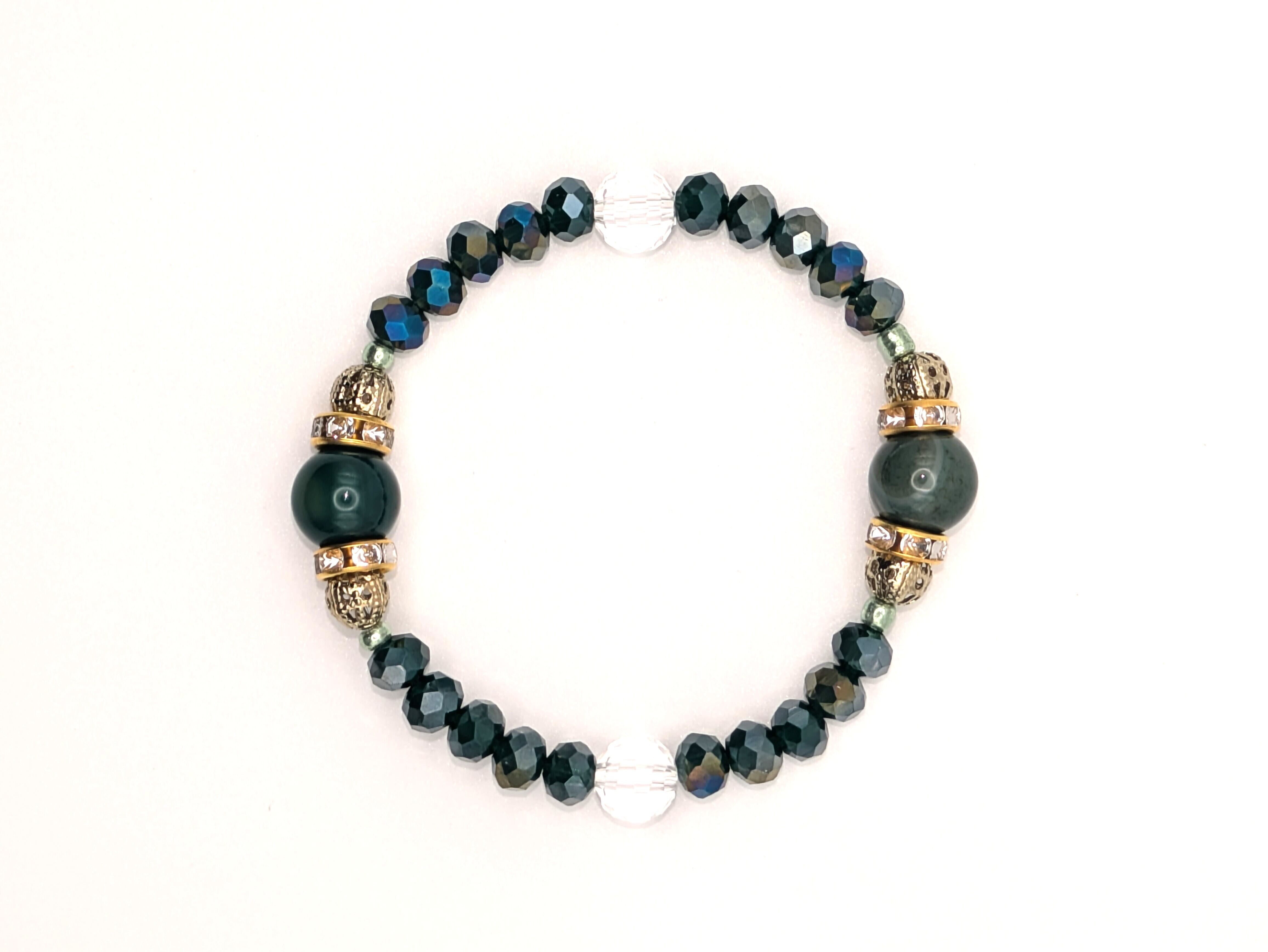 This handmade bracelet features deep green glass beads reminiscent of a lush forest, shimmering clear glass, and the mystical natural stone, green agate.