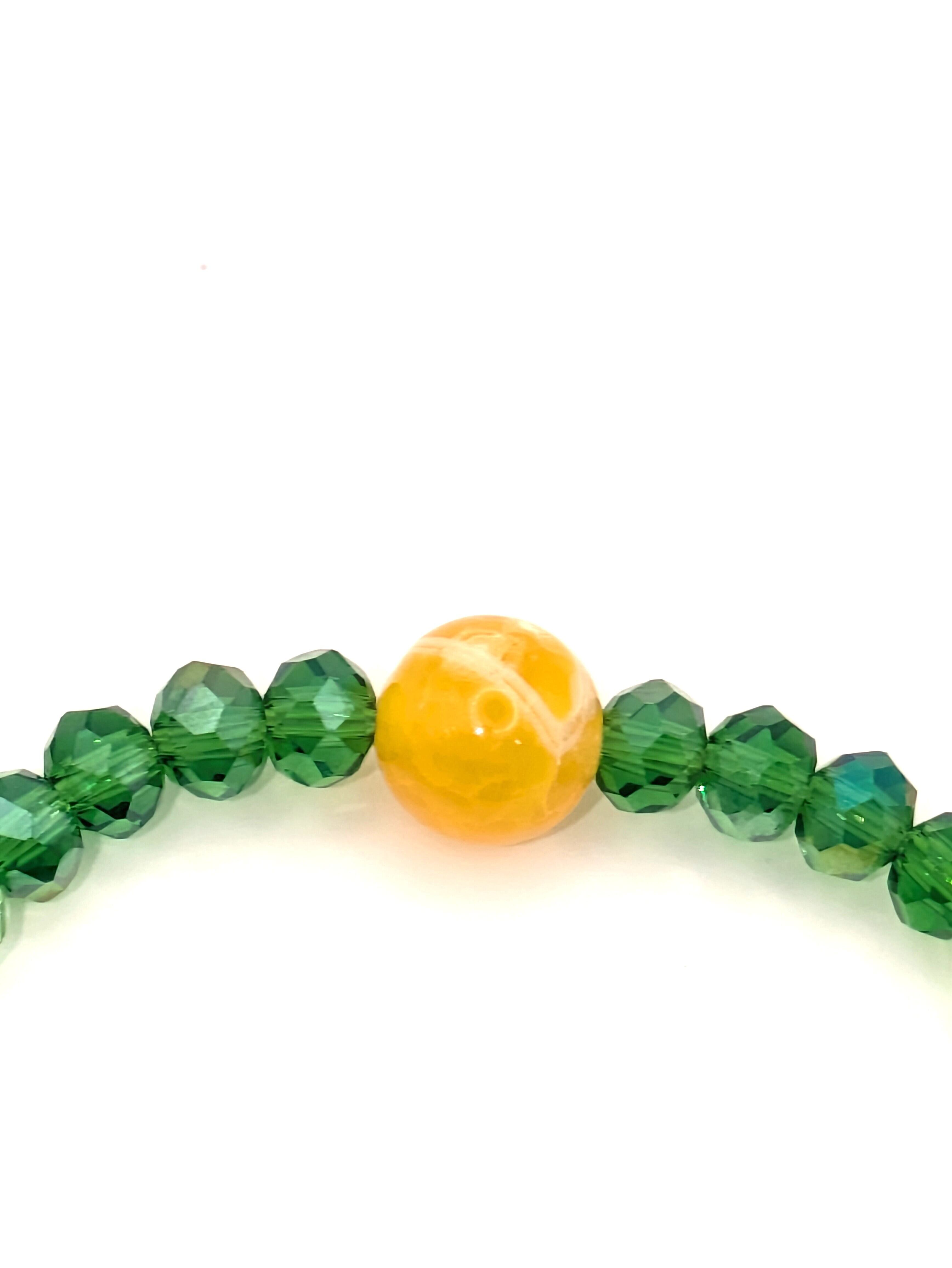 This handmade bracelet features natural yellow jade, radiating the warmth of the sun, combined with beautifully cut clear, light green, and green glass beads that shimmer elegantly.