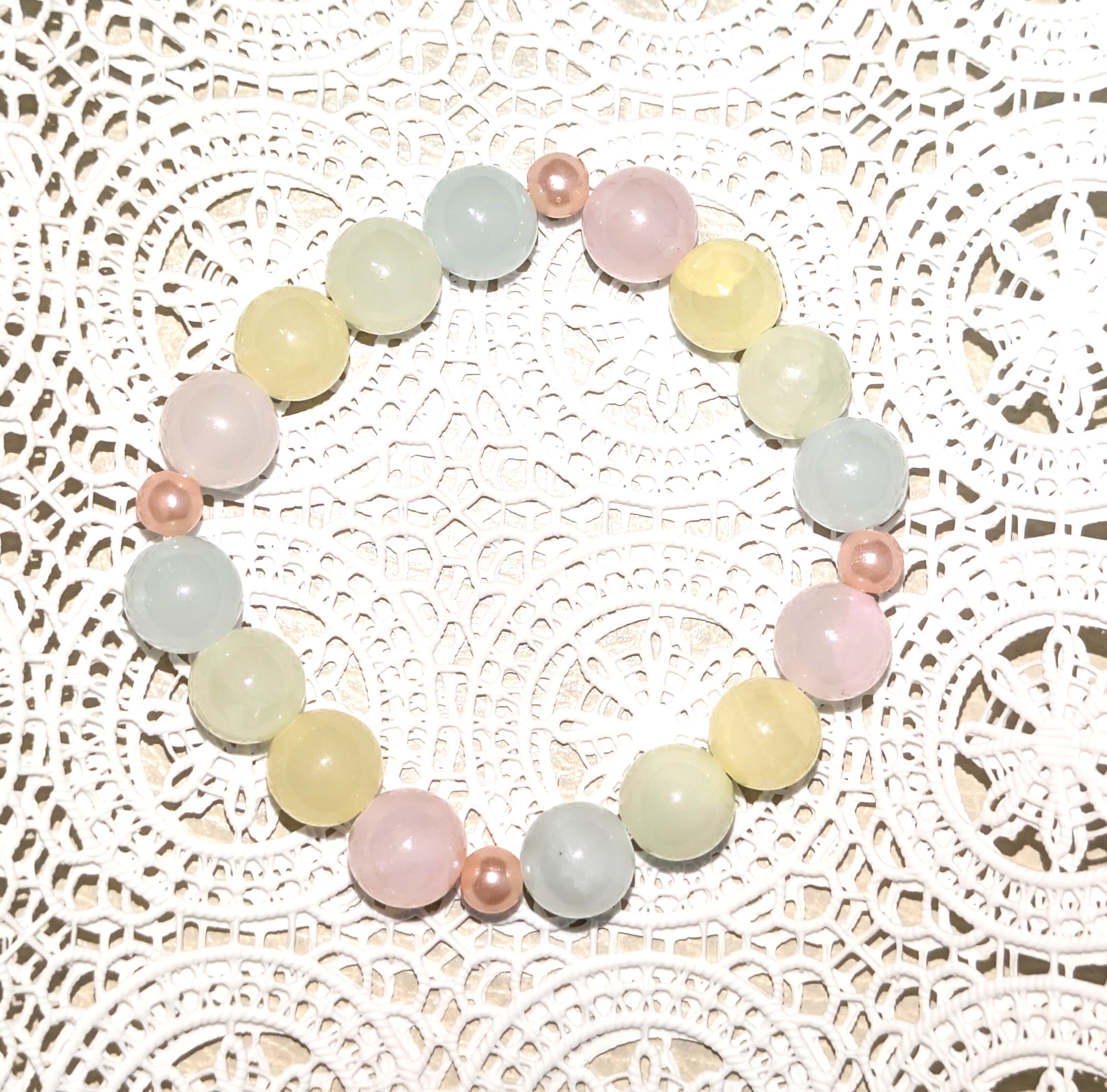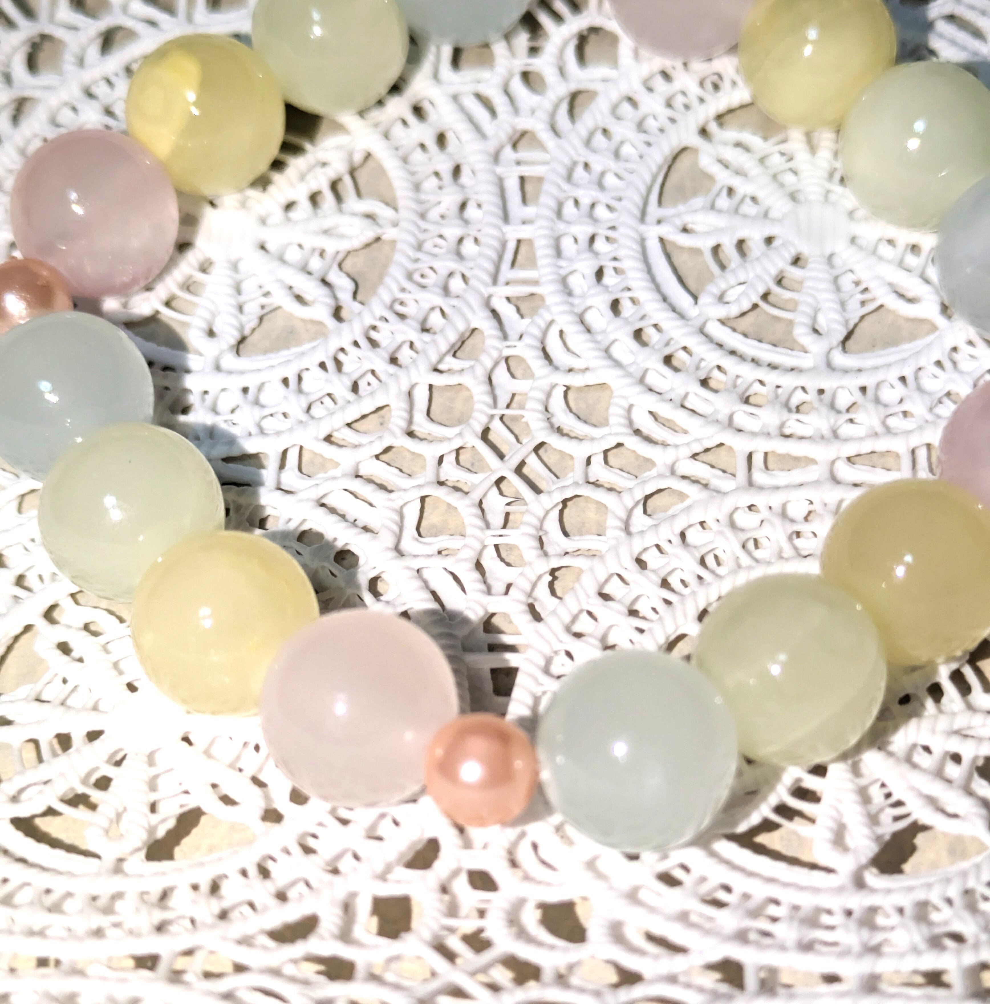 「このブレスレットは、パステルカラーの天然石(ピンク、黄色、黄緑、水色)を16個(10mm)と、4か所に配置されたベージュパール(3mm)が調和し、心に安らぎとポジティブなエネルギーをもたらします。それぞれの天然石には特別な意味が込められています。