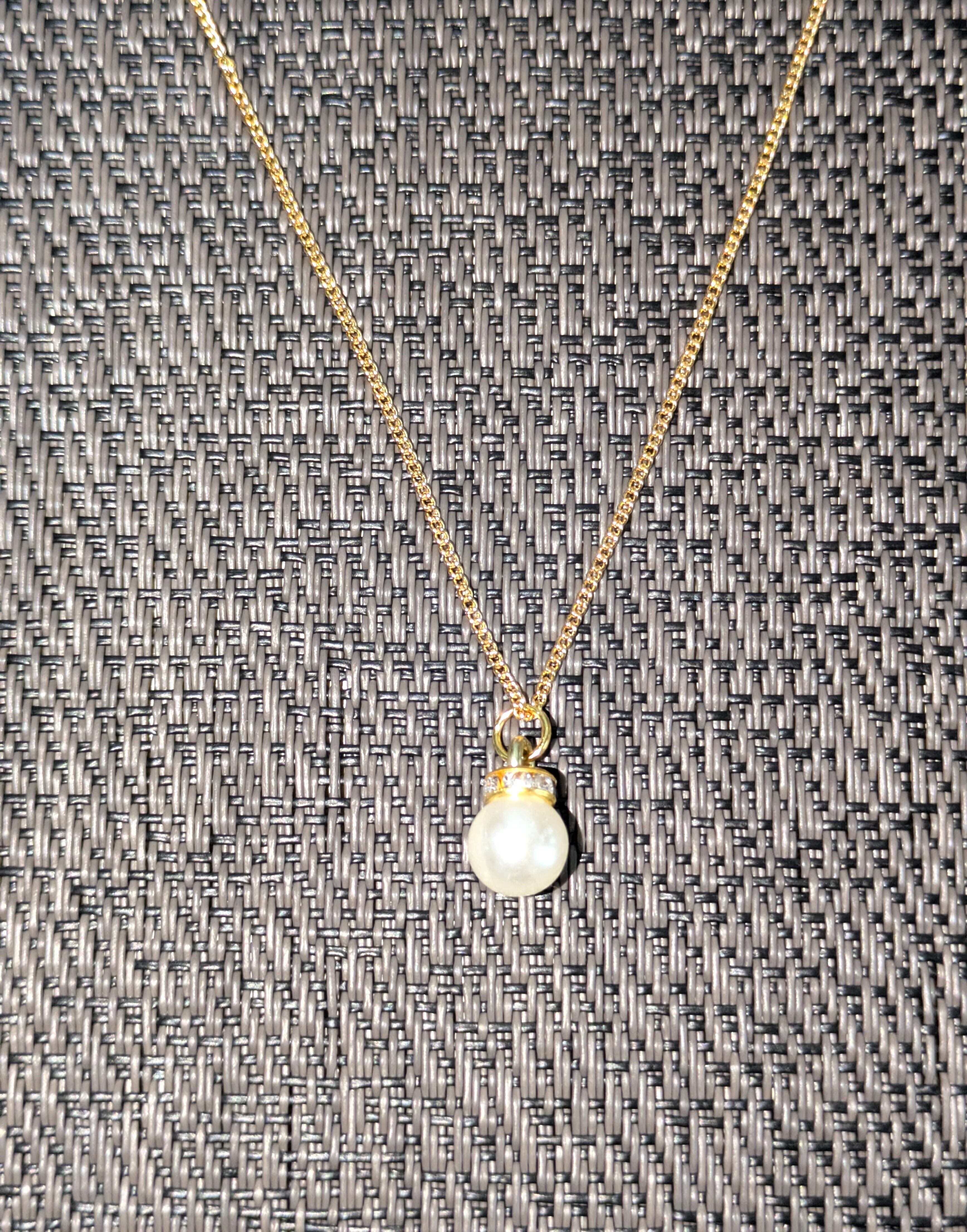 「このネックレスは、ゴールドのチェーンに一粒のパールチャームをあしらったシンプルで上品なデザインです。サイズは40cmで、デイリー使いから特別な日まで、さまざまなシーンにぴったり。パールは「純粋さ」や「調和」を象徴し、身につけることで幸運を引き寄せるとされています。カジュアルにもフォーマルにも合わせやすく、どんなTPOにも馴染みます。シンプルながらも存在感のあるこのネックレスは、あなたの魅力を引き立て、幸運を呼び込んでくれるでしょう。」