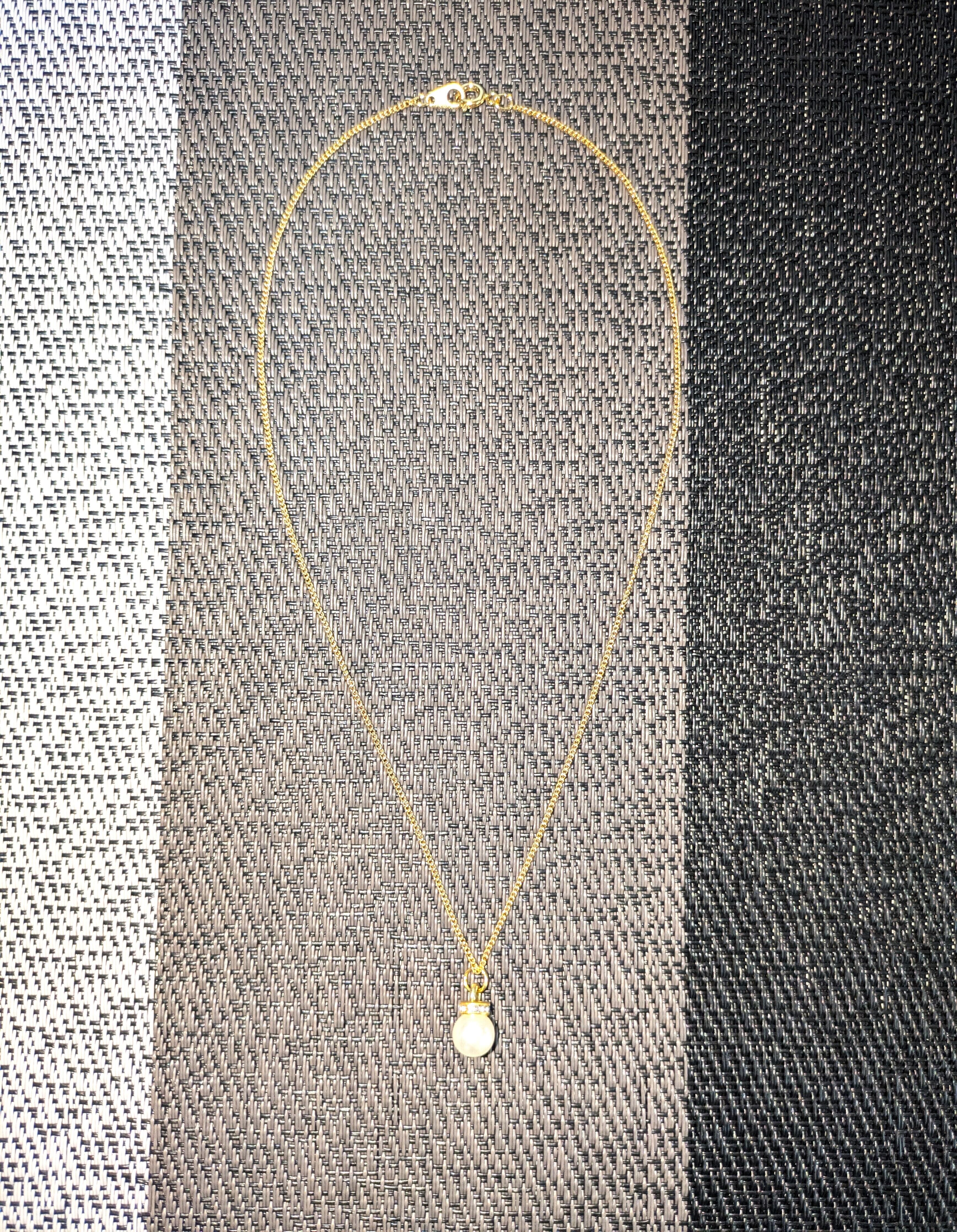 "This necklace features a simple yet elegant design with a gold chain and a single pearl charm. With a length of 40cm, it’s perfect for everything from everyday wear to special occasions. The pearl symbolizes 'purity' and 'harmony,' and wearing it is believed to attract good luck. It easily complements both casual and formal styles, making it suitable for any occasion. Subtle yet striking, this necklace enhances your charm and brings good fortune into your life."