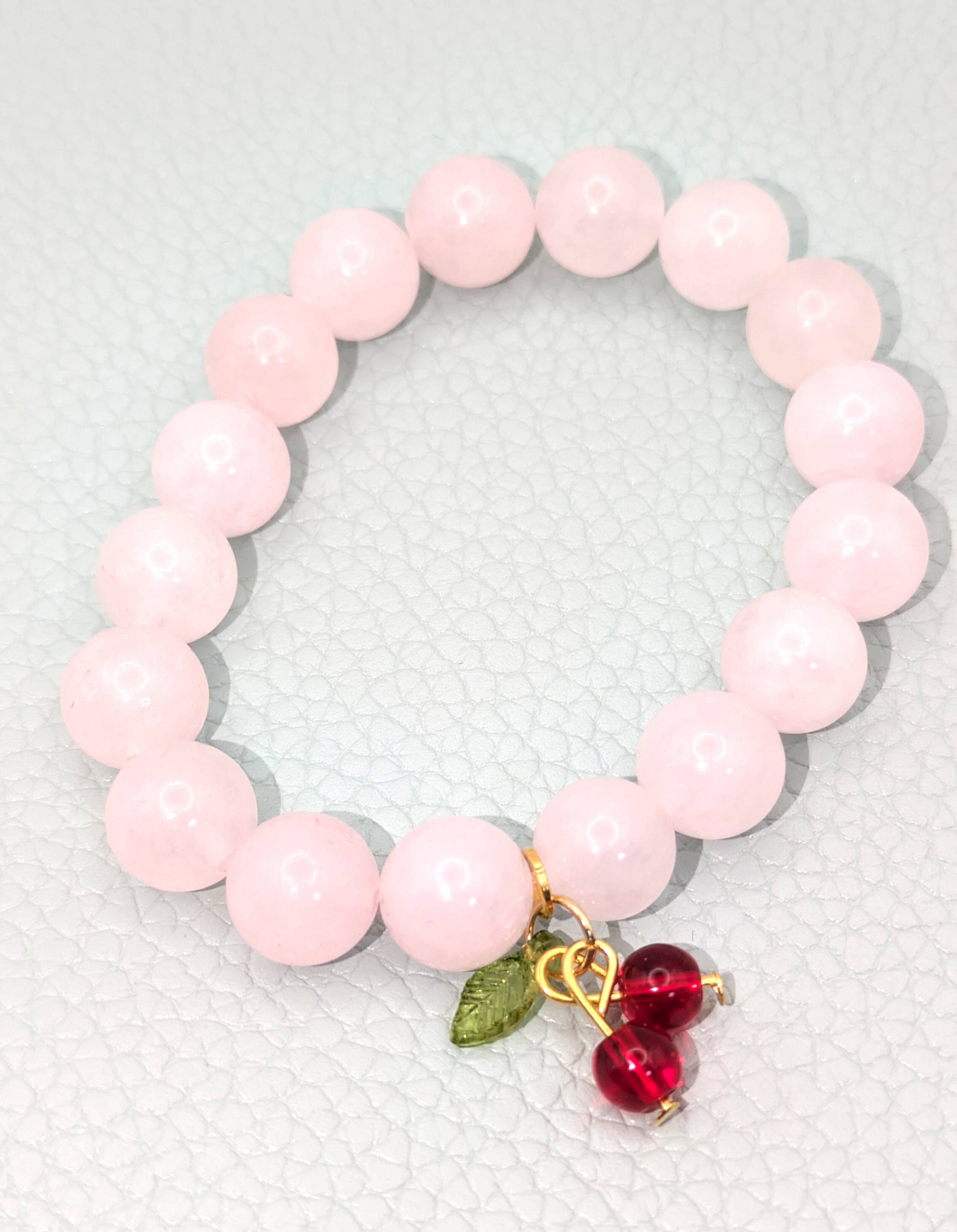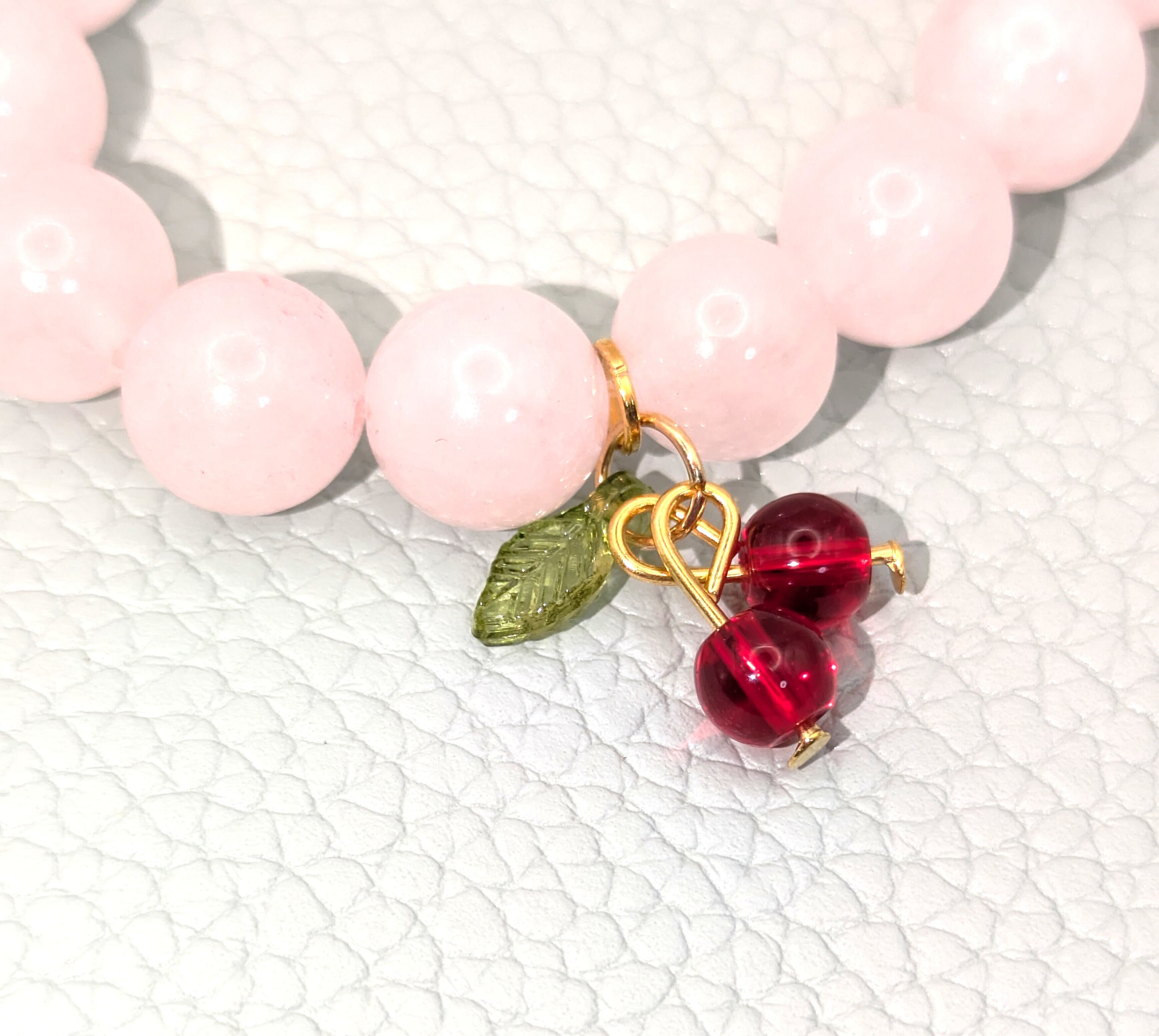 This charming bracelet features soft pink 10mm rose quartz beads accented with a delicate cherry charm that sways with your movement.