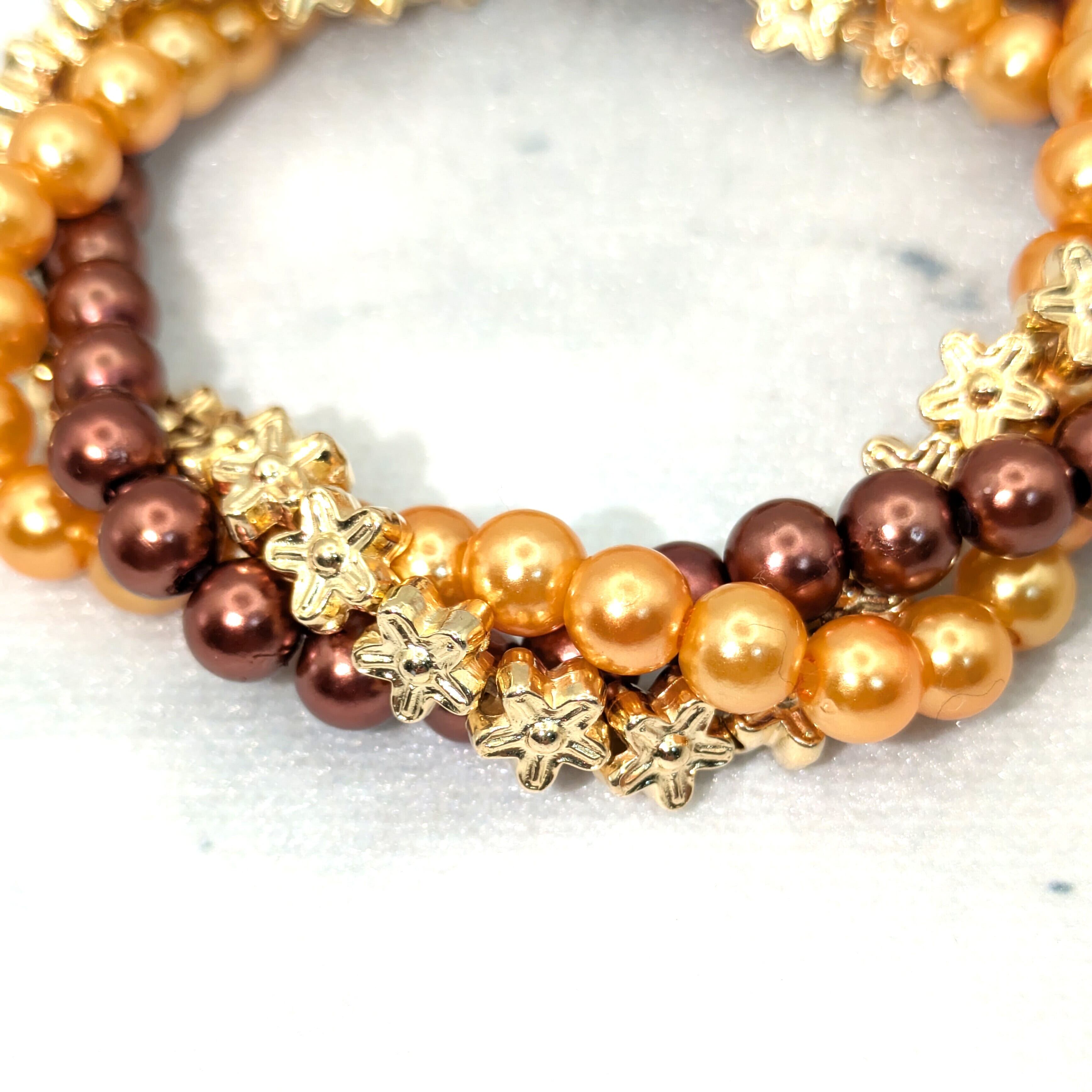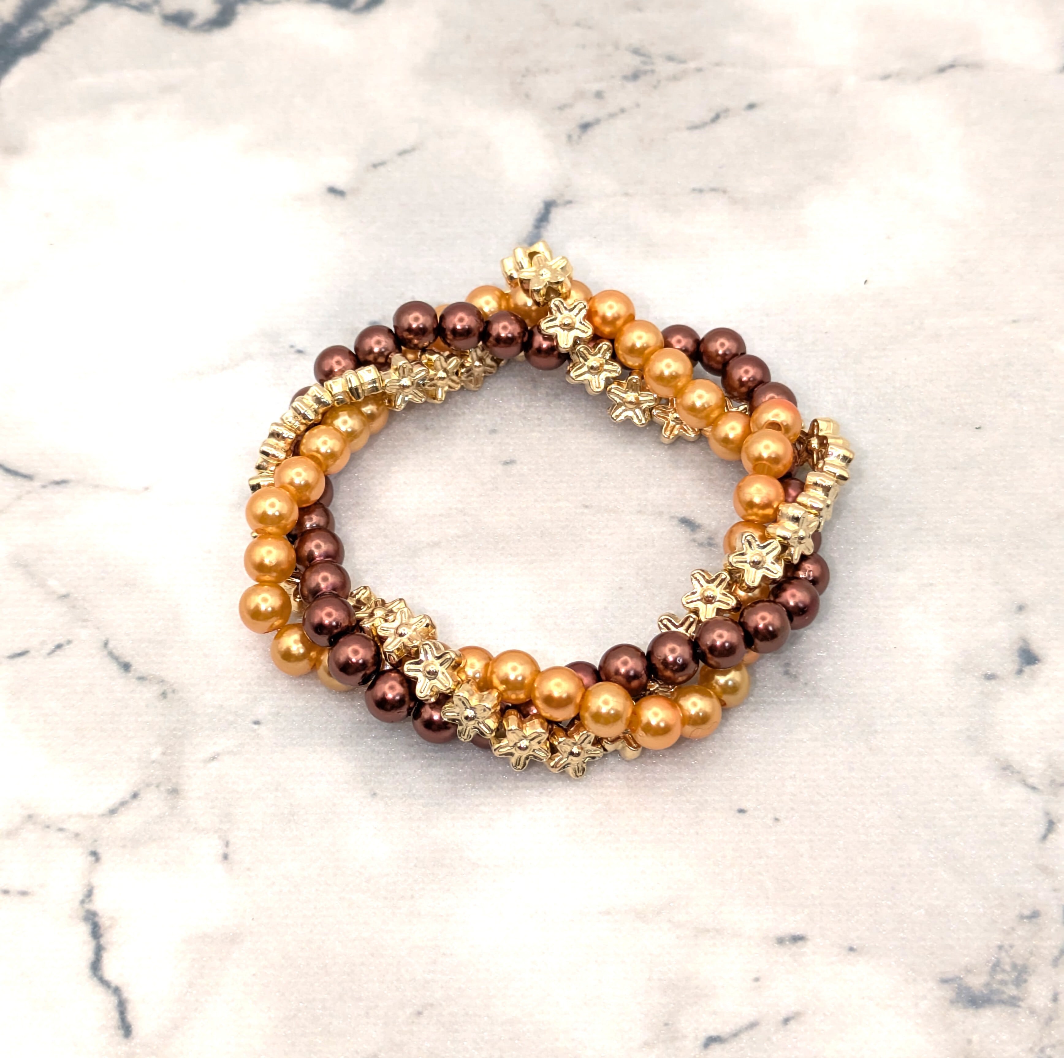 A charming triple-strand bracelet featuring floral gold spacers and soft-toned faux pearl beads in tea brown and champagne gold (6mm).