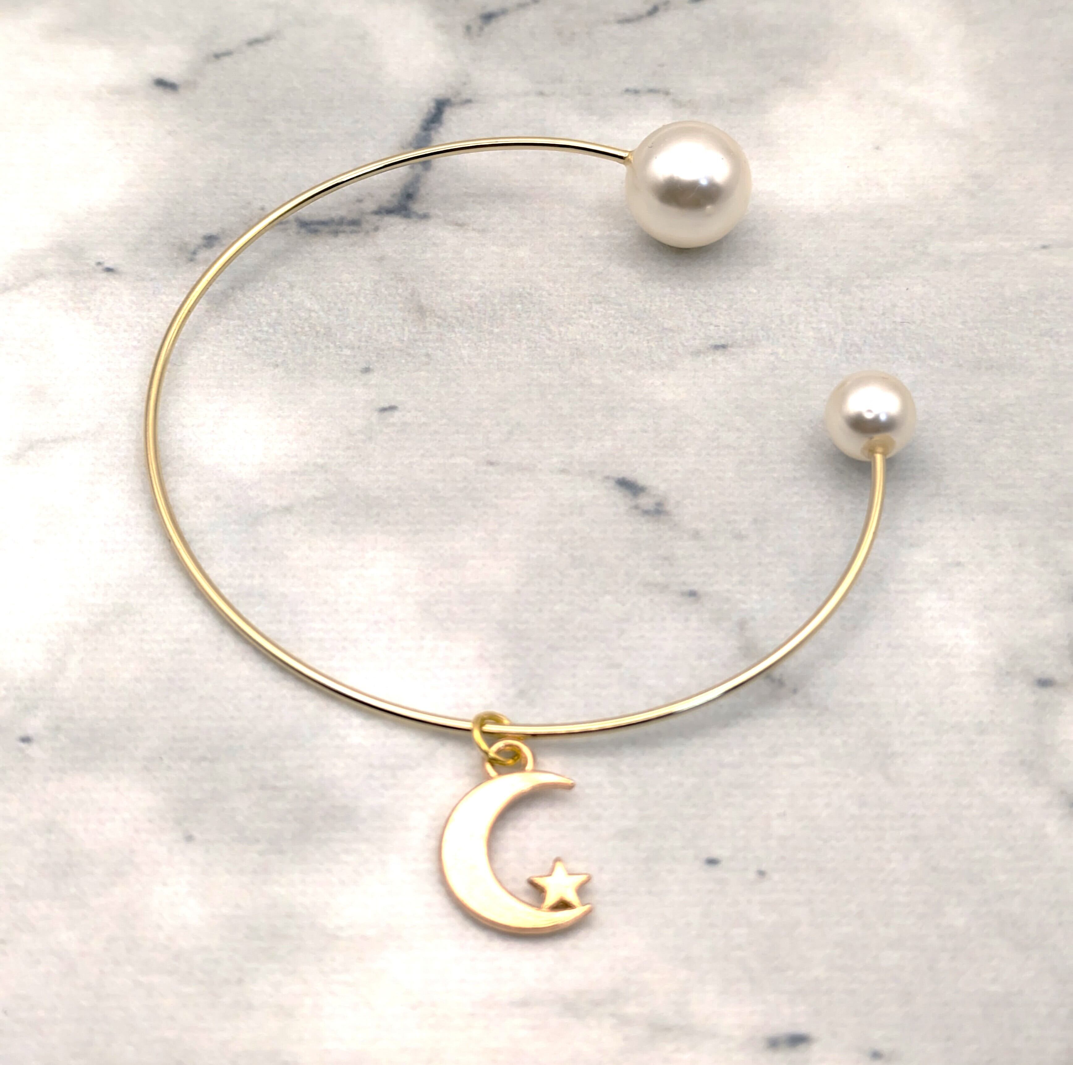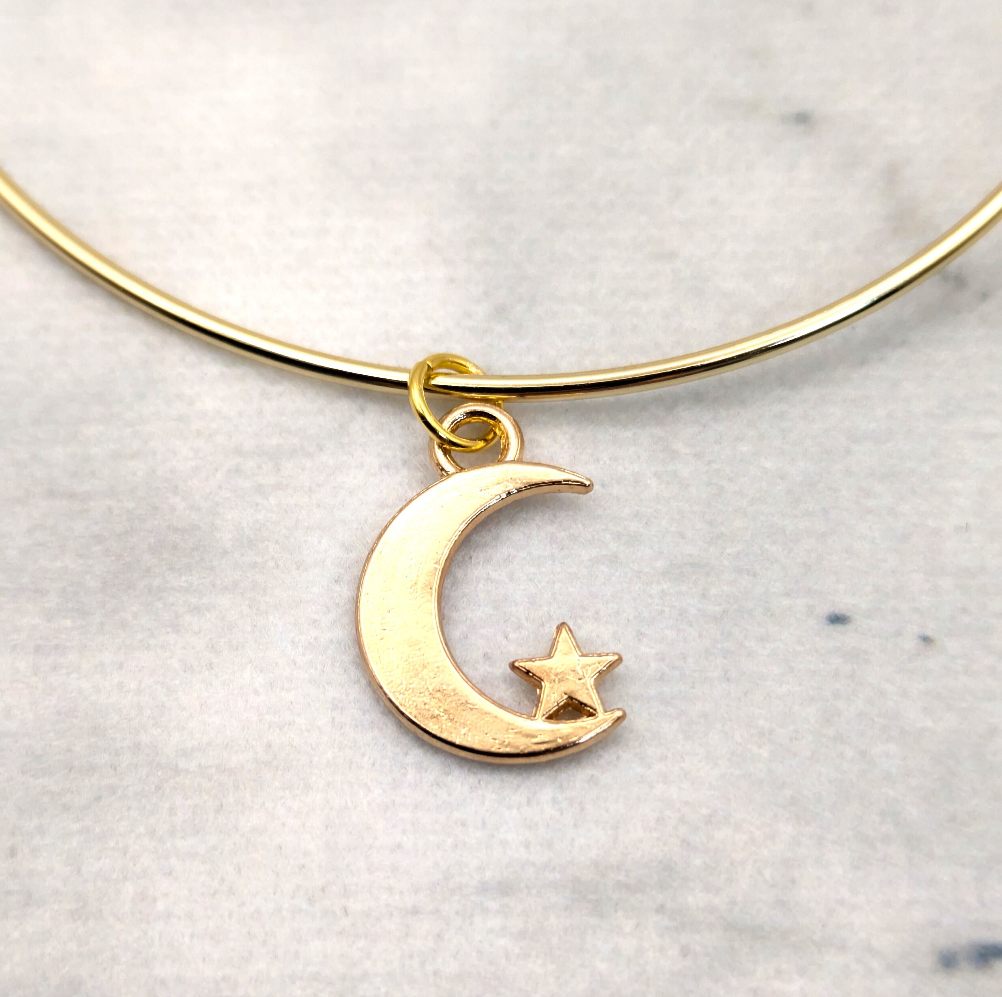 The charm — a crescent moon with a tiny star — adds a touch of quiet magic,