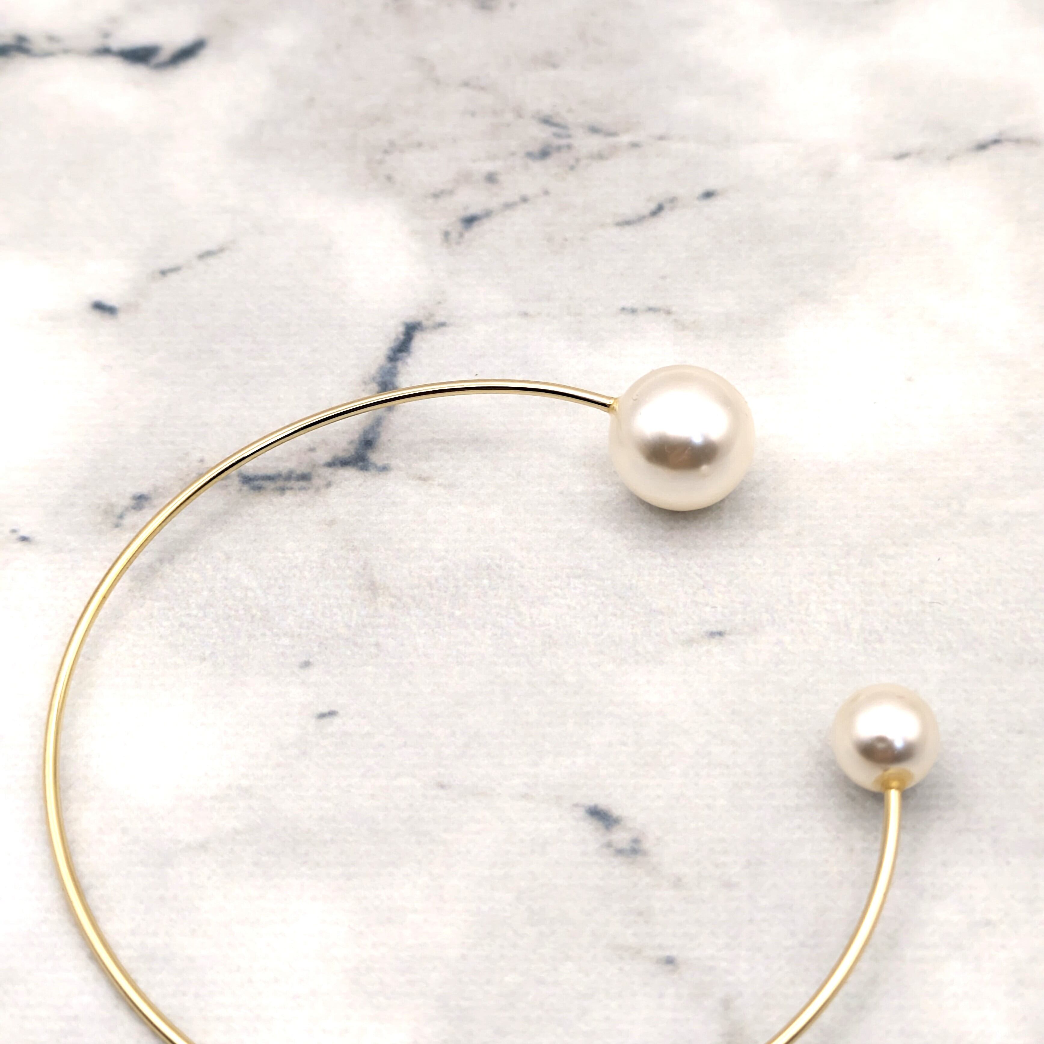 やわらかなゴールドのワイヤーに、小粒と大粒のパールがリズミカルに並ぶ、上品で印象的なブレスレット。