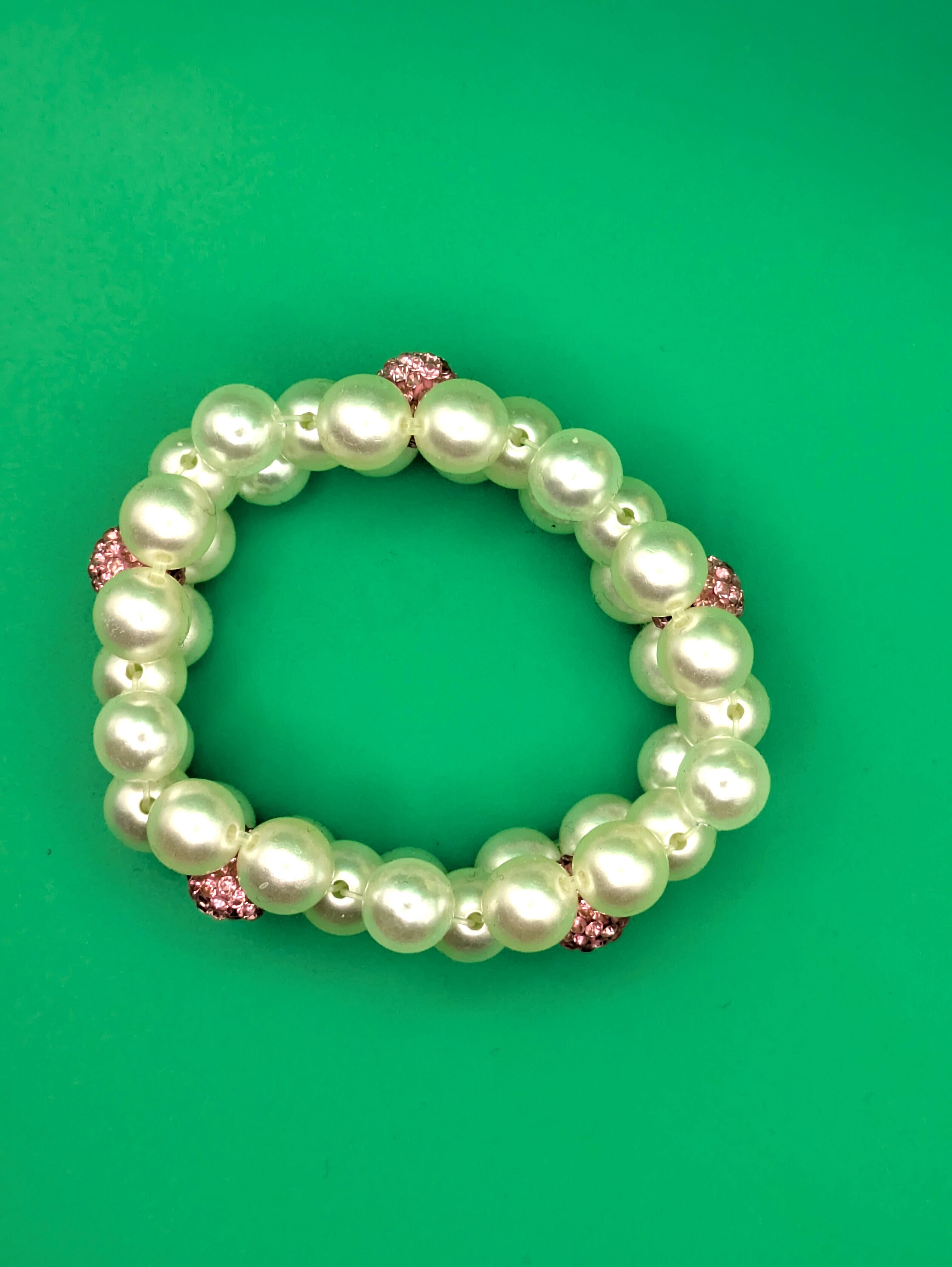 This handcrafted bracelet features soft pink rhinestone beads at the center of flower shapes made from 10mm pearl-style beads in off-white and white.