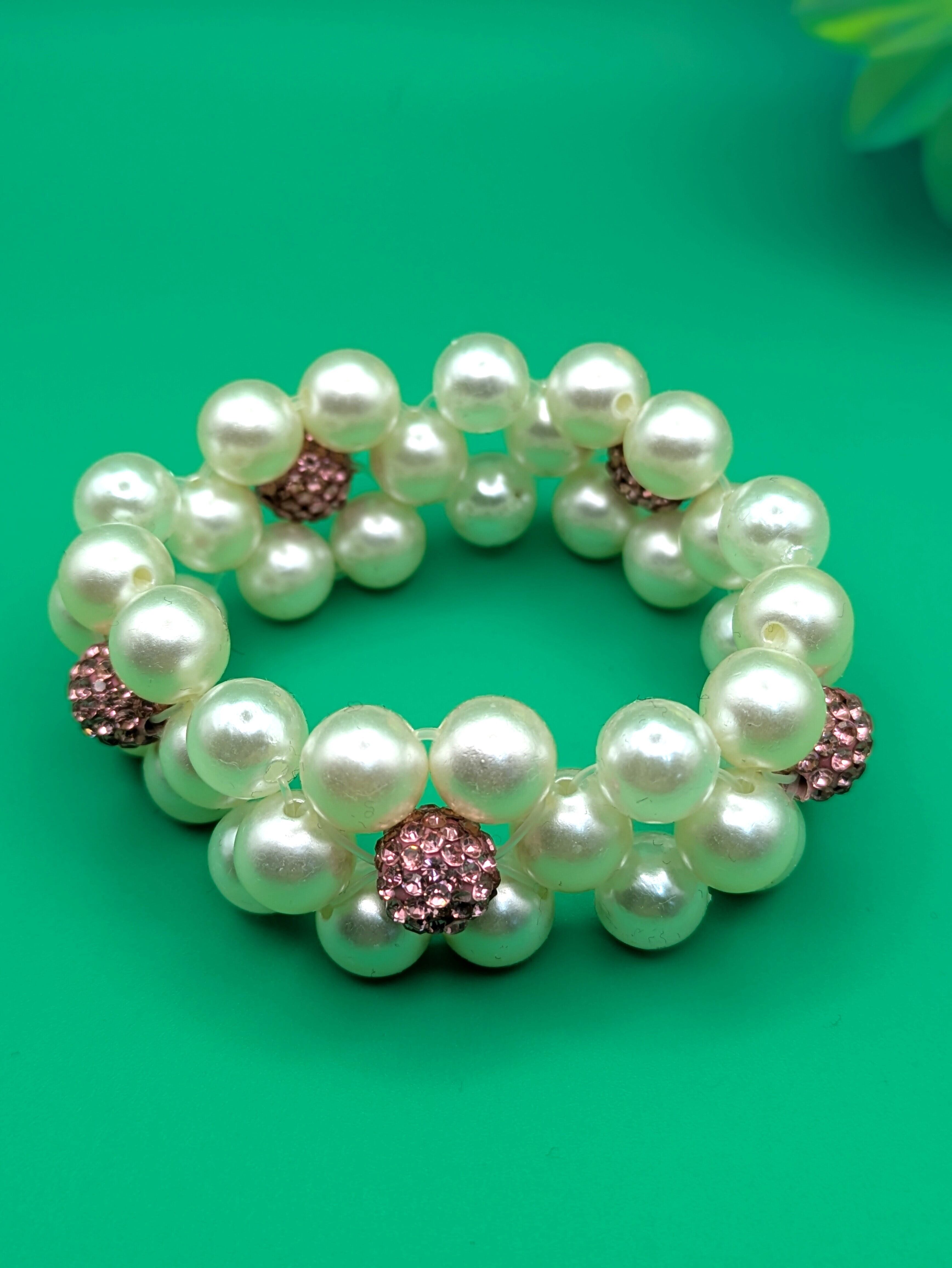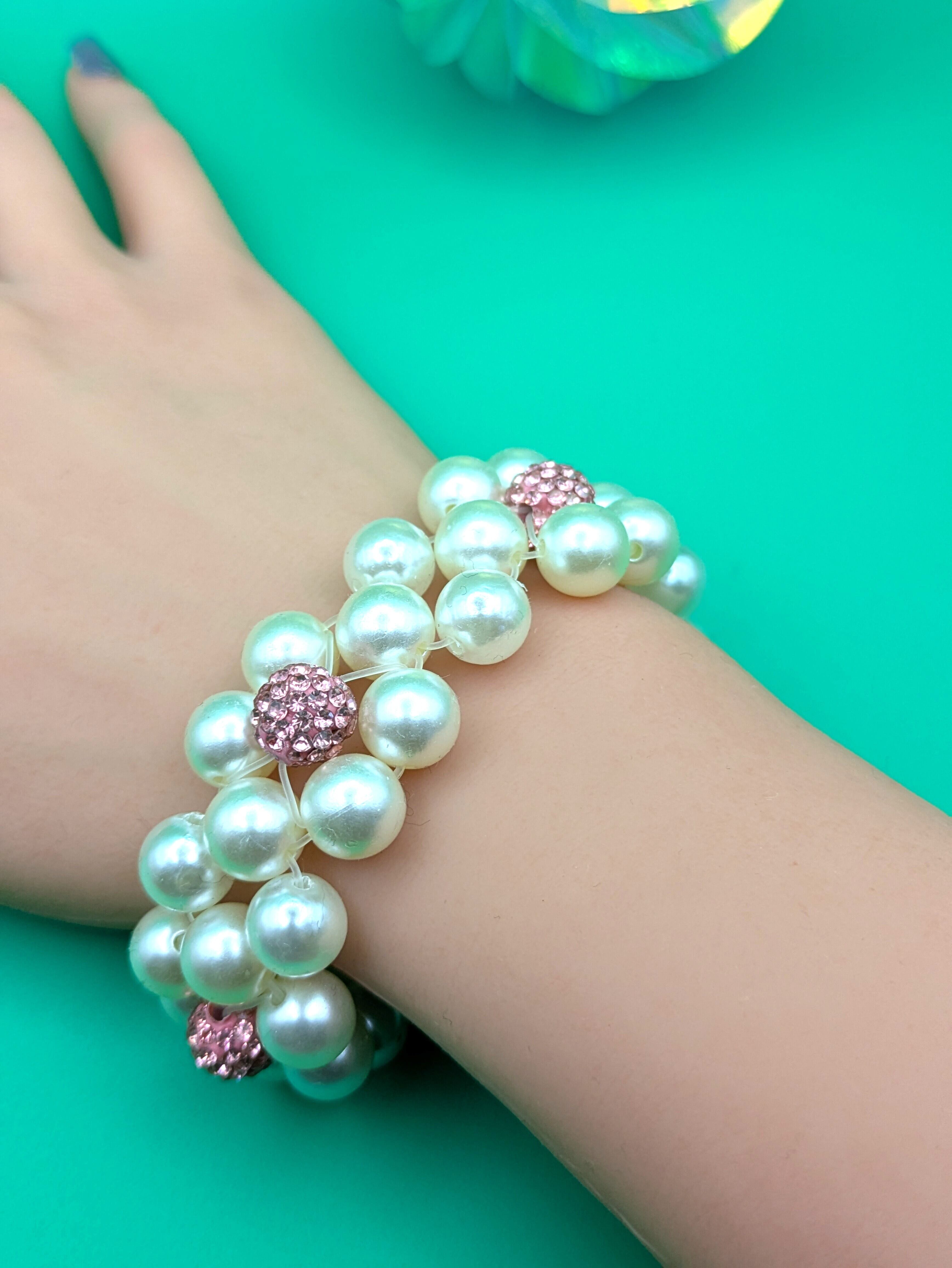 淡いピンクのラインストーンボールを中心に、オフホワイトとホワイトのパール風ビーズ(各10mm)で花のかたちを作り、その花々が連なるように配置された華やかなブレスレットです。