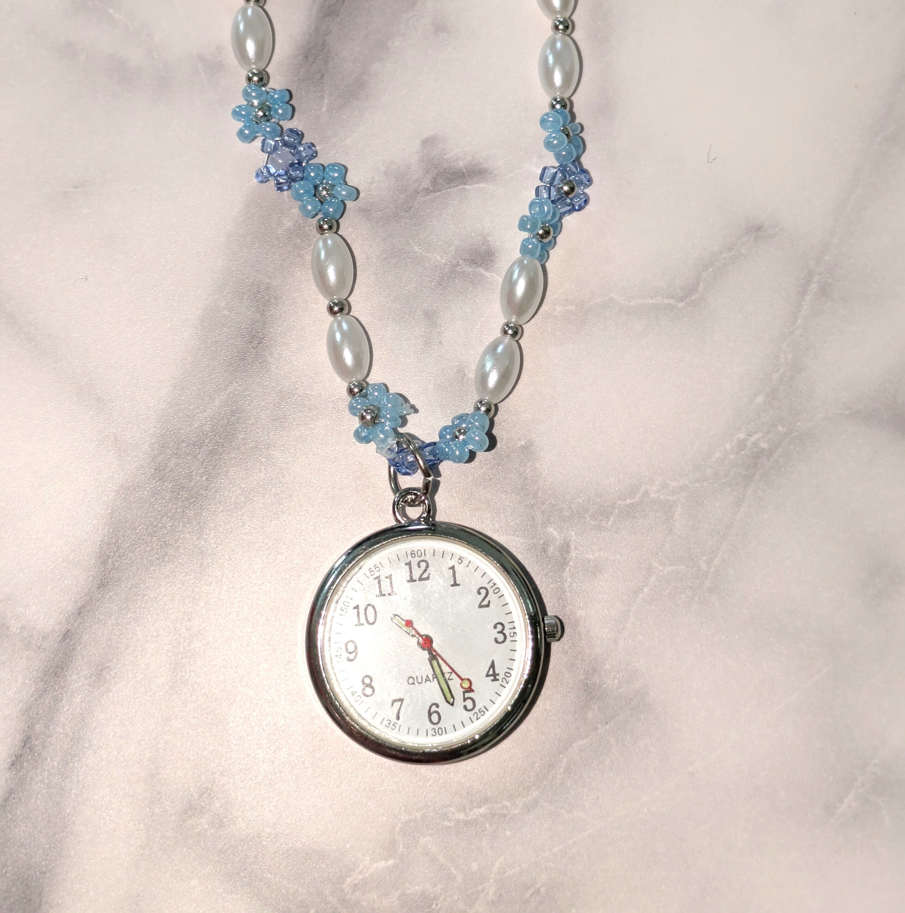 お花ビーズと時計チャームのネックレス|水色×ラベンダーの爽やかトーン Silver Clock Pendant Necklace with Beaded Flower Accents – Blue, Lavender & Clear | Scent Weaves Lab(セントウィーヴスラボ)