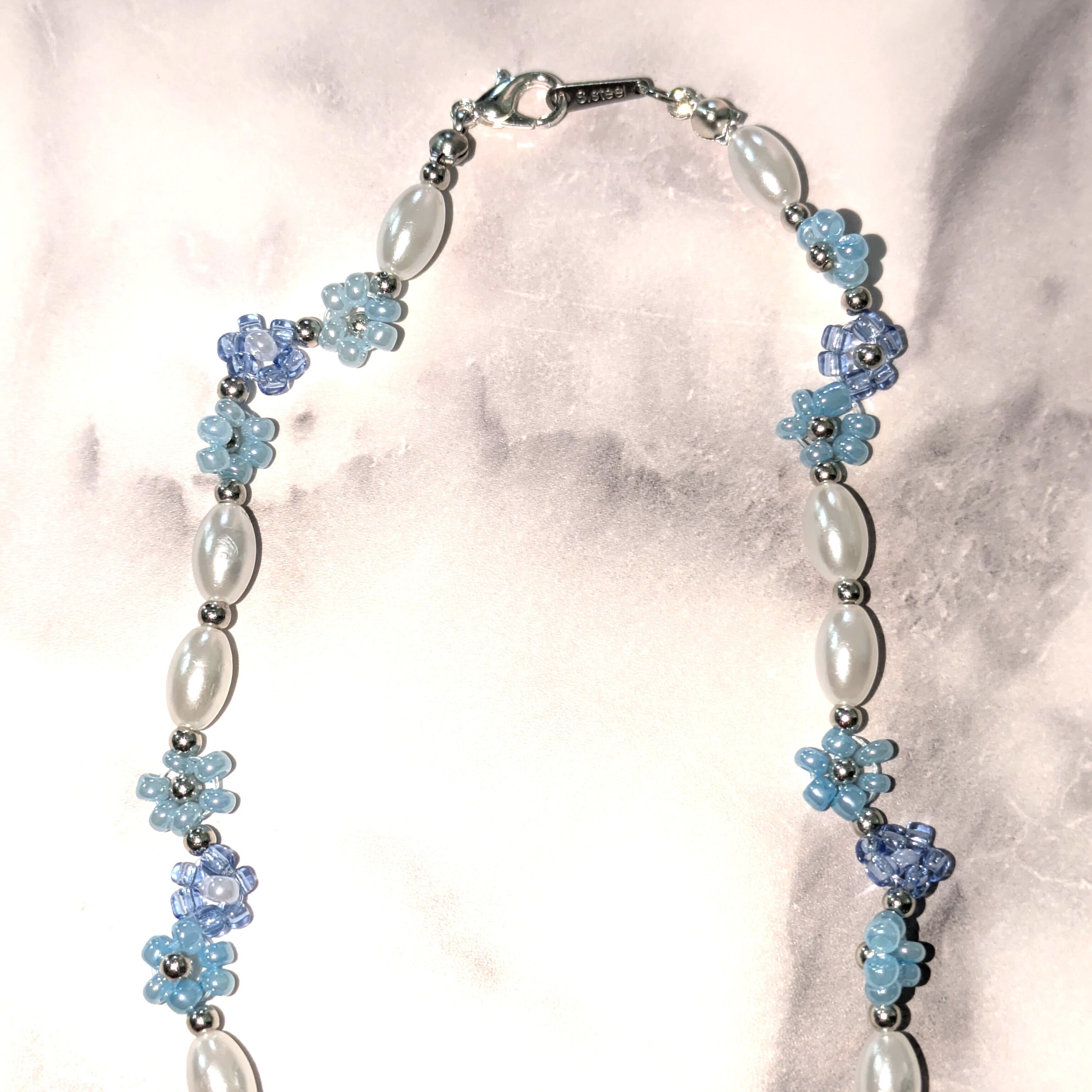 This handmade necklace features charming floral clusters created with delicate glass beads in soft blue and lavender tones.