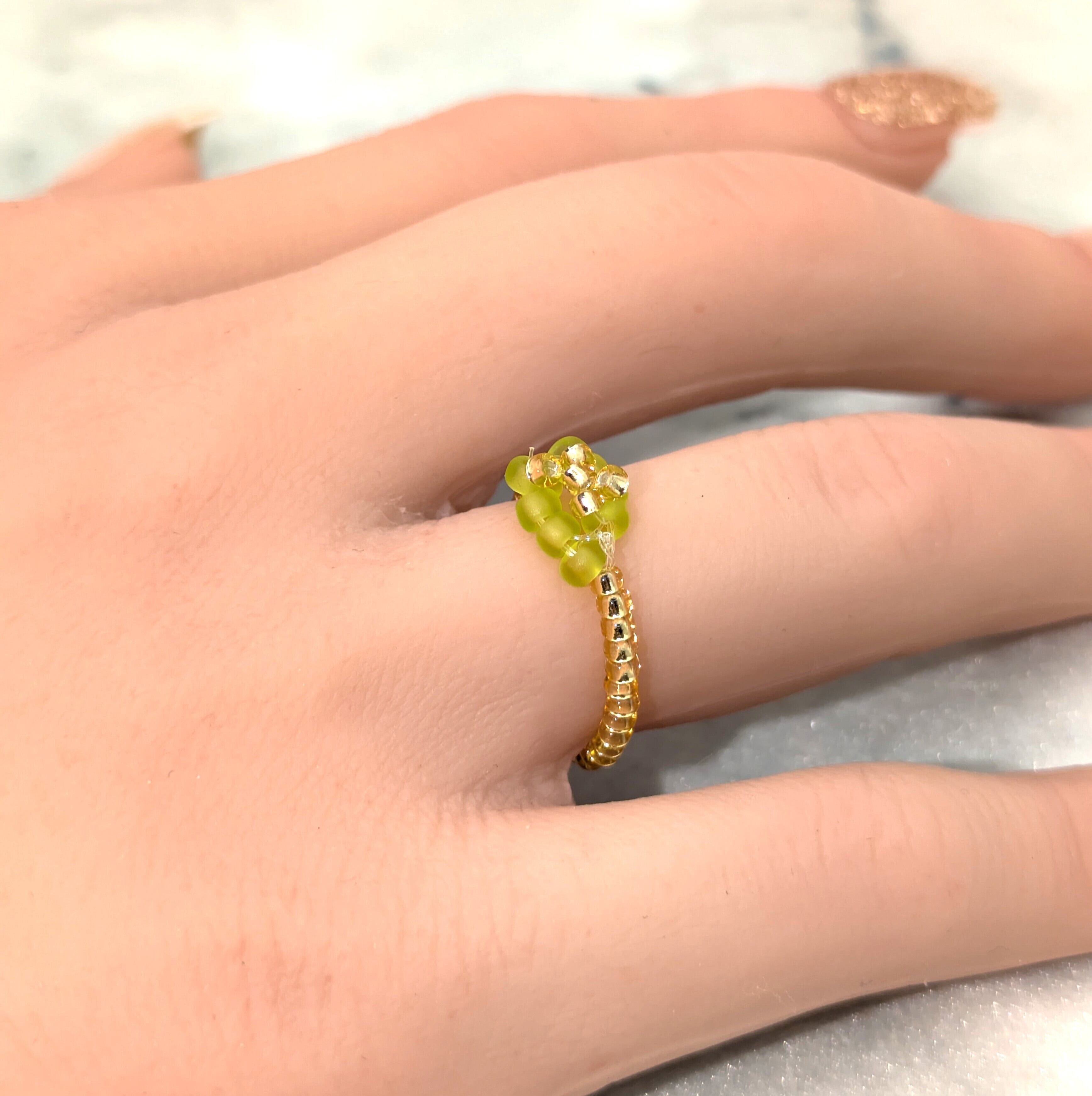 This handmade beaded ring features frosted peridot beads (3mm) paired with elegant 2mm gold beads for a fresh and delicate look.