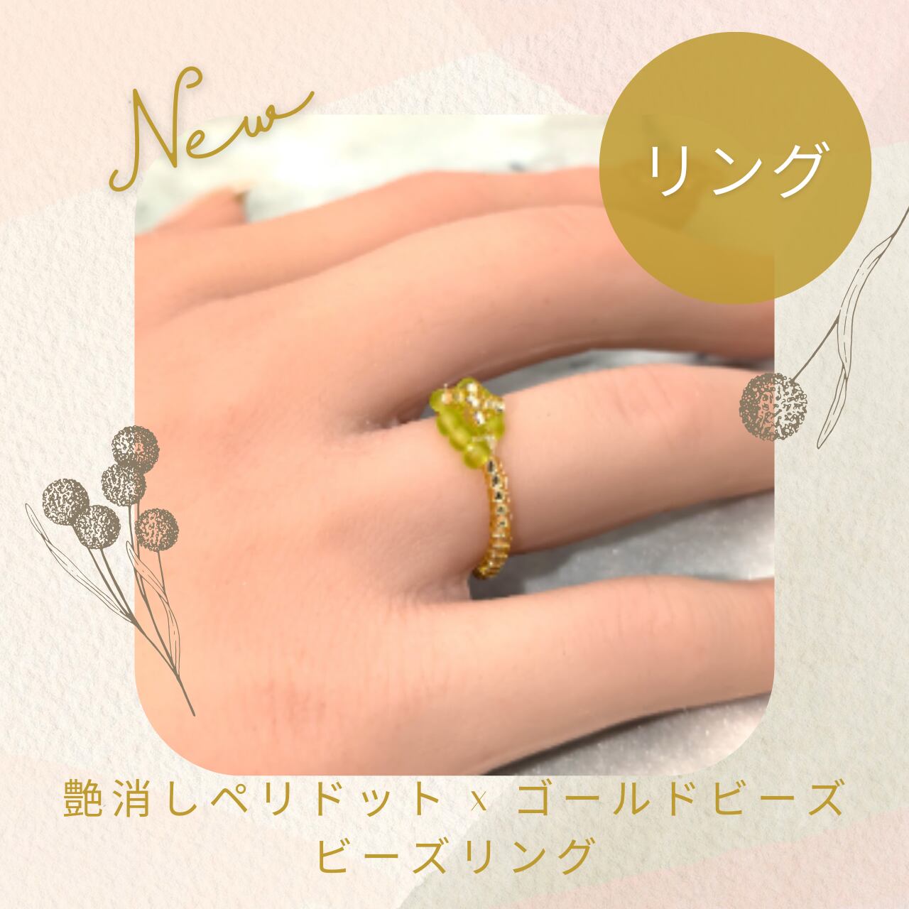 艶消しのペリドット3ミリビーズと、繊細な輝きを放つ2ミリのゴールドビーズを組み合わせた、軽やかな印象のビーズリングです。