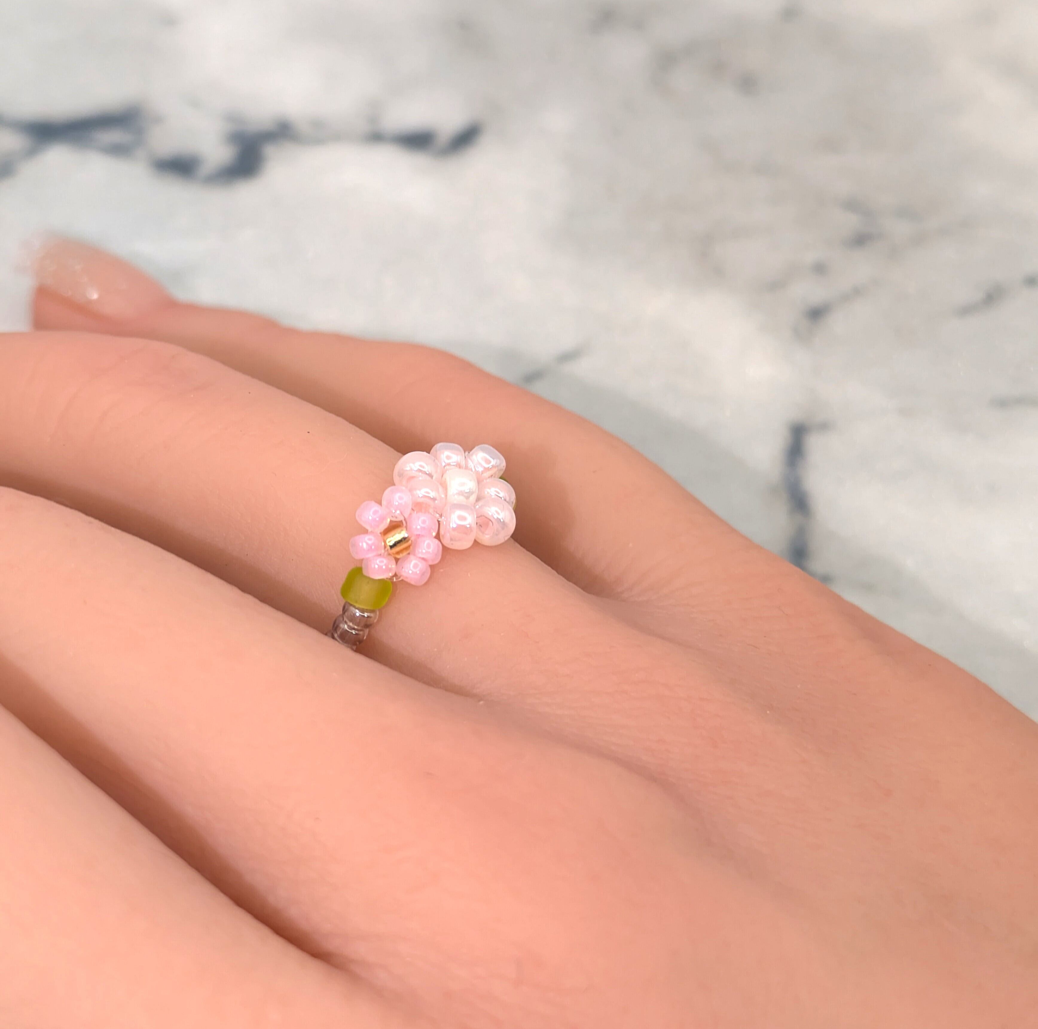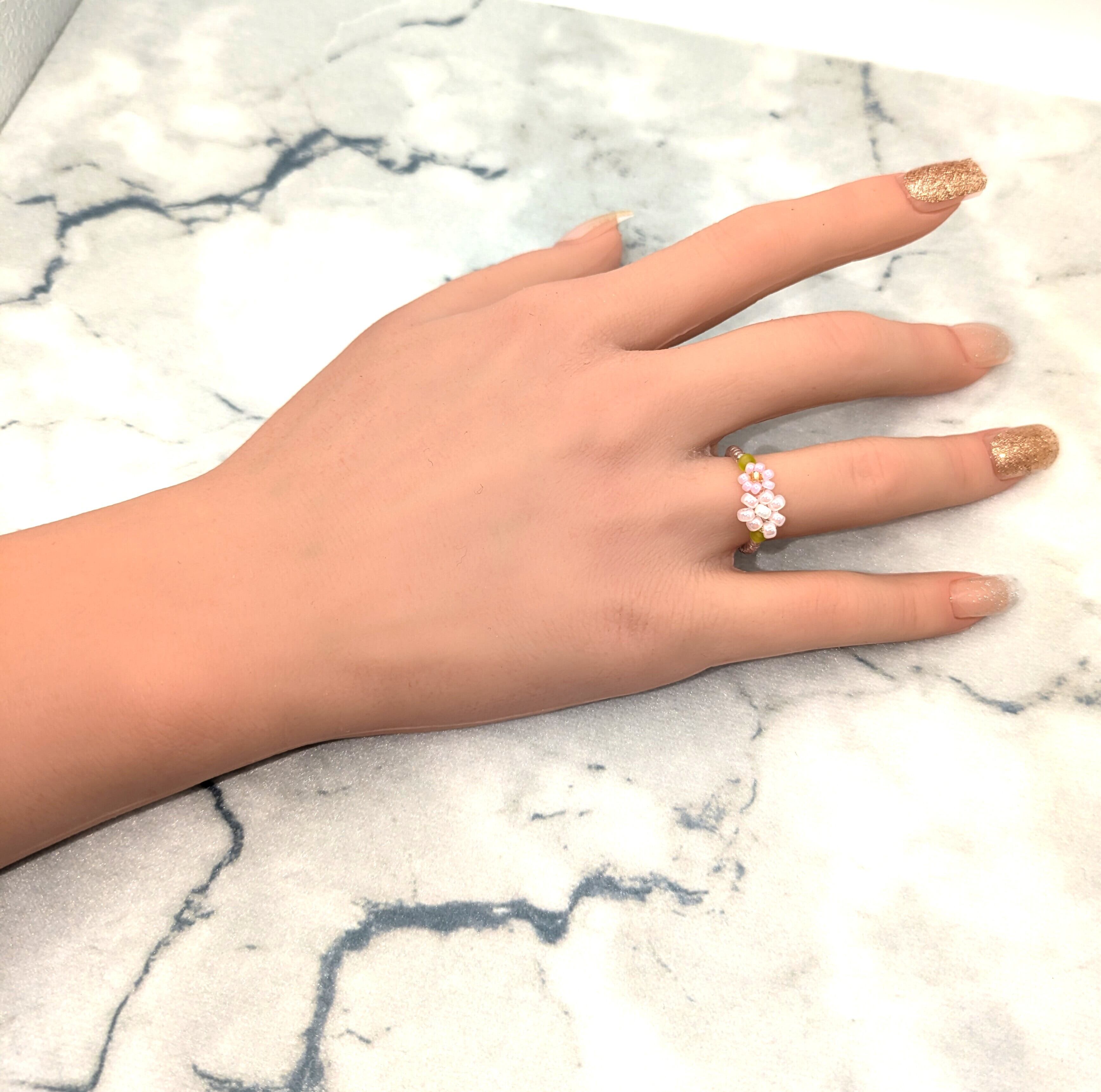 ふたつの花がそっと寄り添う、やさしい輝きのビーズリング。