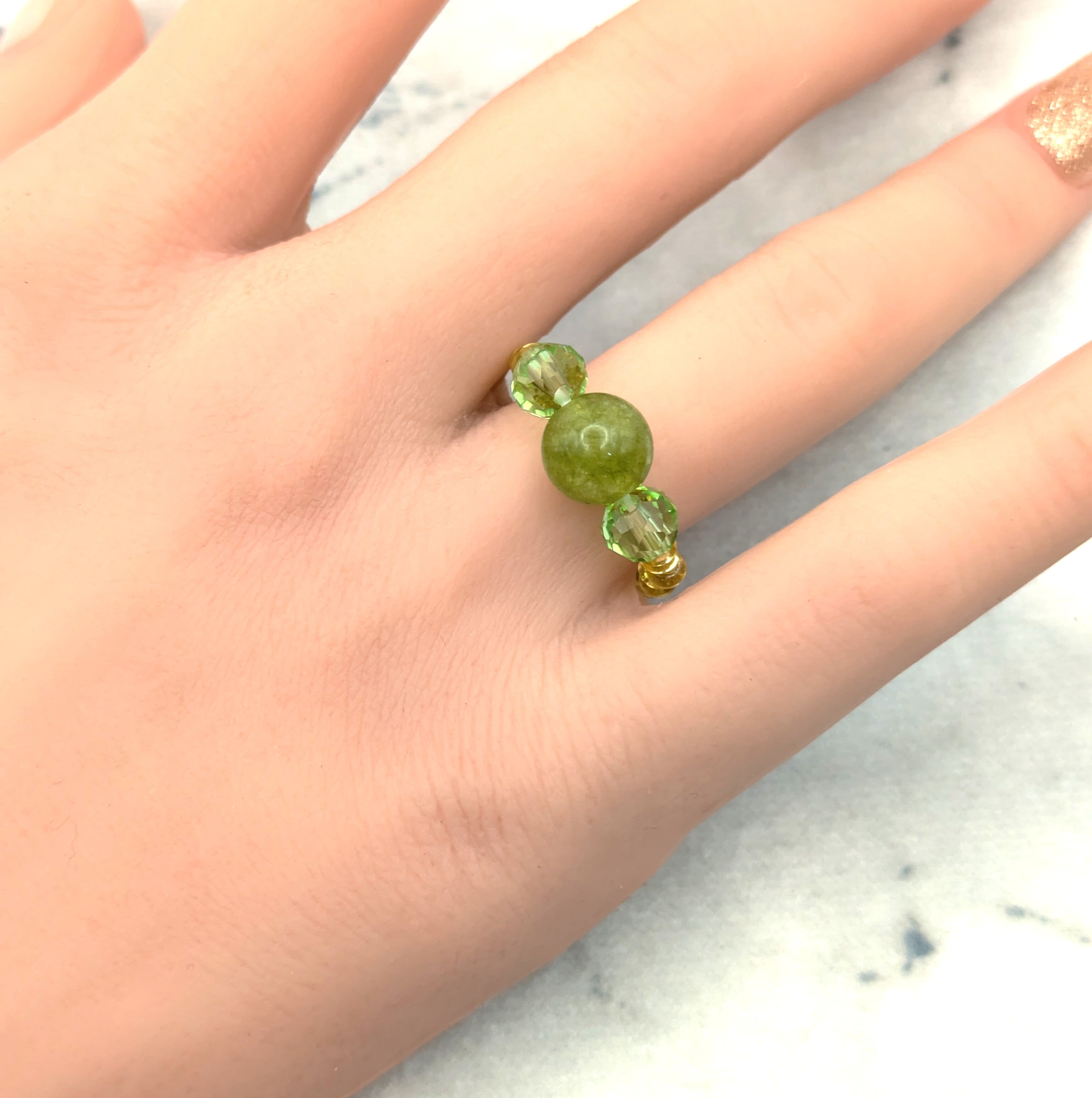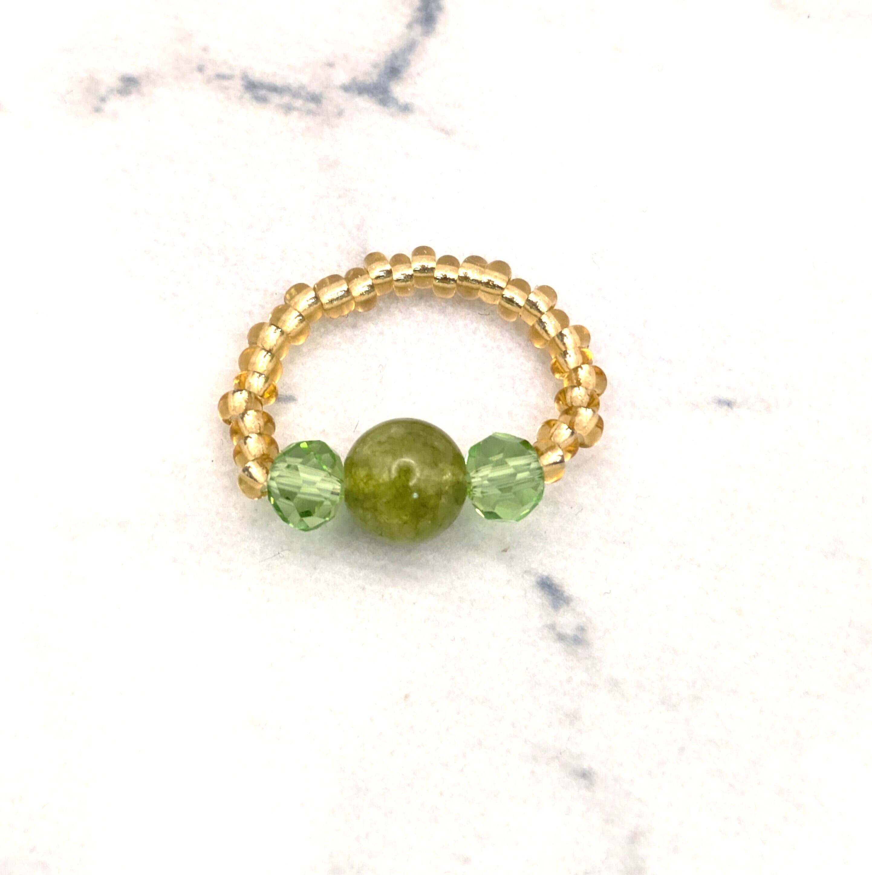 Flanked by pale green cut glass beads and finished with golden glass beads along the stretch band, this ring glows with understated elegance.