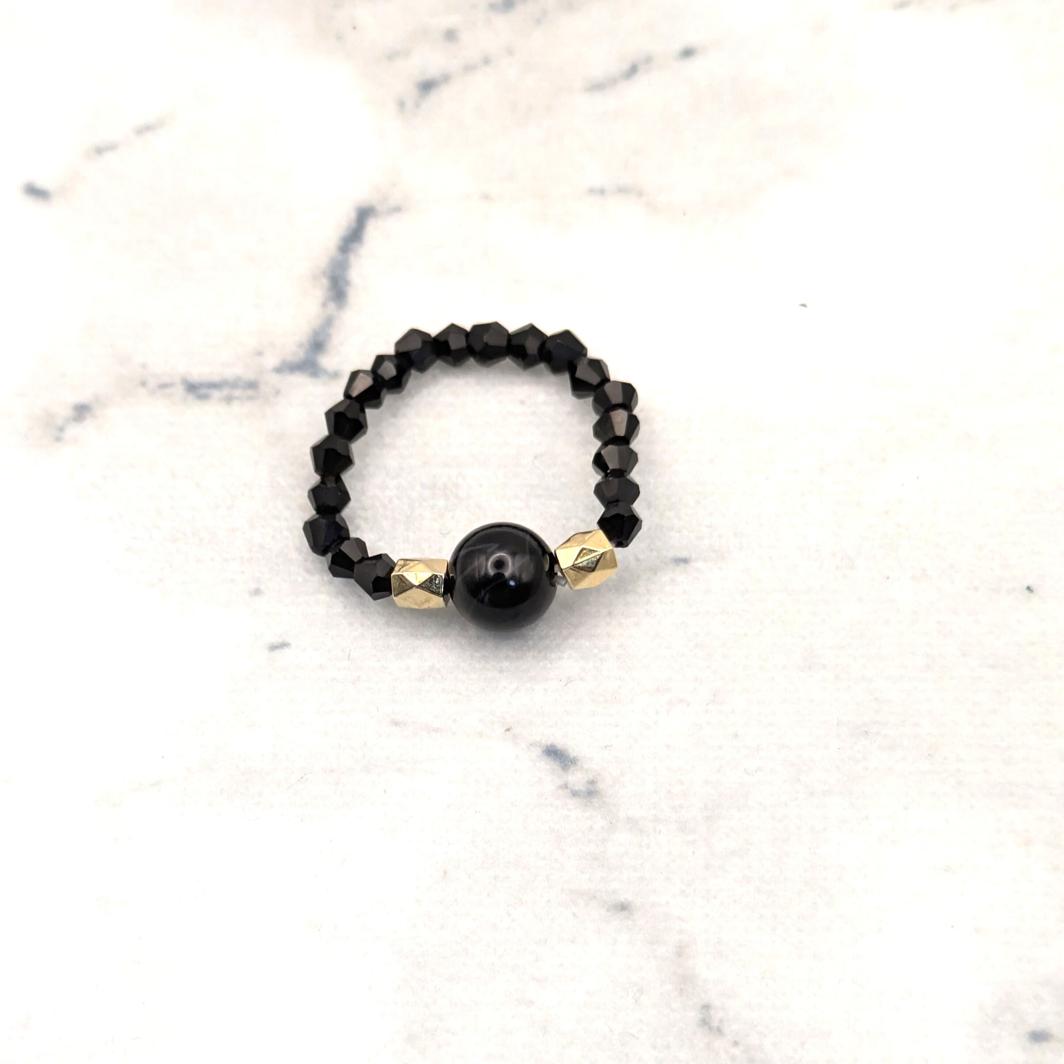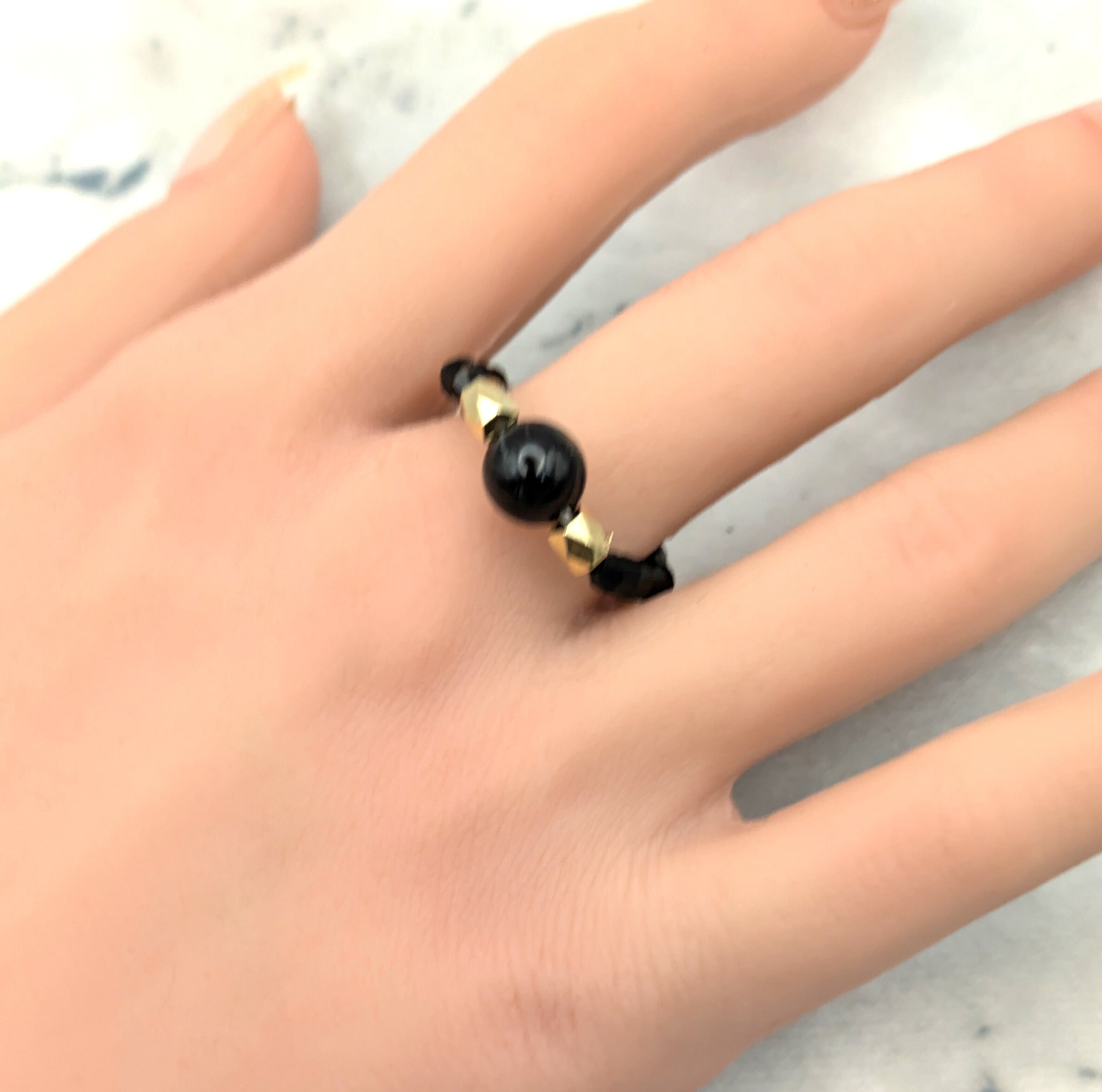 「夜の守り石」ブラックオニキスとカットビーズのフリーサイズリング(約18号〜)"Guardian of the Night" – Black Onyx & Crystal Beaded Ring (Free Size from JP 18) | Scent Weaves Lab(セントウィーヴスラボ)