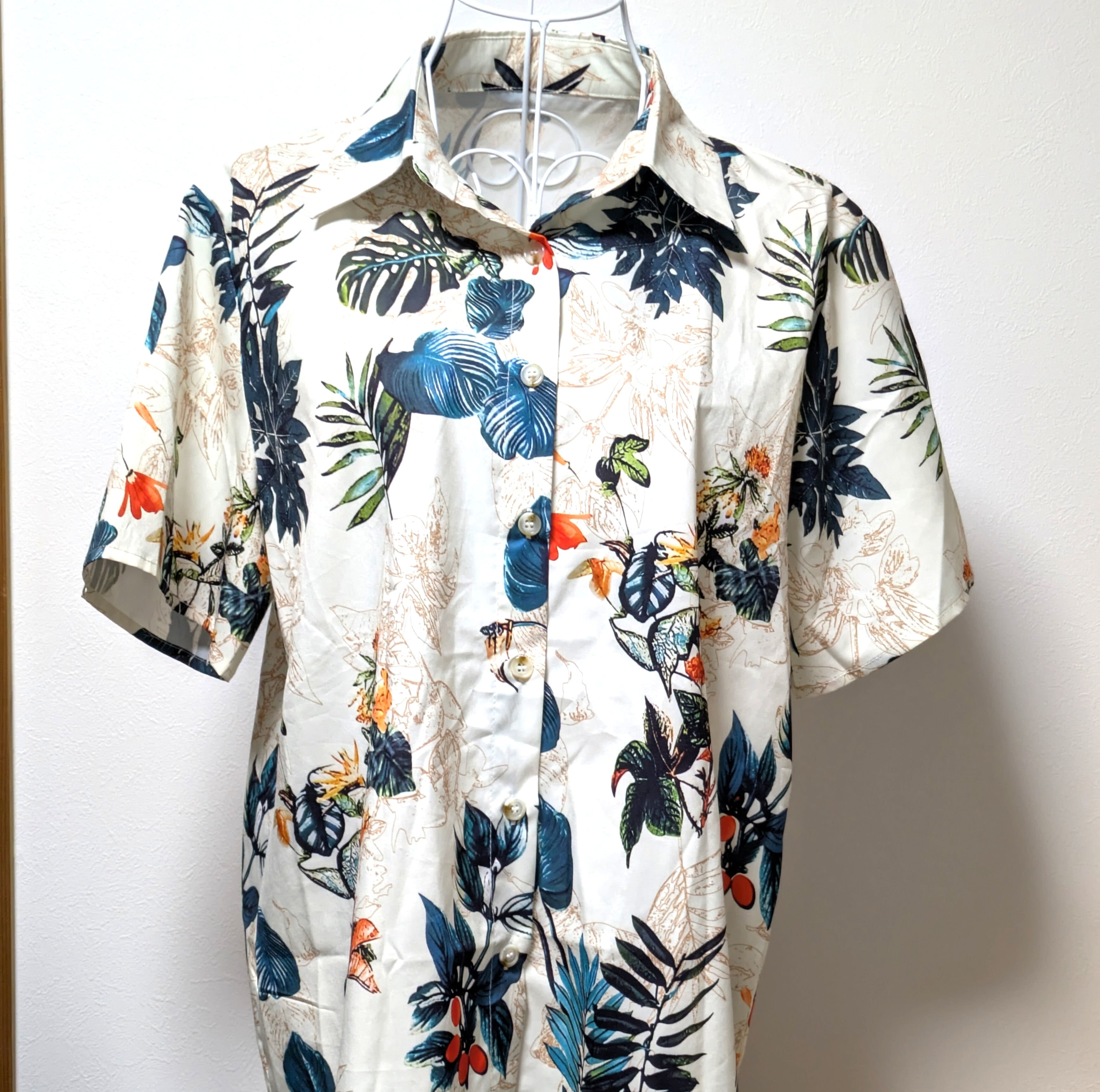 リゾート感あふれる、**南国ボタニカル柄の半袖シャツ(レディースXL)**です