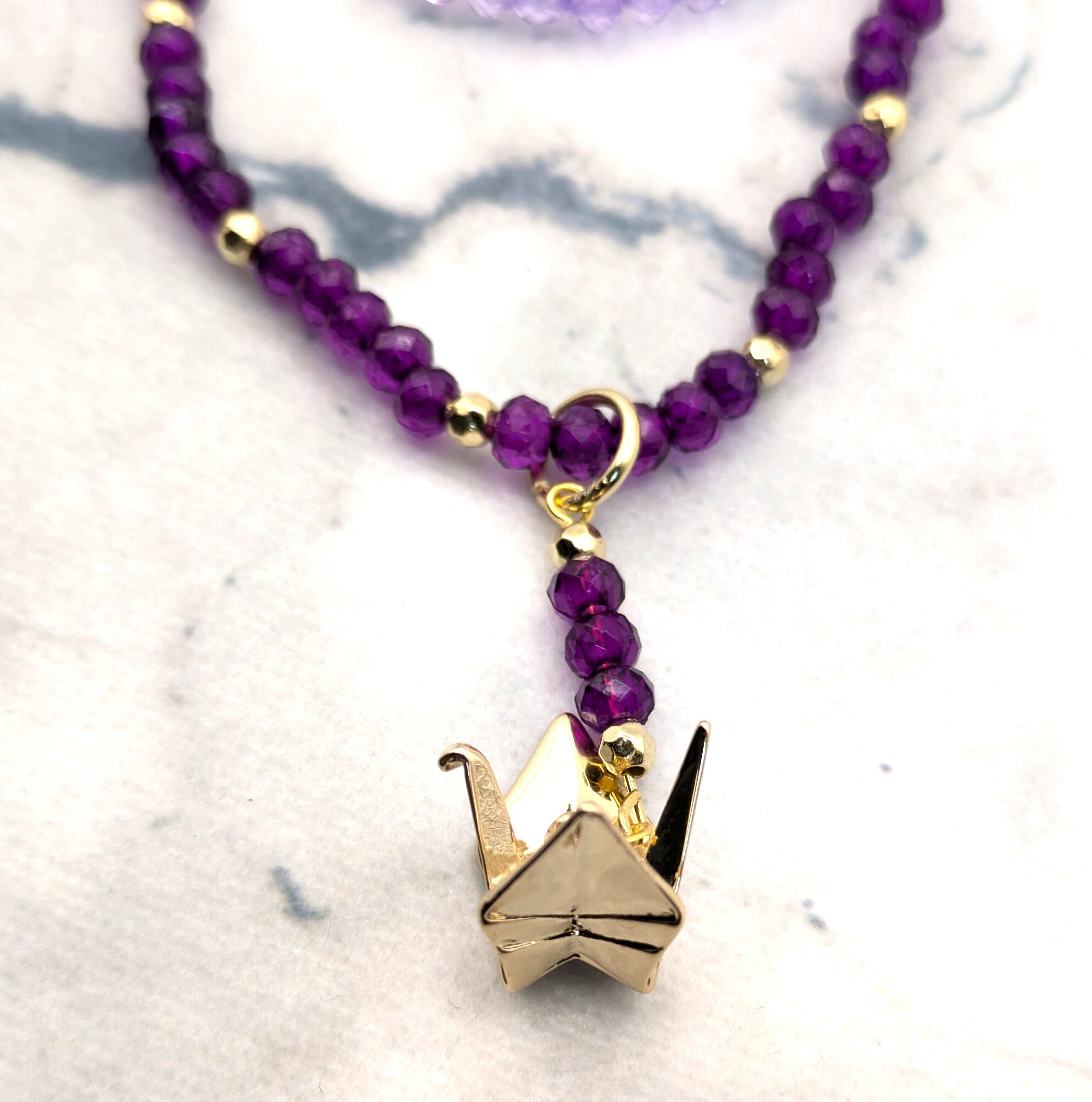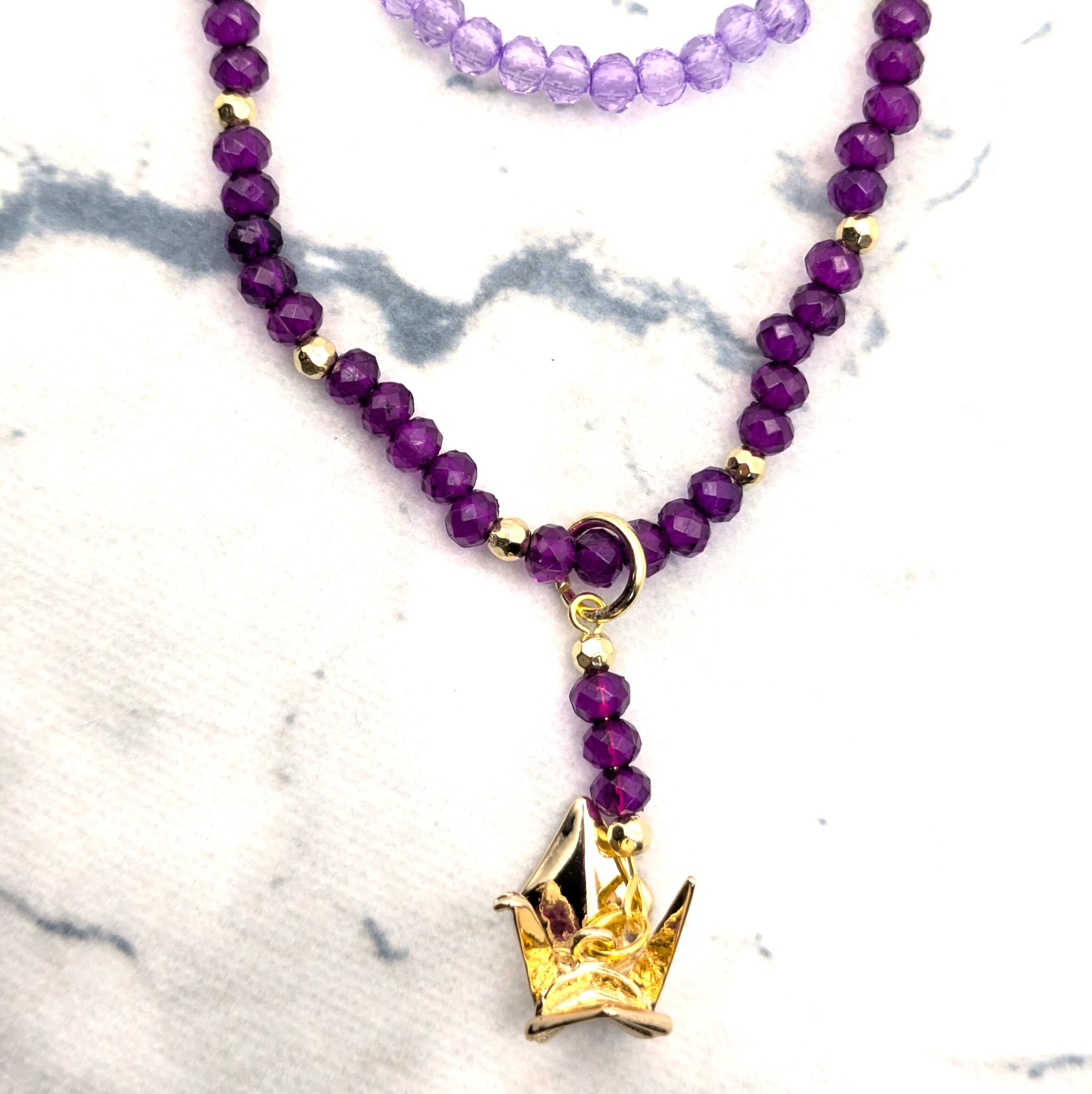 A beautiful handmade double-strand necklace combining soft lavender and deep purple acrylic beads, featuring an elegant origami crane charm