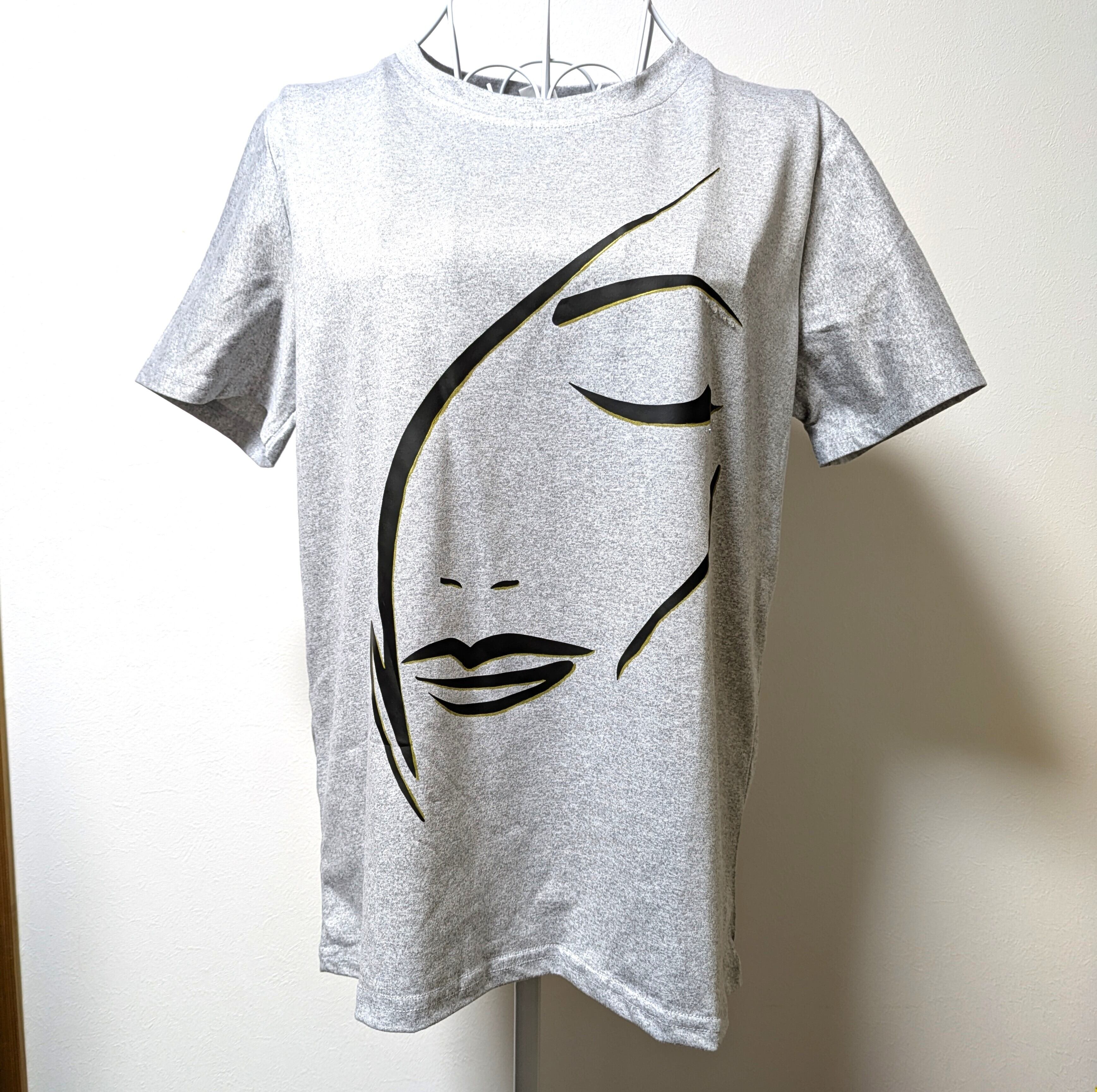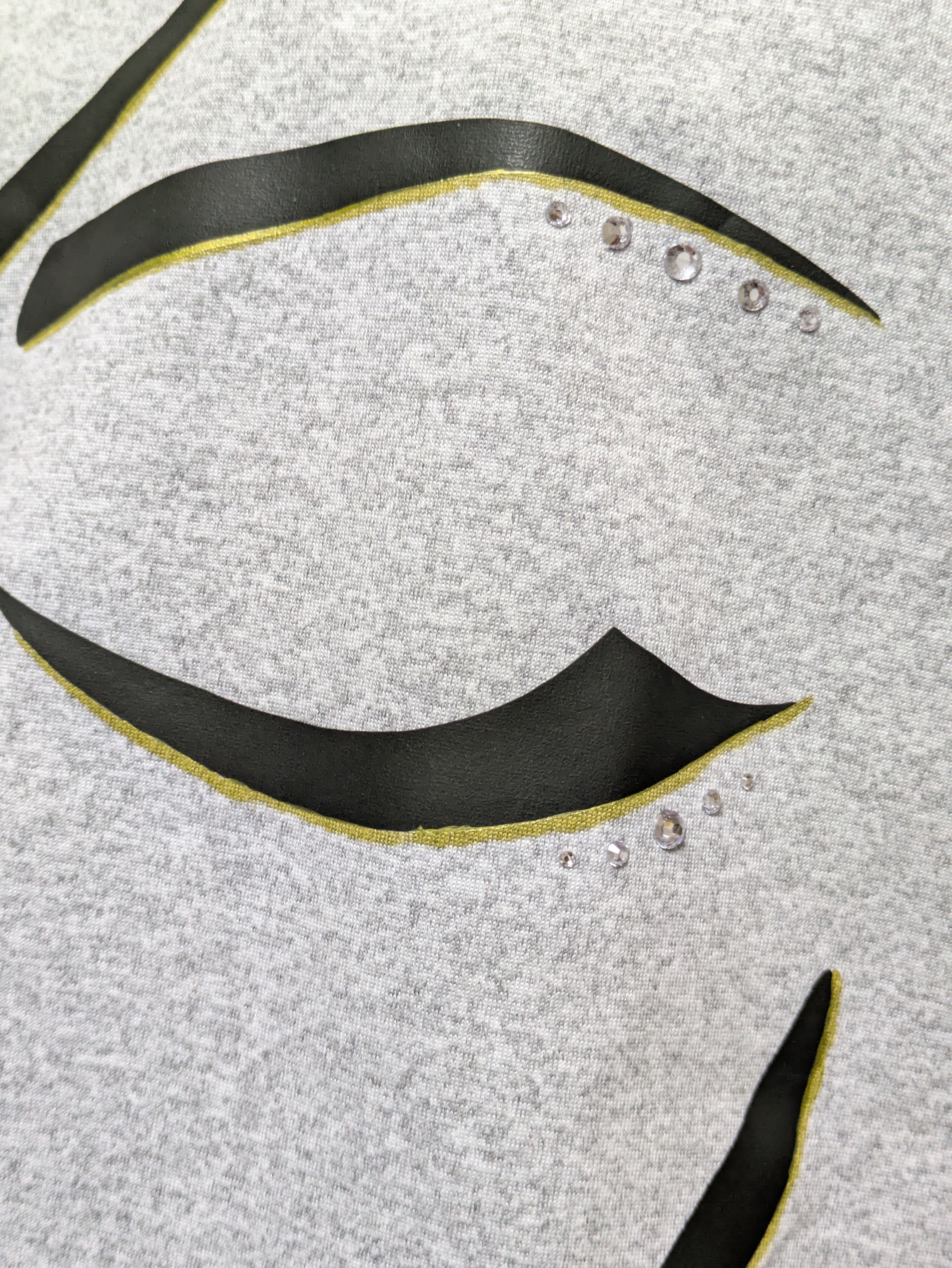 クールなフェイスラインをゴールドでなぞり、目元と眉元にシルバーラインストーンをあしらったリメイクTシャツです。