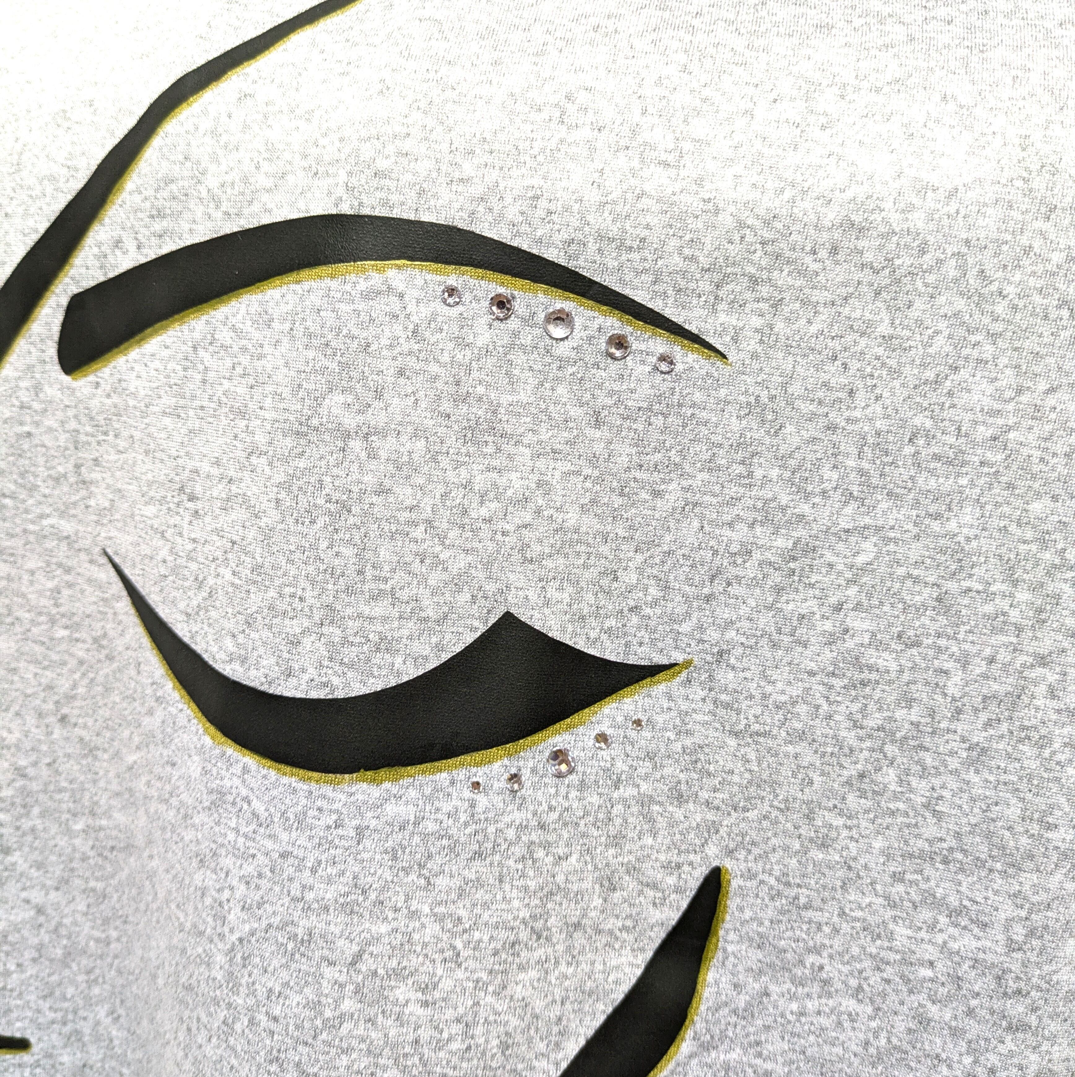This remake T-shirt features a sleek face line traced in gold and decorated with silver rhinestones around the eyes and eyebrows.