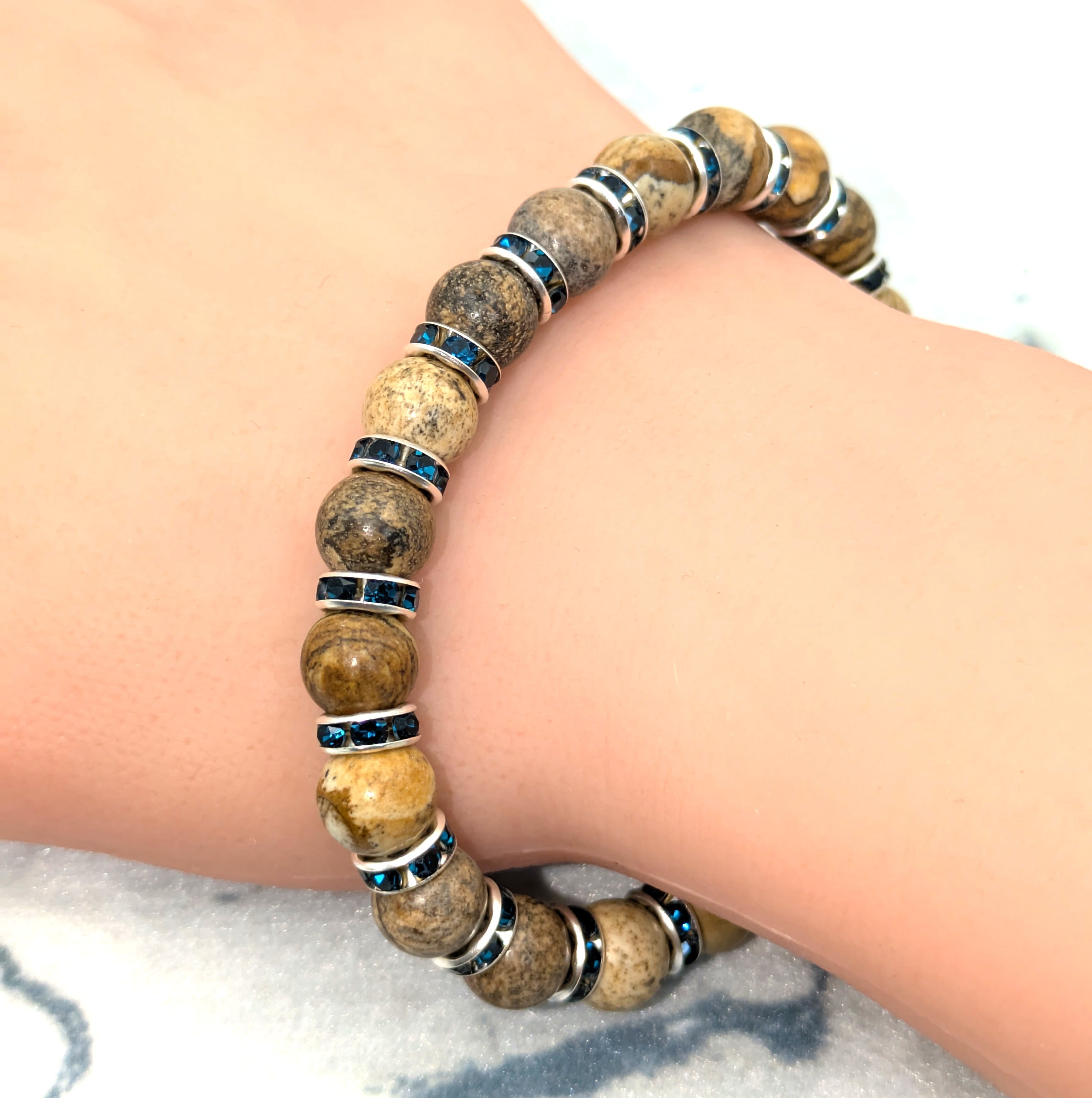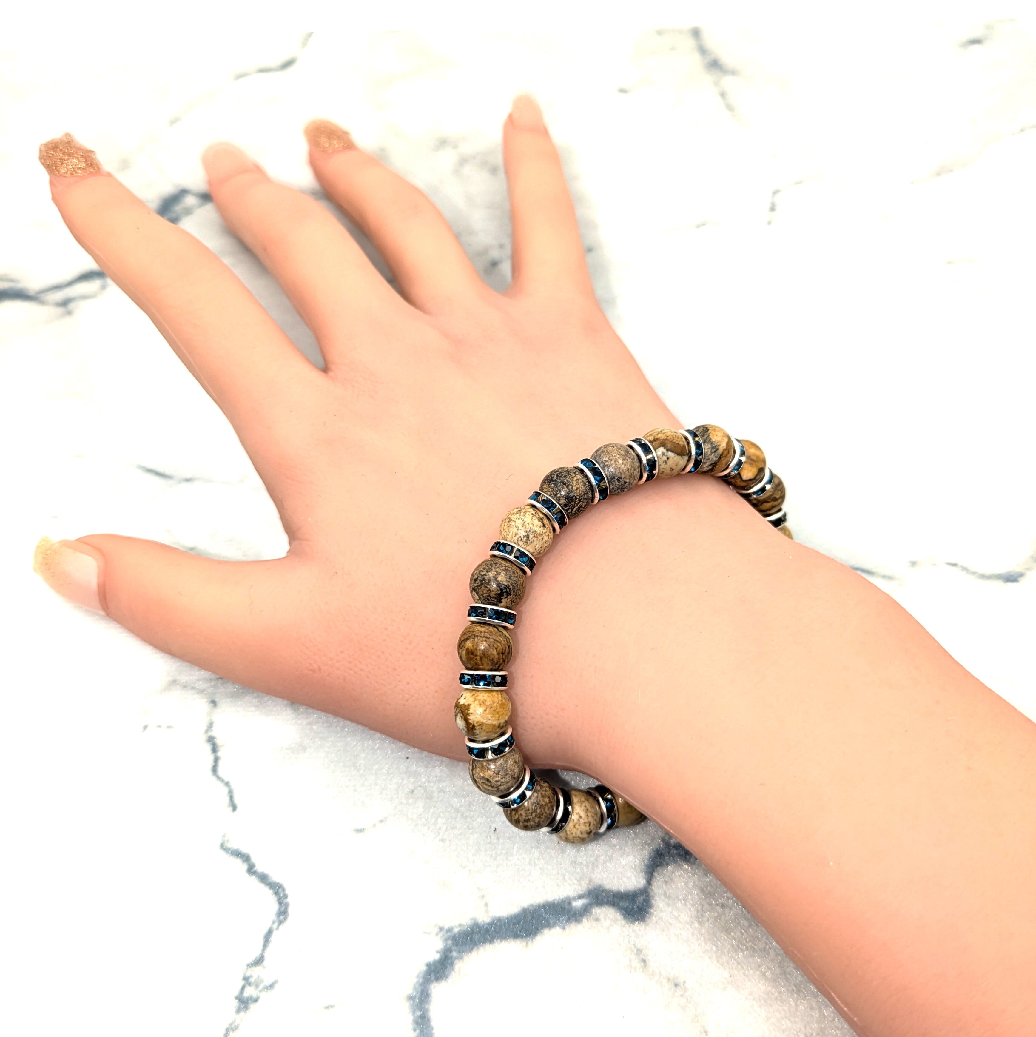 《ブレスレッド 約18cm》 大地のぬくもりを感じる、ナチュラルブラウンのストーンブレスレット。ブルーのラインストーンがアクセントになり、落ち着いた中に個性が光ります。 | Scent Weaves Lab(セントウィーヴスラボ)