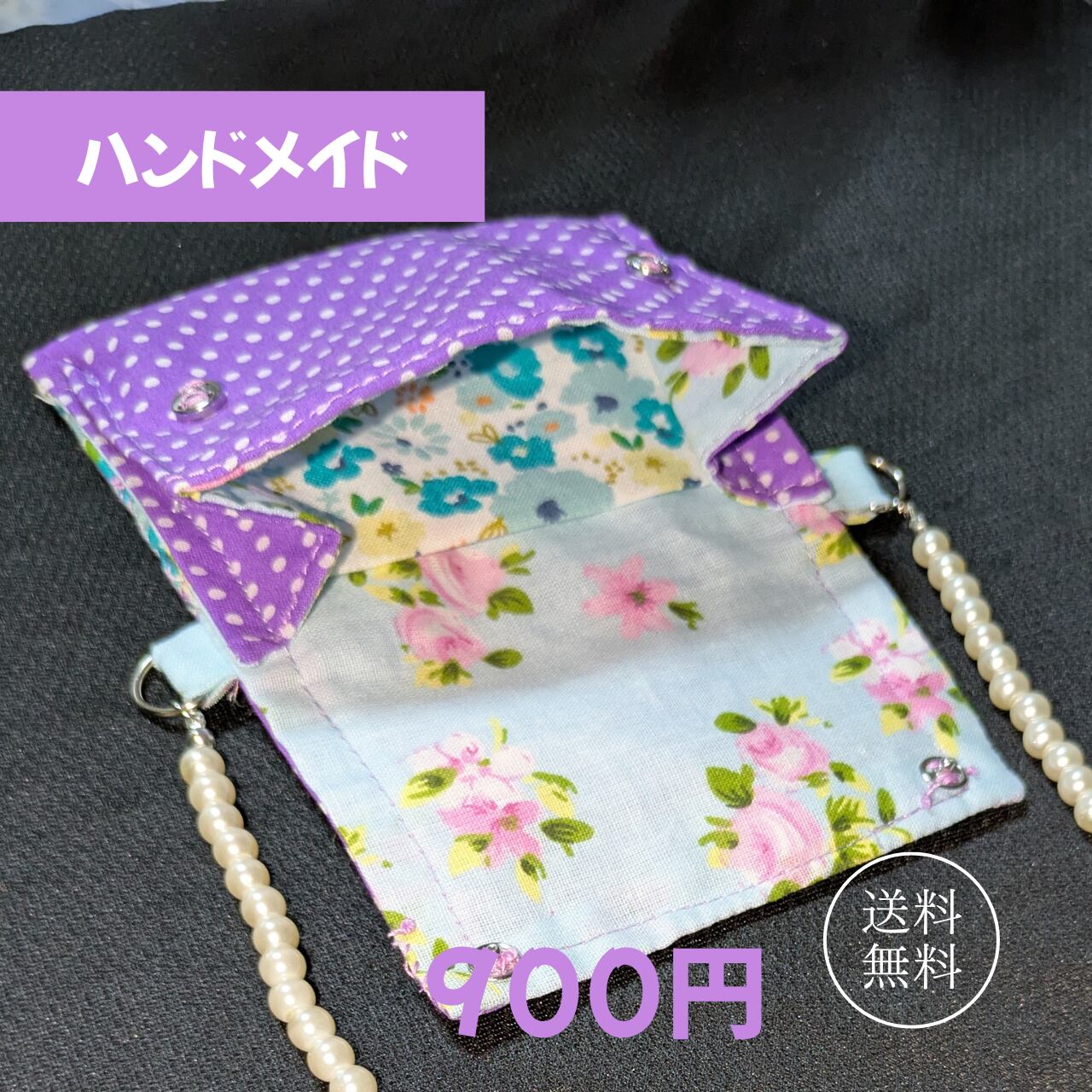 外側は紫に白のドット柄、内布には花柄をあしらっており、開けた瞬間にもときめきを感じられるデザインに仕上げました。