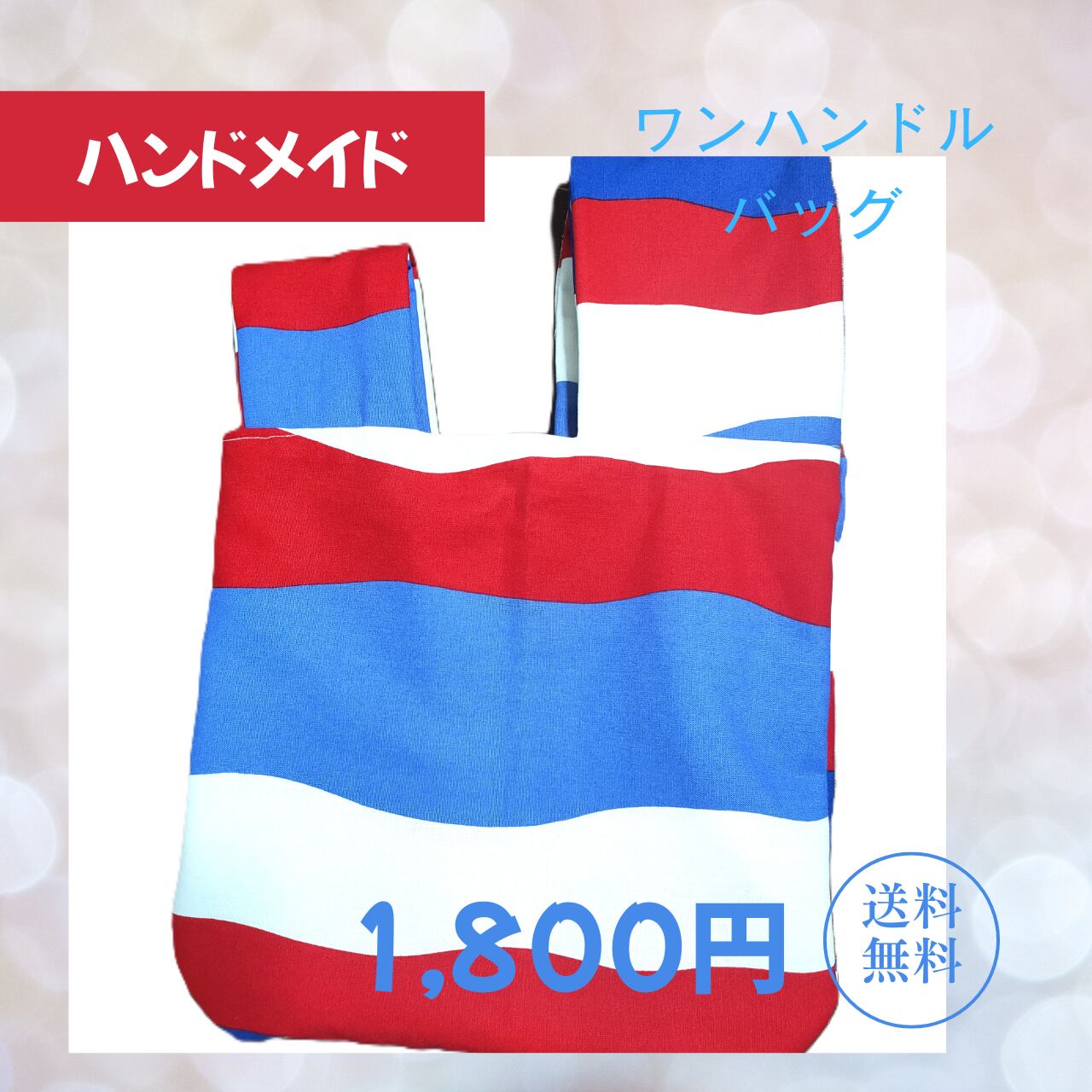赤・青・白のストライプが目を引く、ハンドメイドのワンハンドル手提げバッグです。