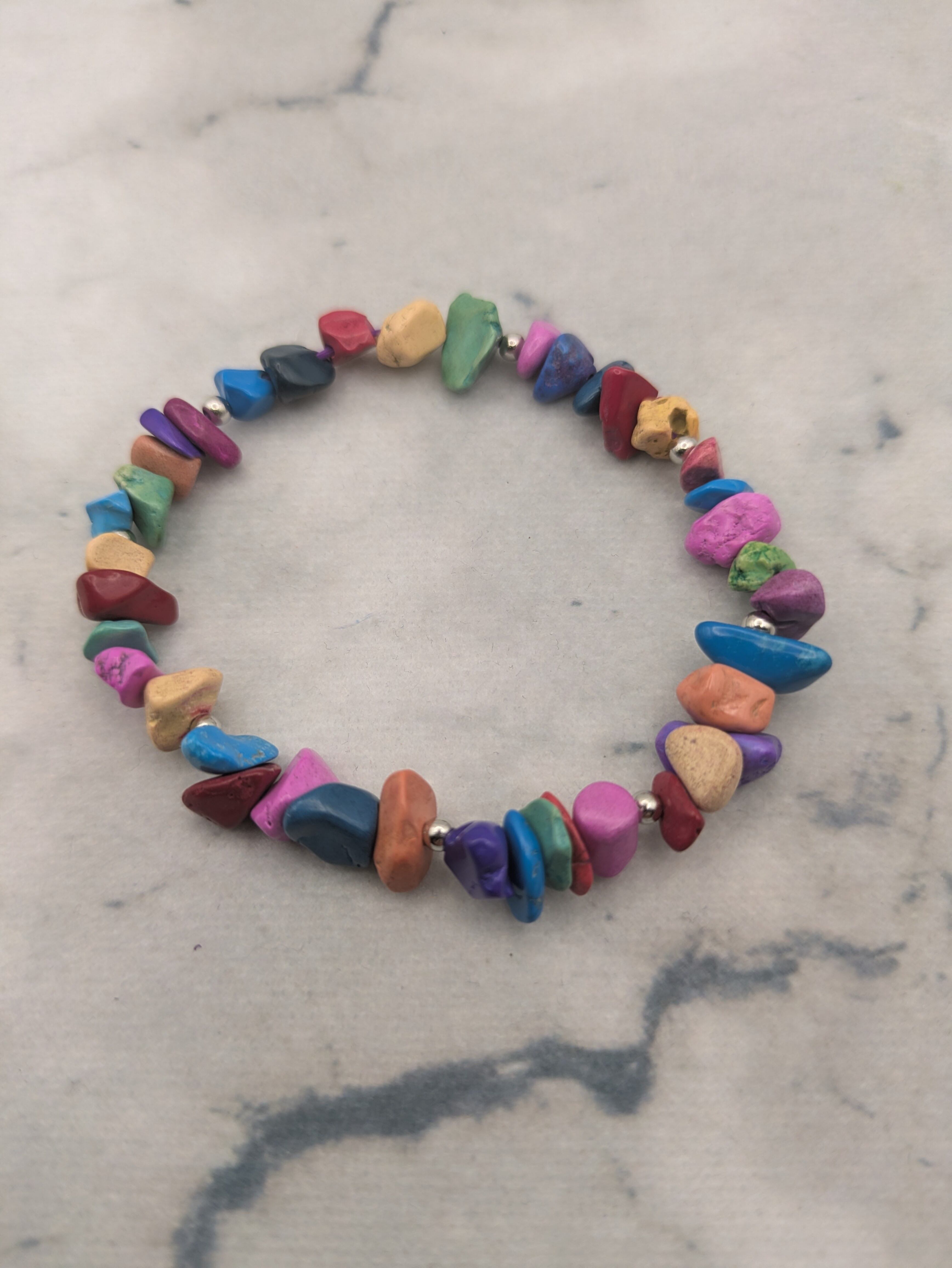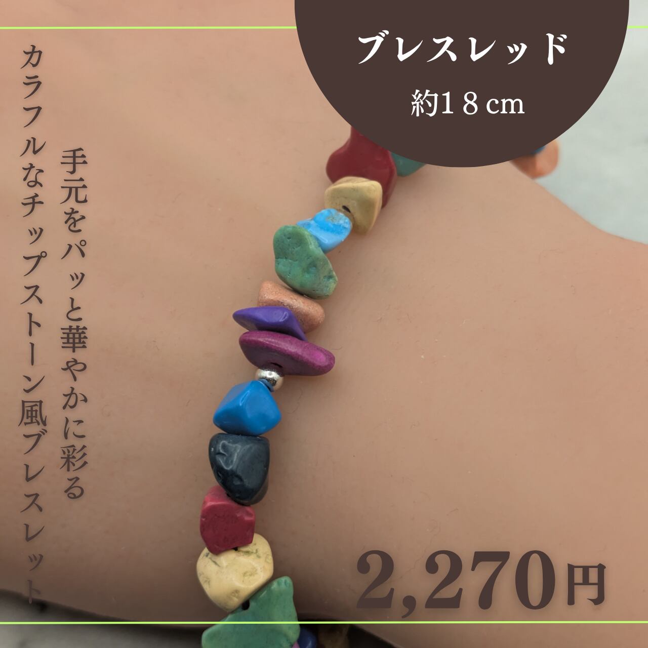 手元をパッと華やかに彩る、カラフルなチップストーン風ブレスレットです。