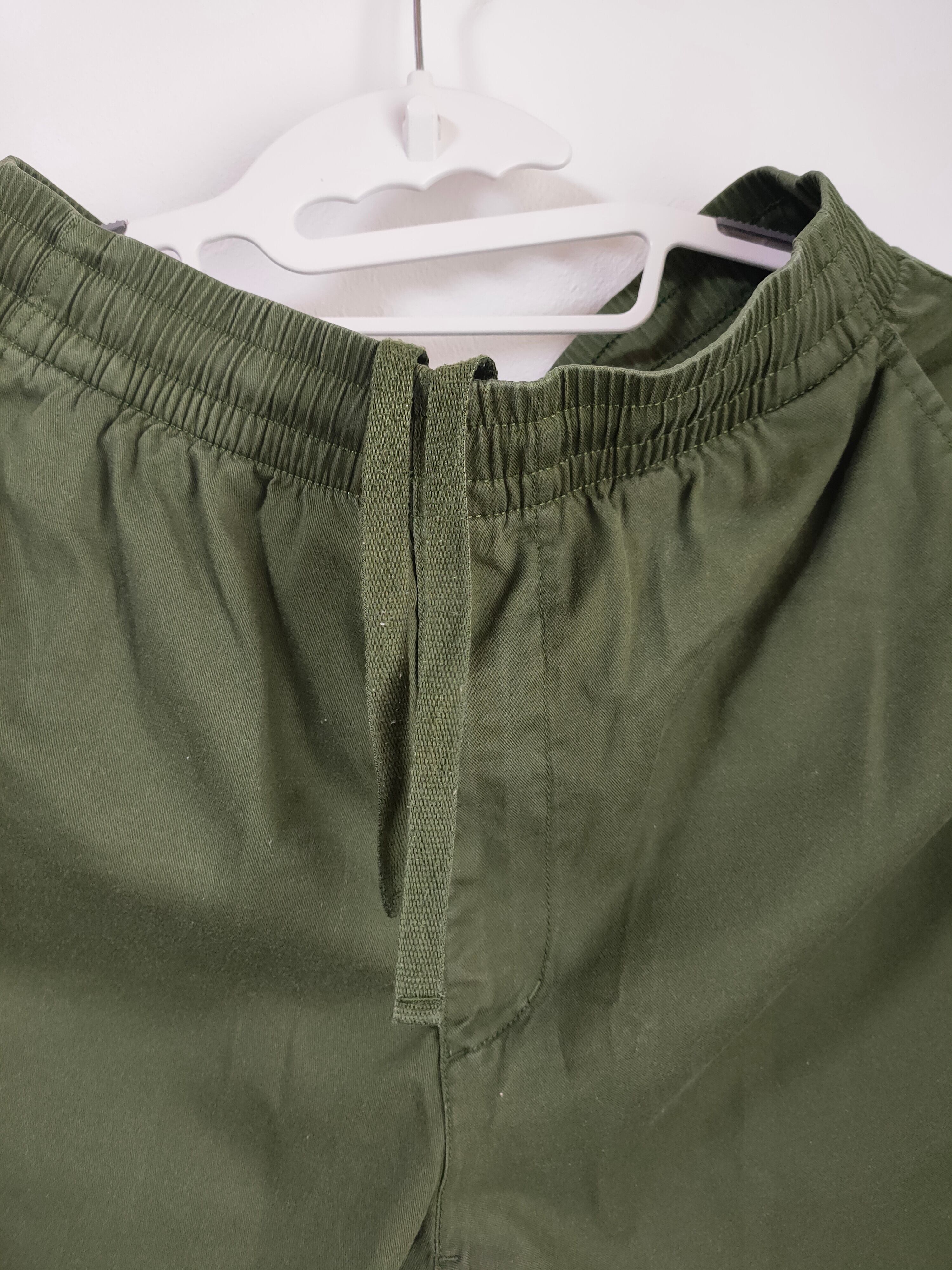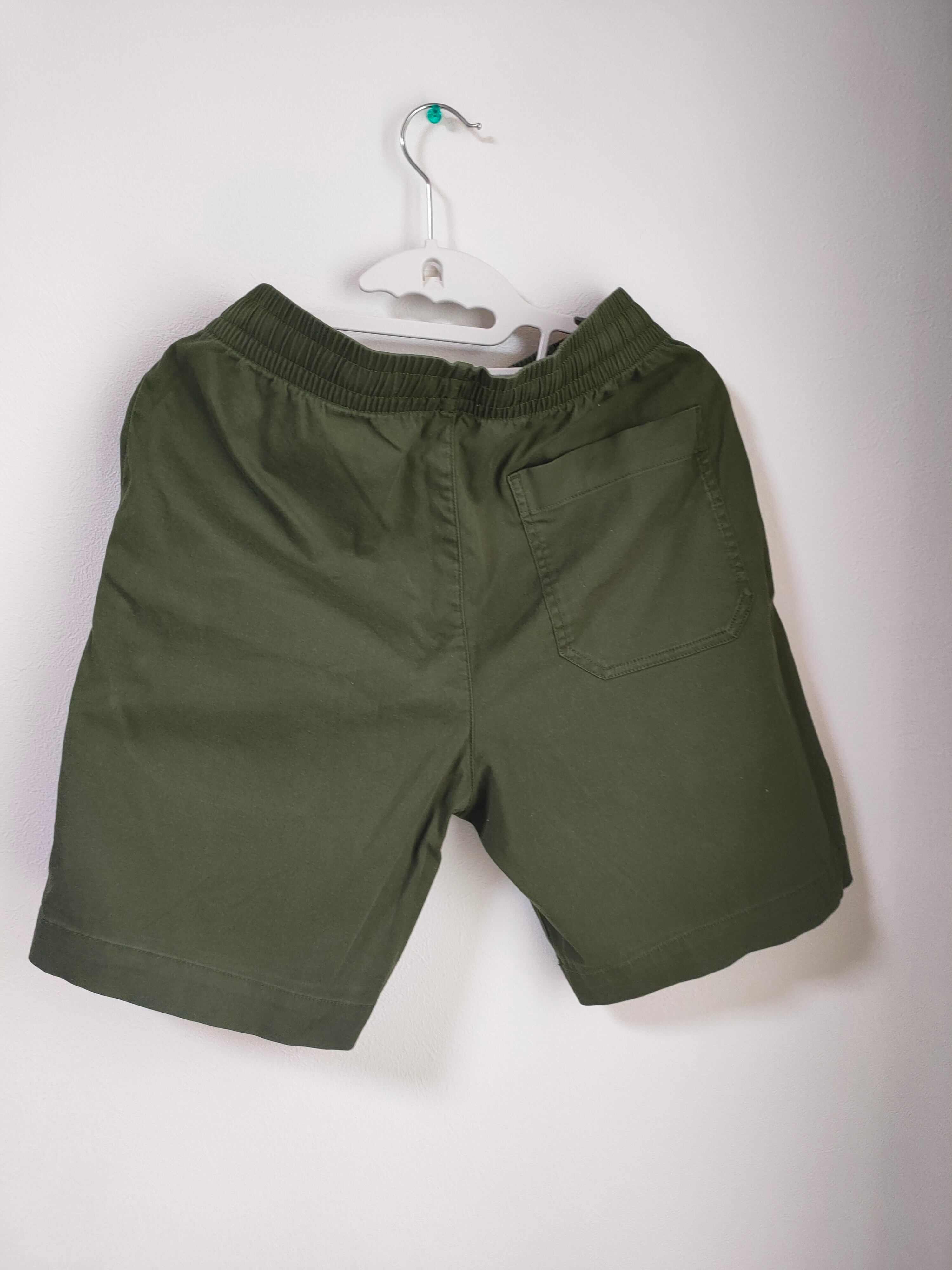 落ち着いたカーキカラーが魅力の、シンプルなメンズショートパンツです。