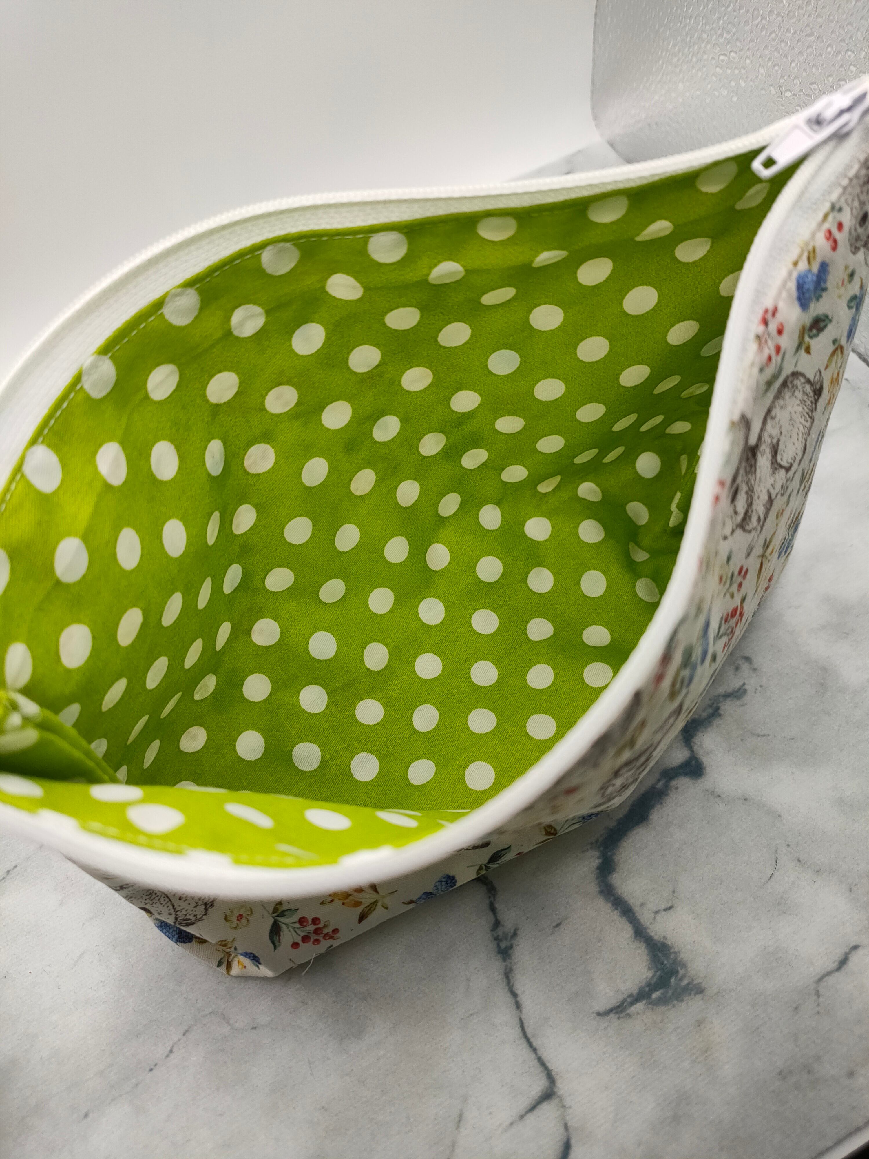 うさぎたちが草花の中で遊んでいるような、やさしい雰囲気のファブリックで作ったポーチです