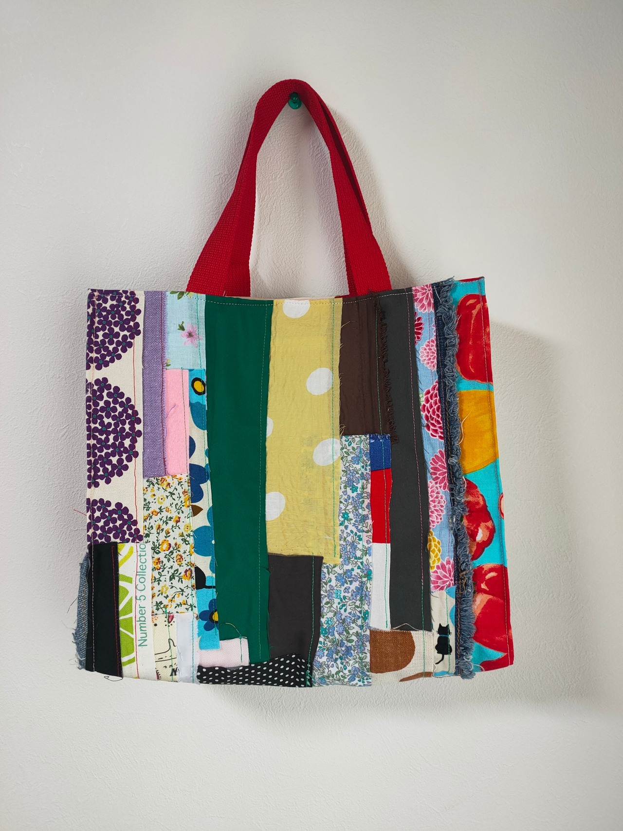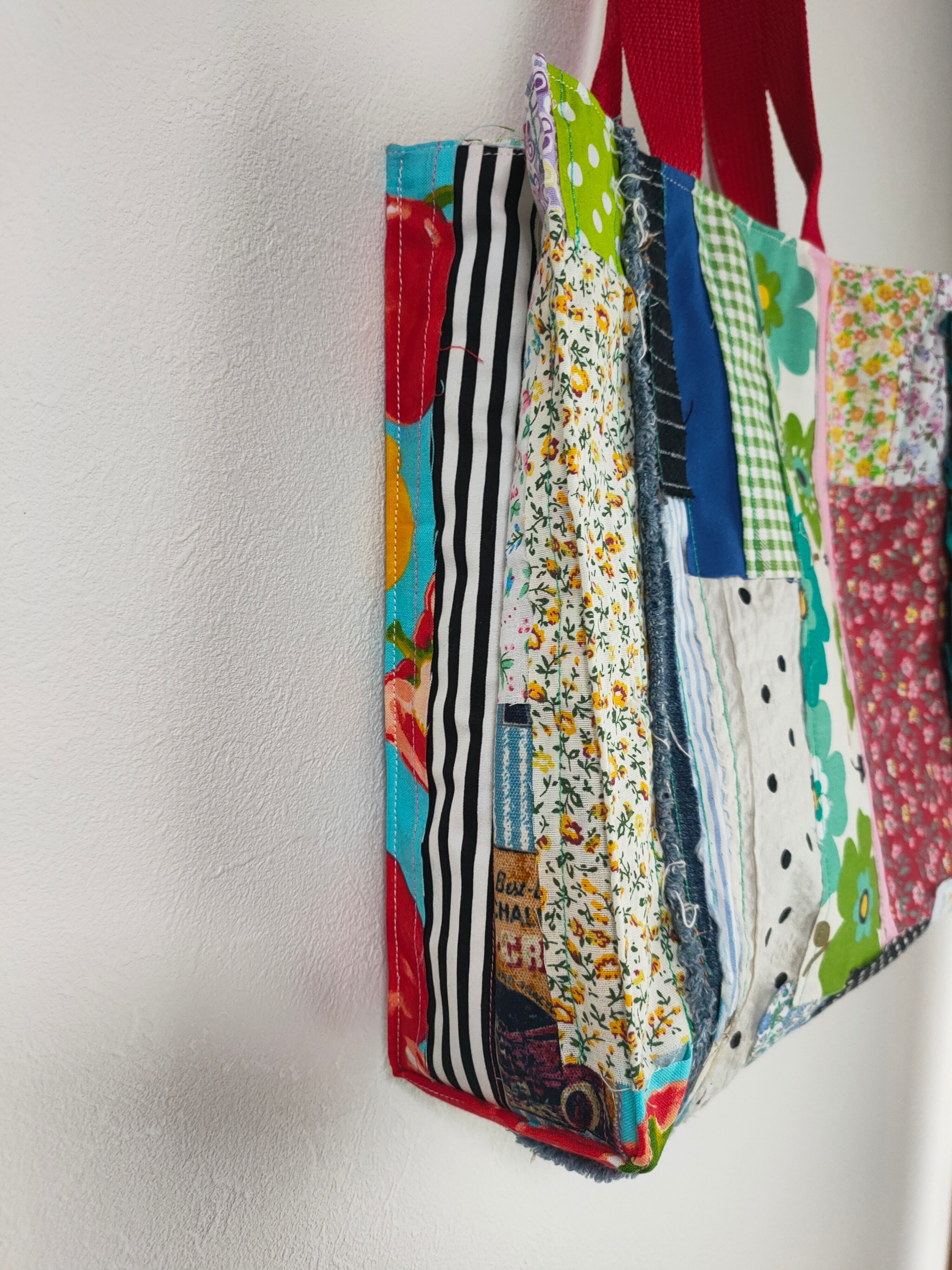 紙袋のようにすっきりとしたフォルムに、ジーンズの切れ端や花柄コットンなど、さまざまな素材をパッチワークで仕立てた、裏地付きのハンドメイドトートです。