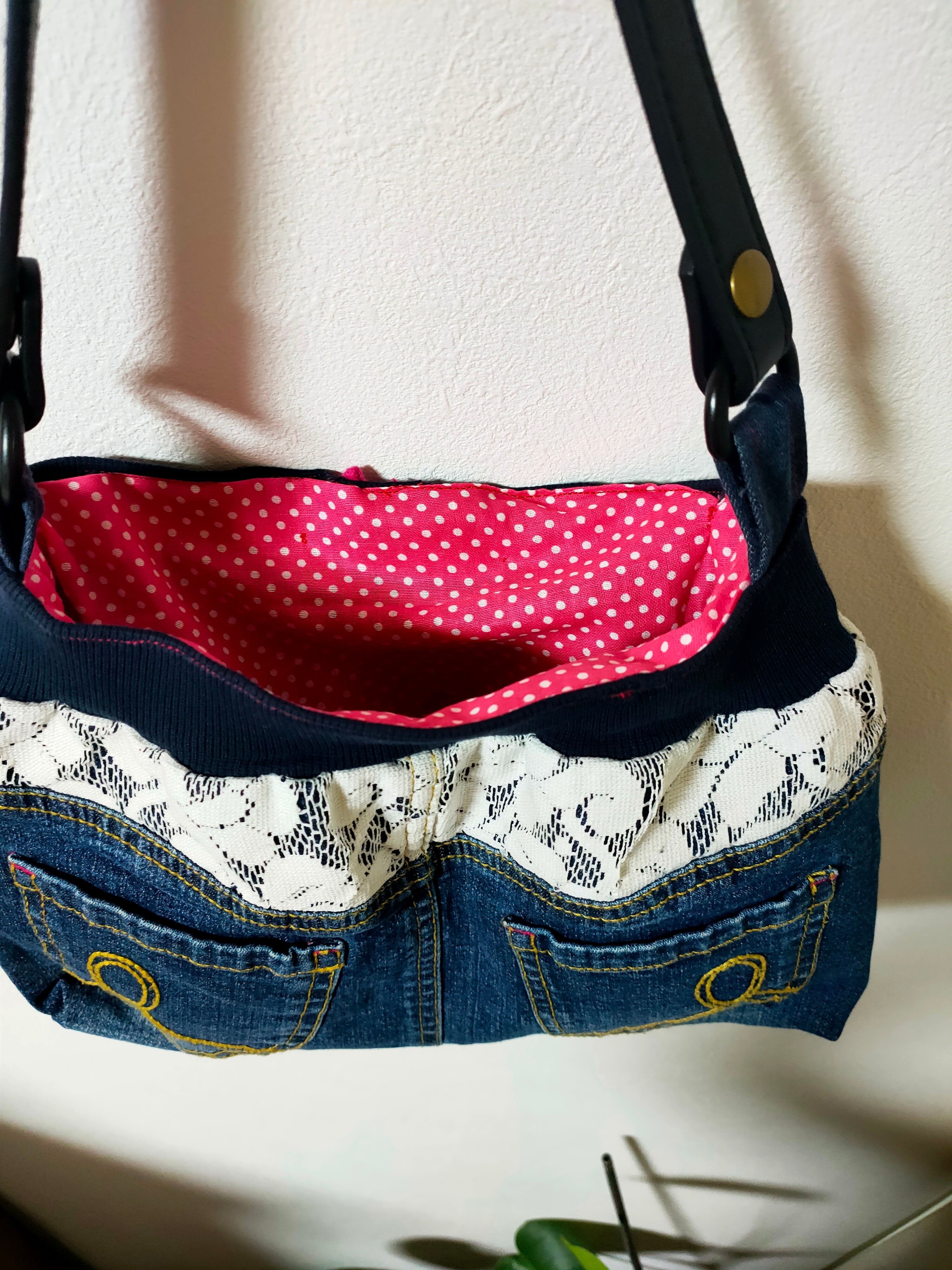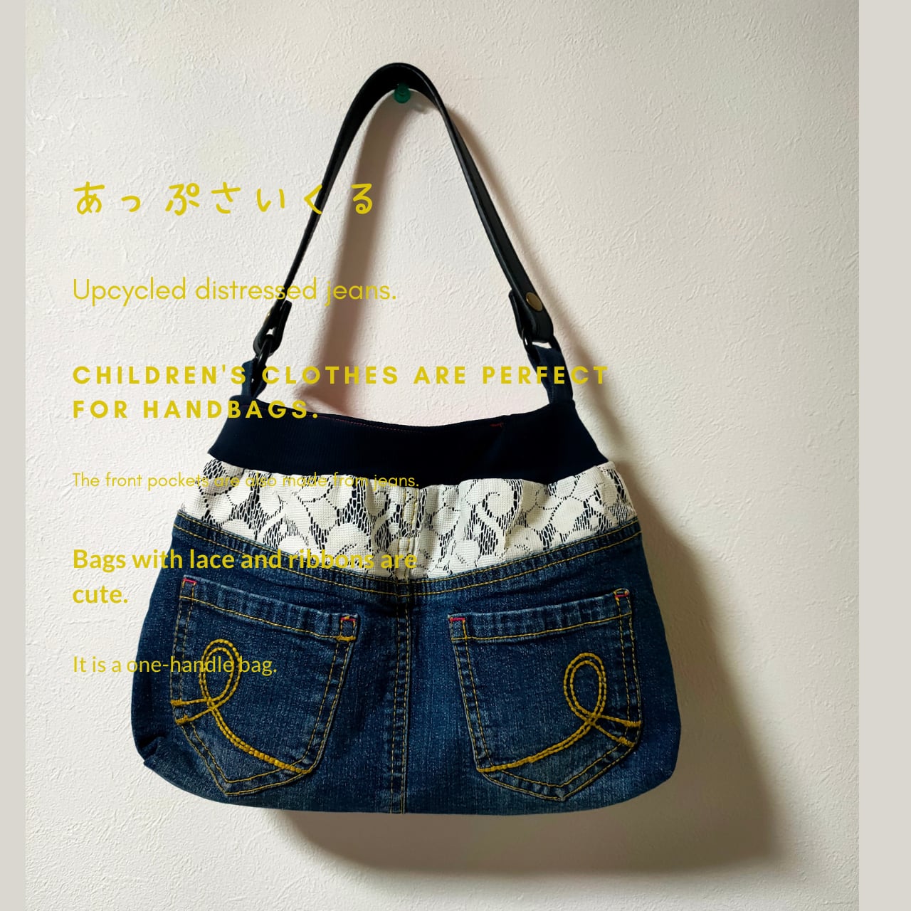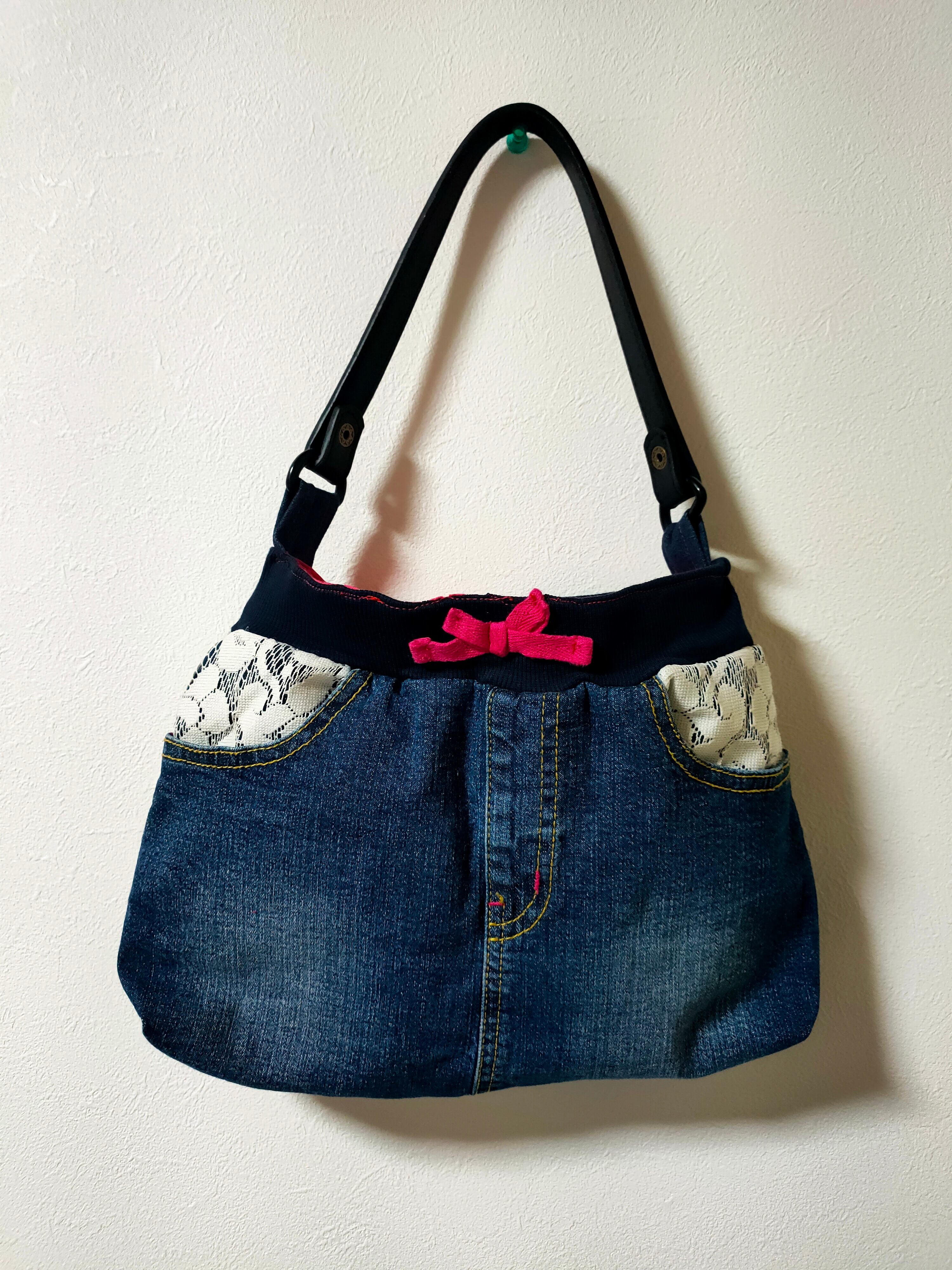 デニムのフロントポケットがポイントのハンドメイドバッグ。