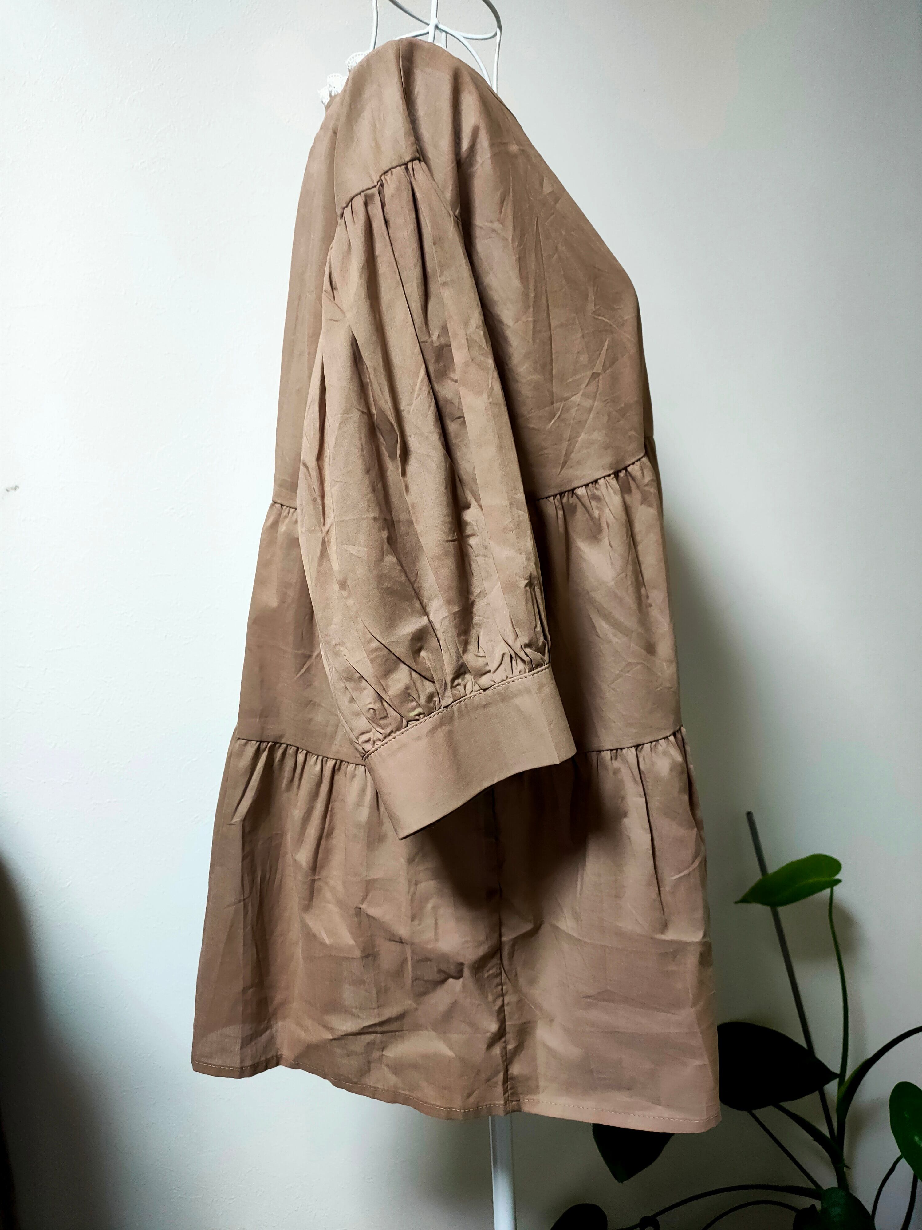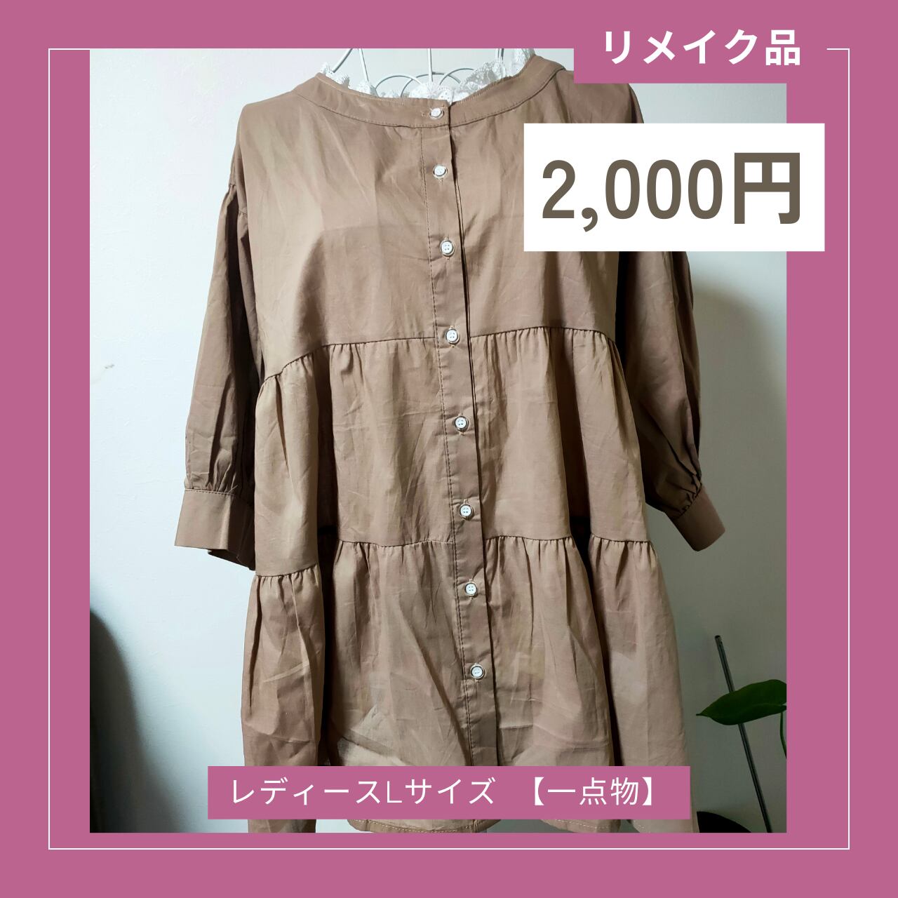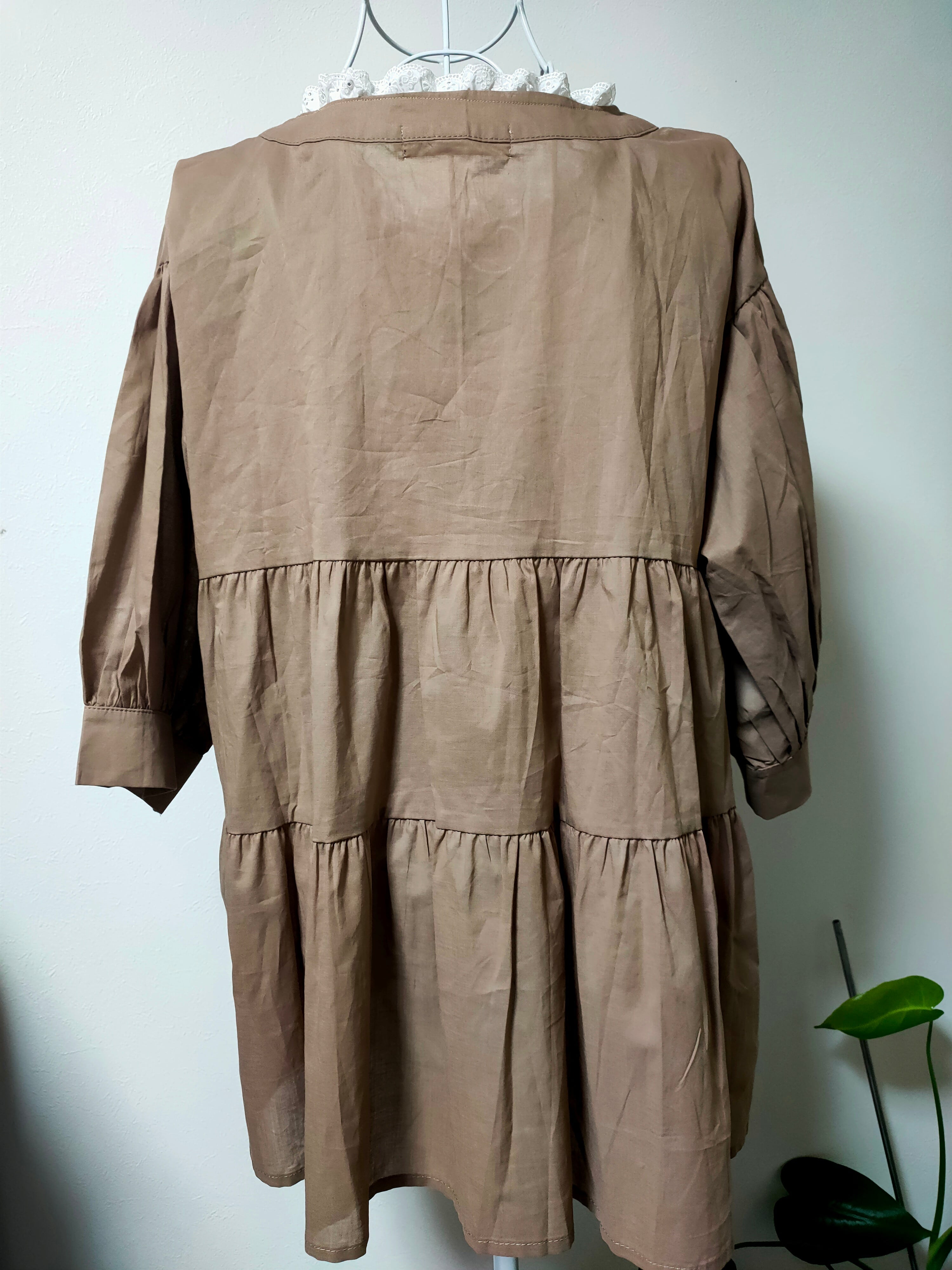 シンプルなブラウンのチュニックに、襟元へ白いレースをあしらってリメイクしました。