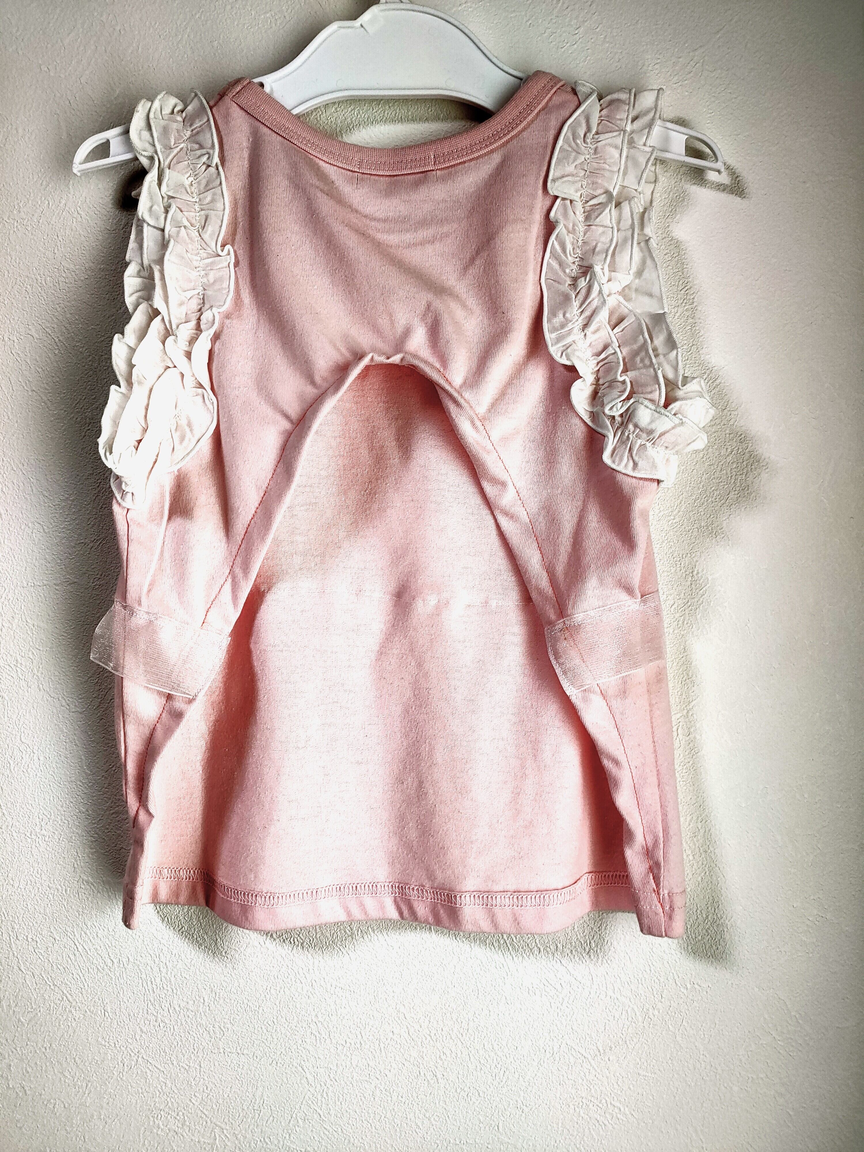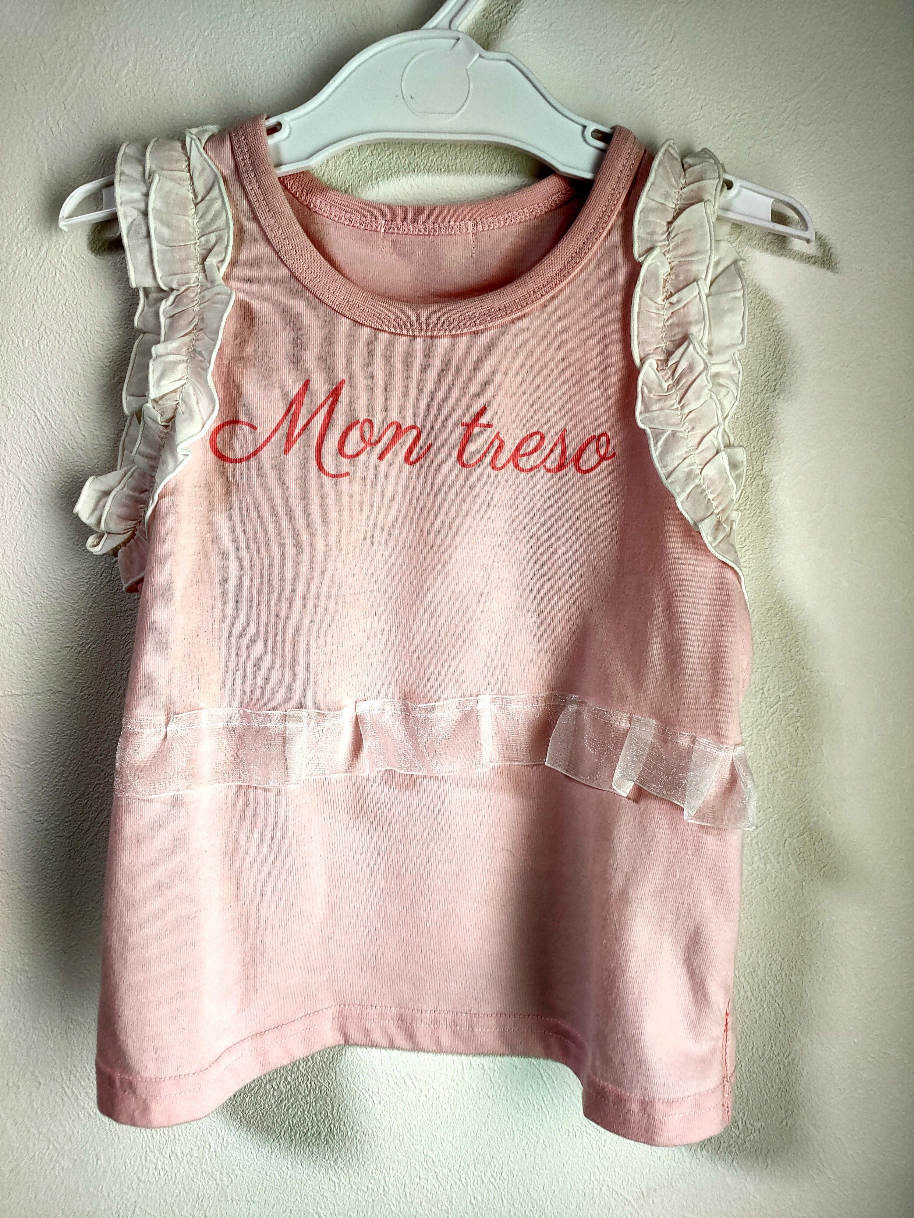 薄いピンクのタンクトップに袖口の白フリル、胸元には「Mon treso」のロゴが入った上品なデザイン。さらに腰には新しく白のオーガンジーフリルをあしらい、可愛らしさをプラスしました。