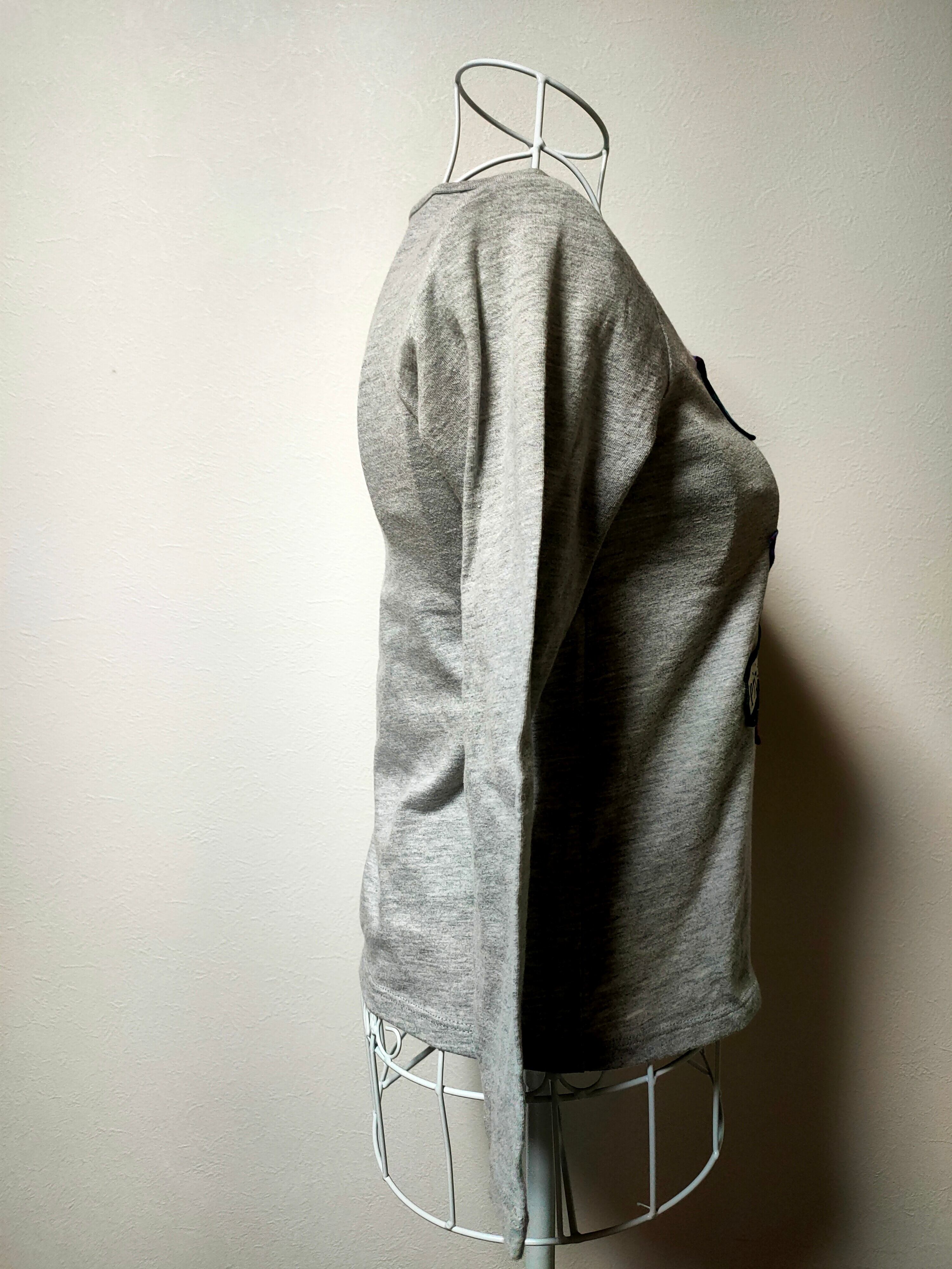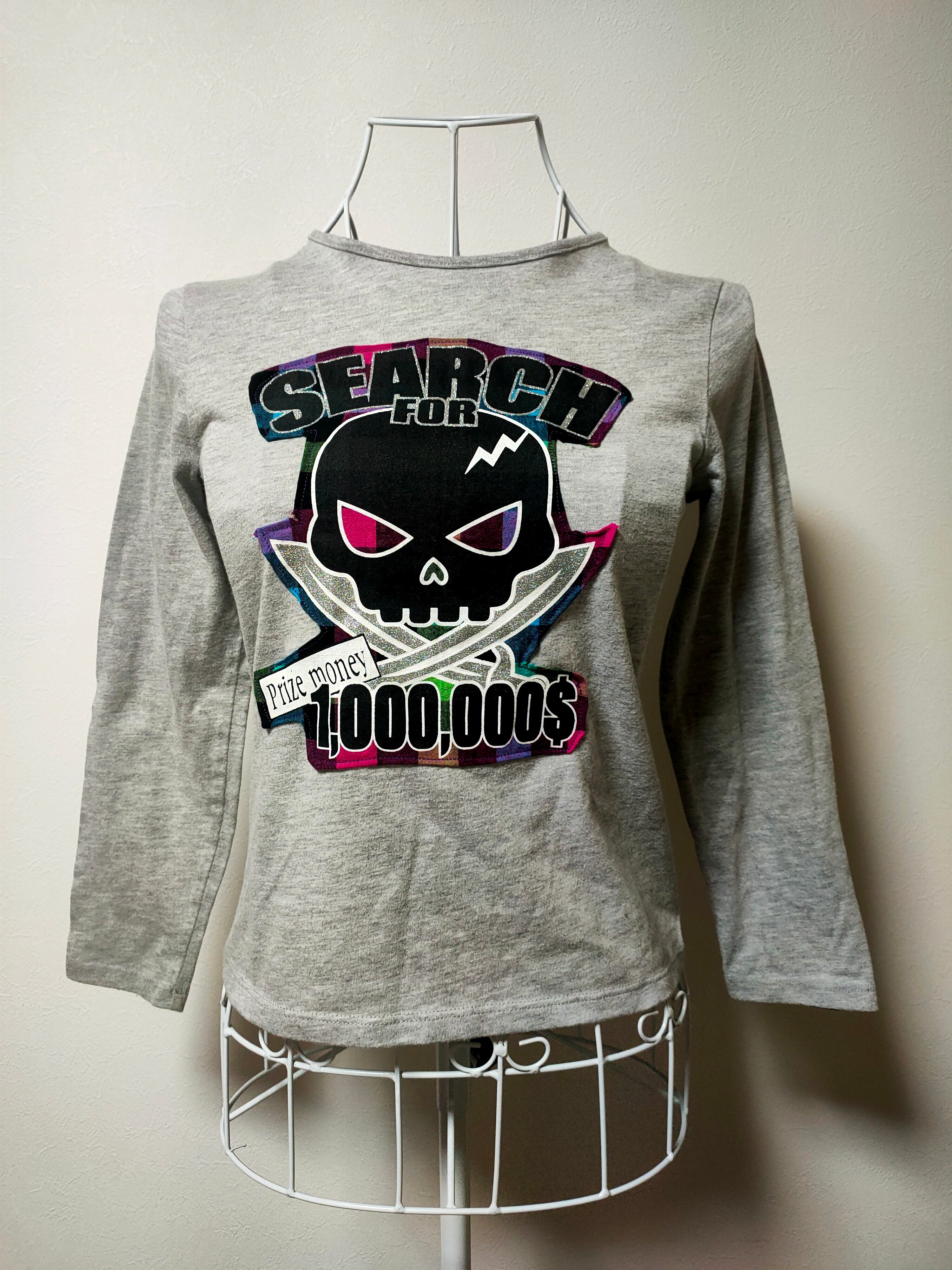 状態の良い中古のグレーのロンTに、インパクトのあるドクロモチーフのアップリケを縫い付けたリメイク品です。