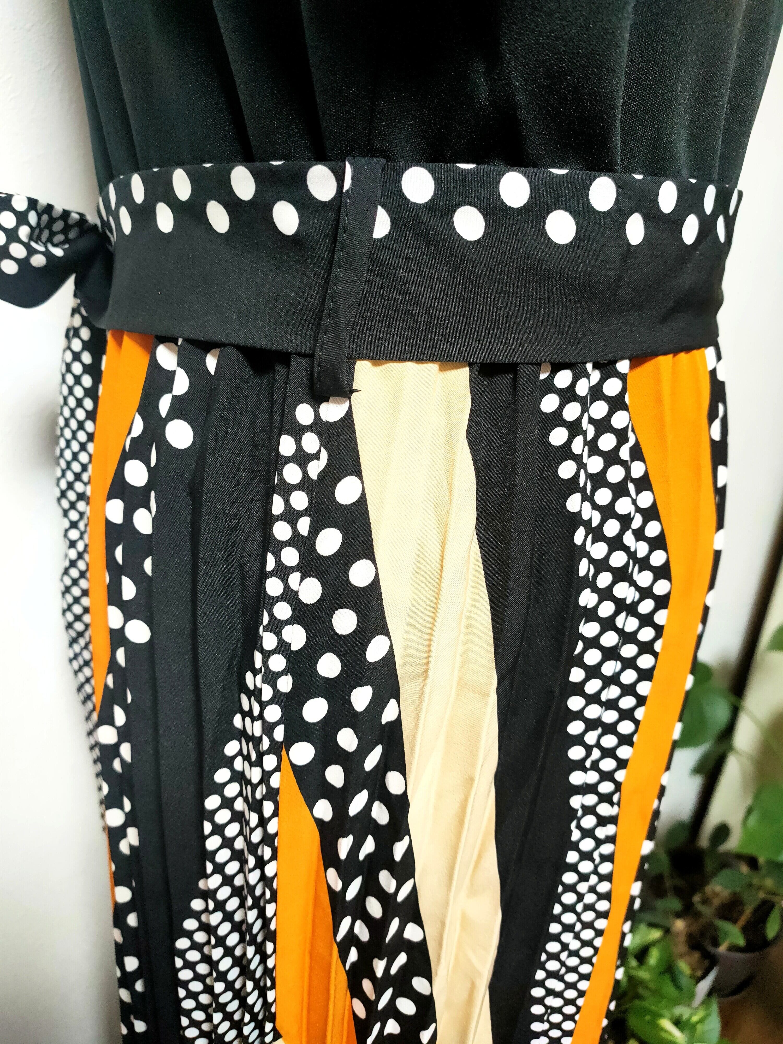 シンプルながらも目を引く、ドット柄とストライプ柄の切り替えデザインが魅力です。上半身はシンプルなブラックのTシャツ風で、一枚でさらっと着られます。ウエストのリボンベルトでスタイルアップも叶います。