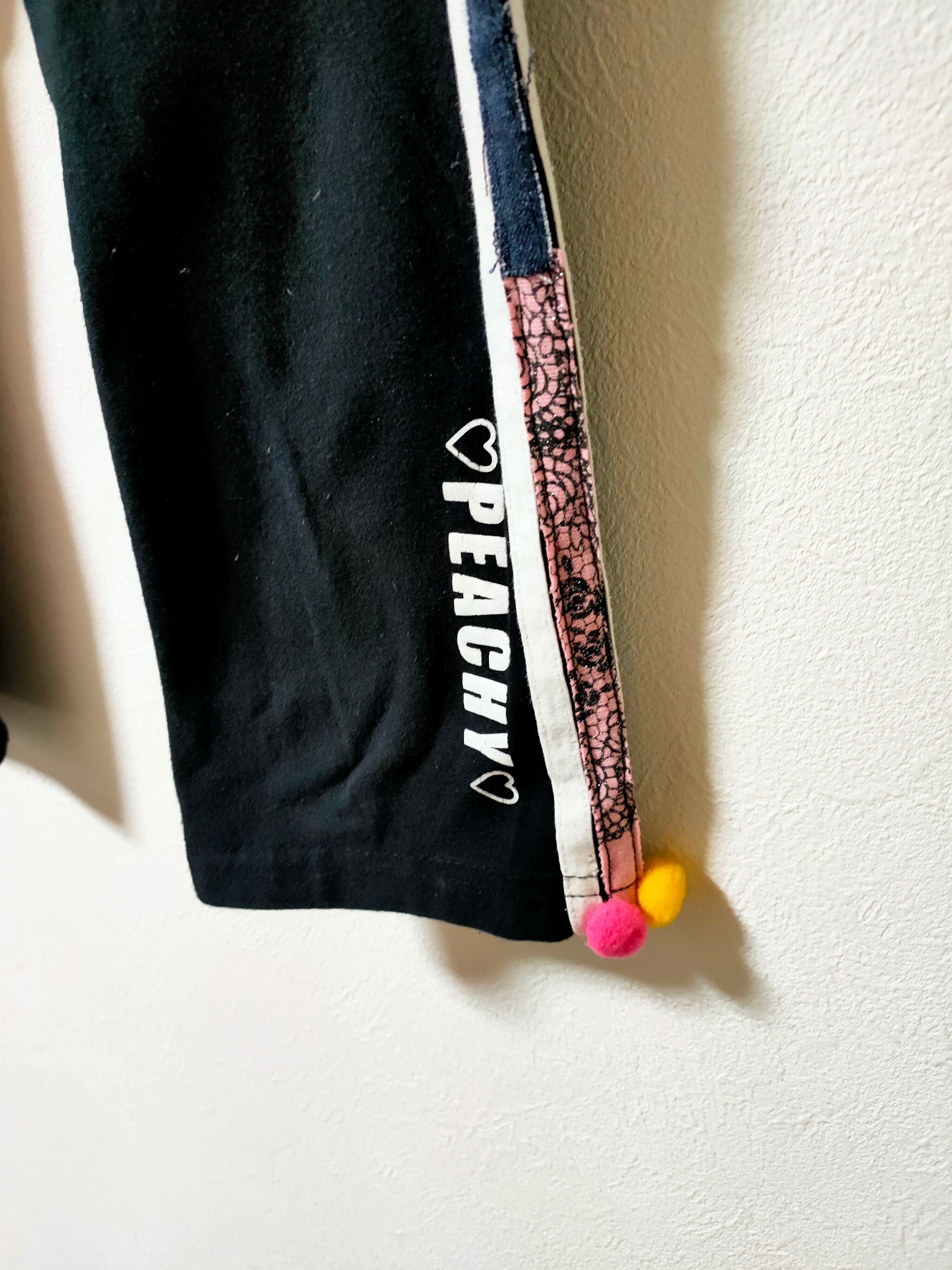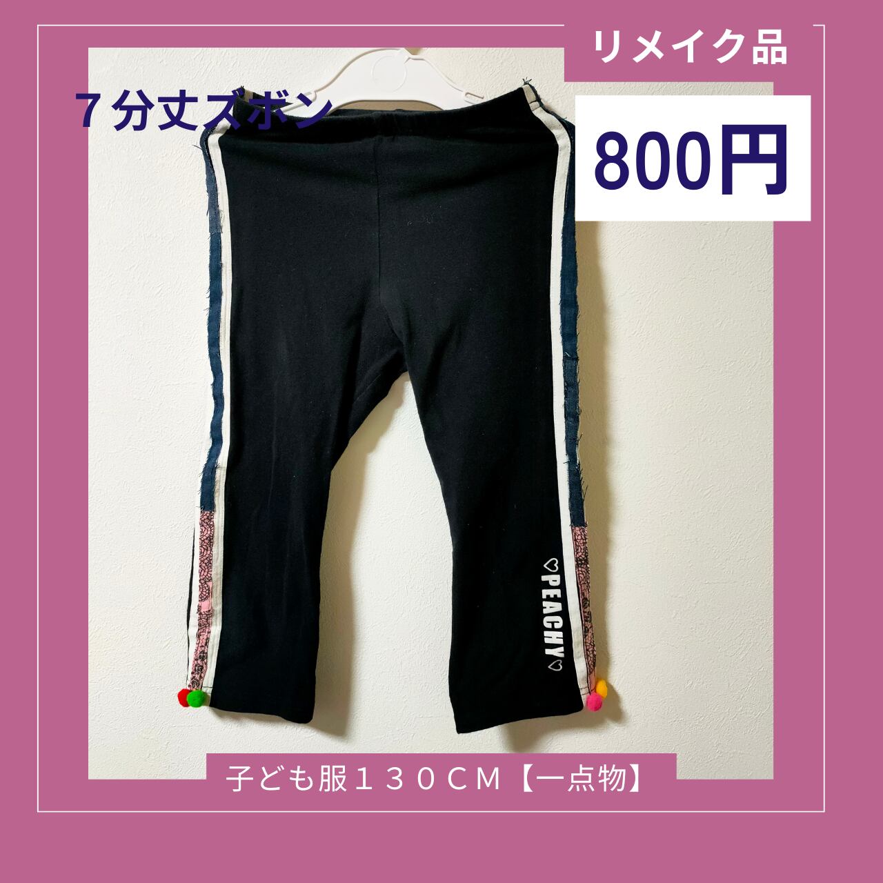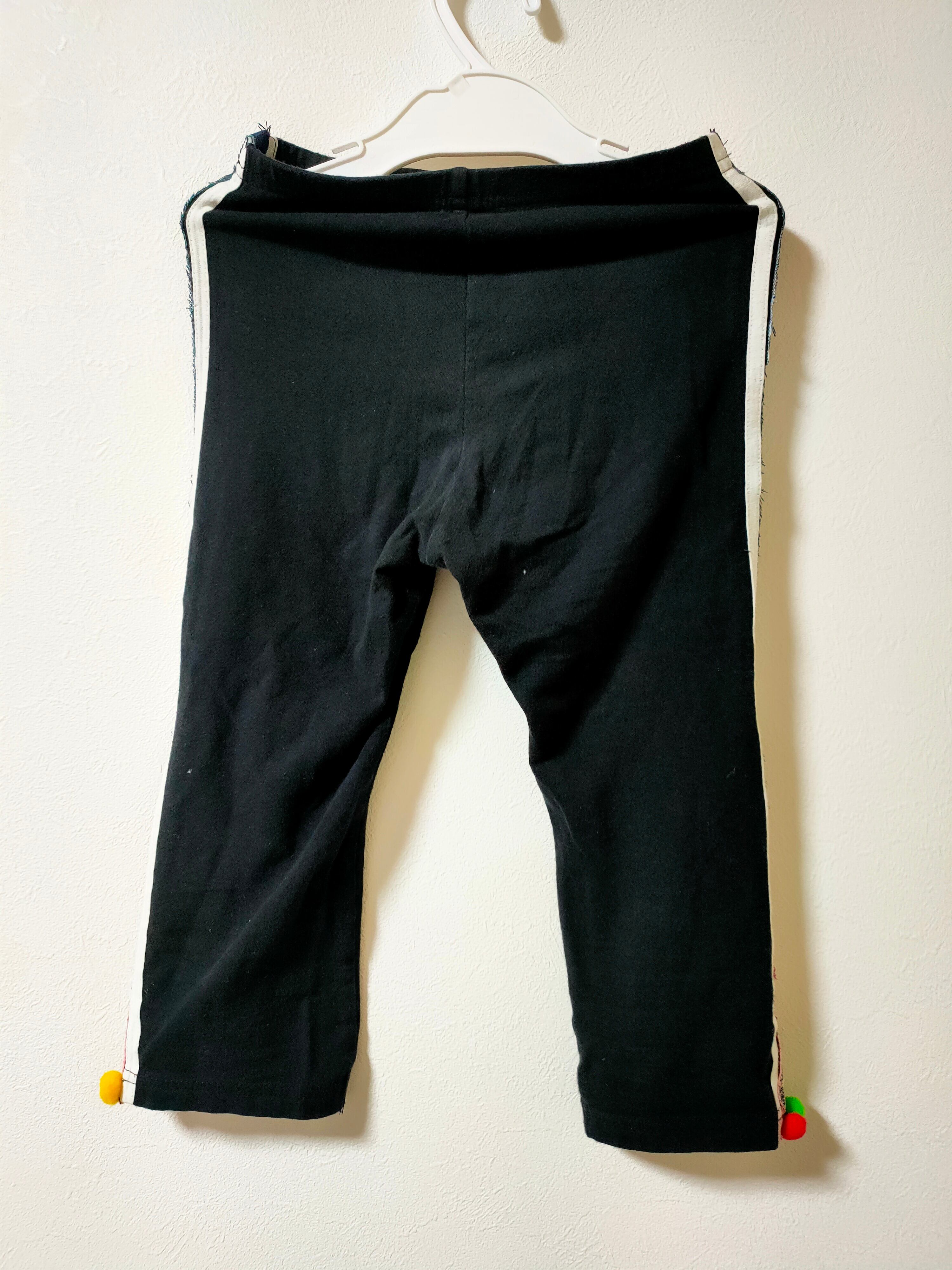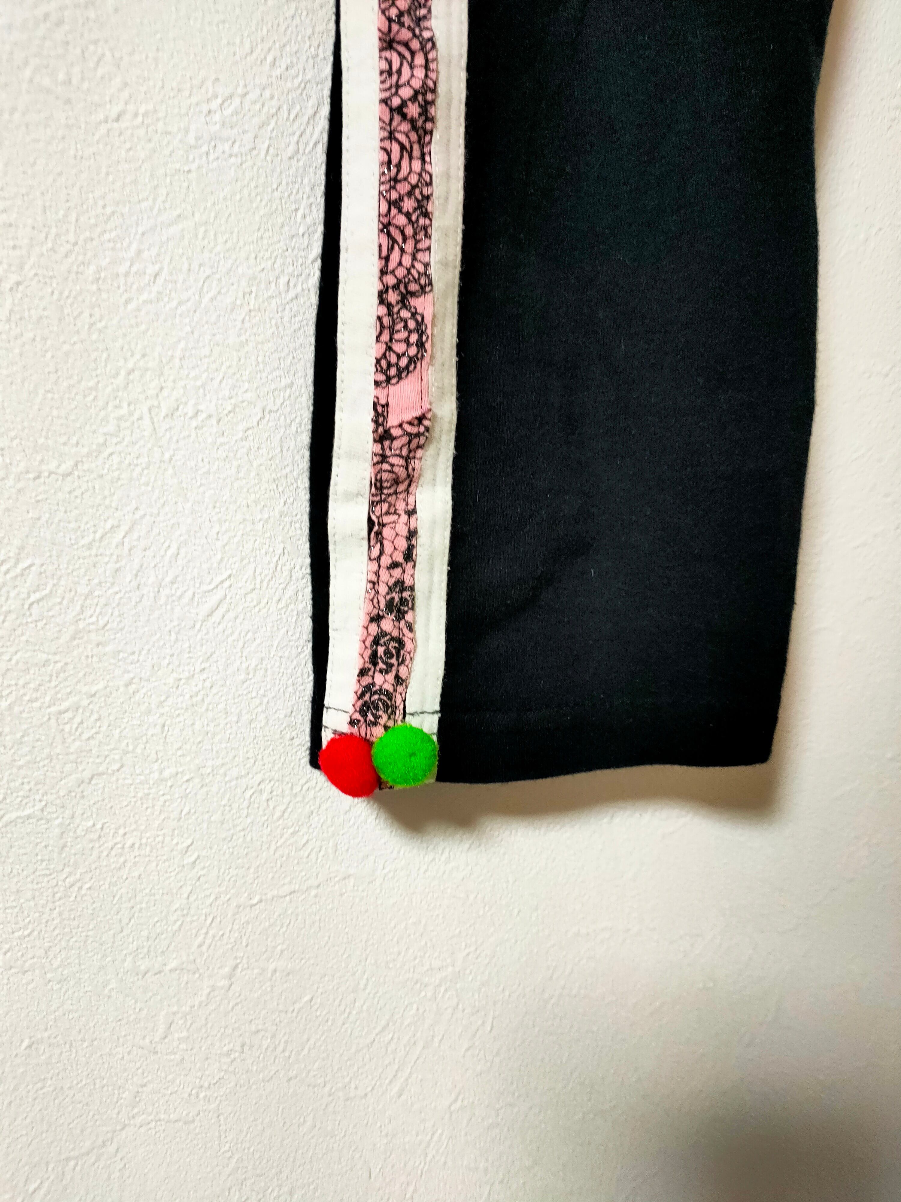 一点物のリメイク子供服、7分丈ズボン(サイズ130cm)です。ベースはUSED(古着)のズボンを使用しています。黒のズボンのサイドラインに、ジーパン生地やラメ生地を縫い付け、カラフルなポンポンを裾に付けました。ジーパン生地は、着用や洗濯によりほころび(ほつれ)が出やすいですが、そのほころび感もデザインの一部として楽しんでいただける方におすすめです。個性的で元気いっぱいのキッズにぴったりのアイテムです。