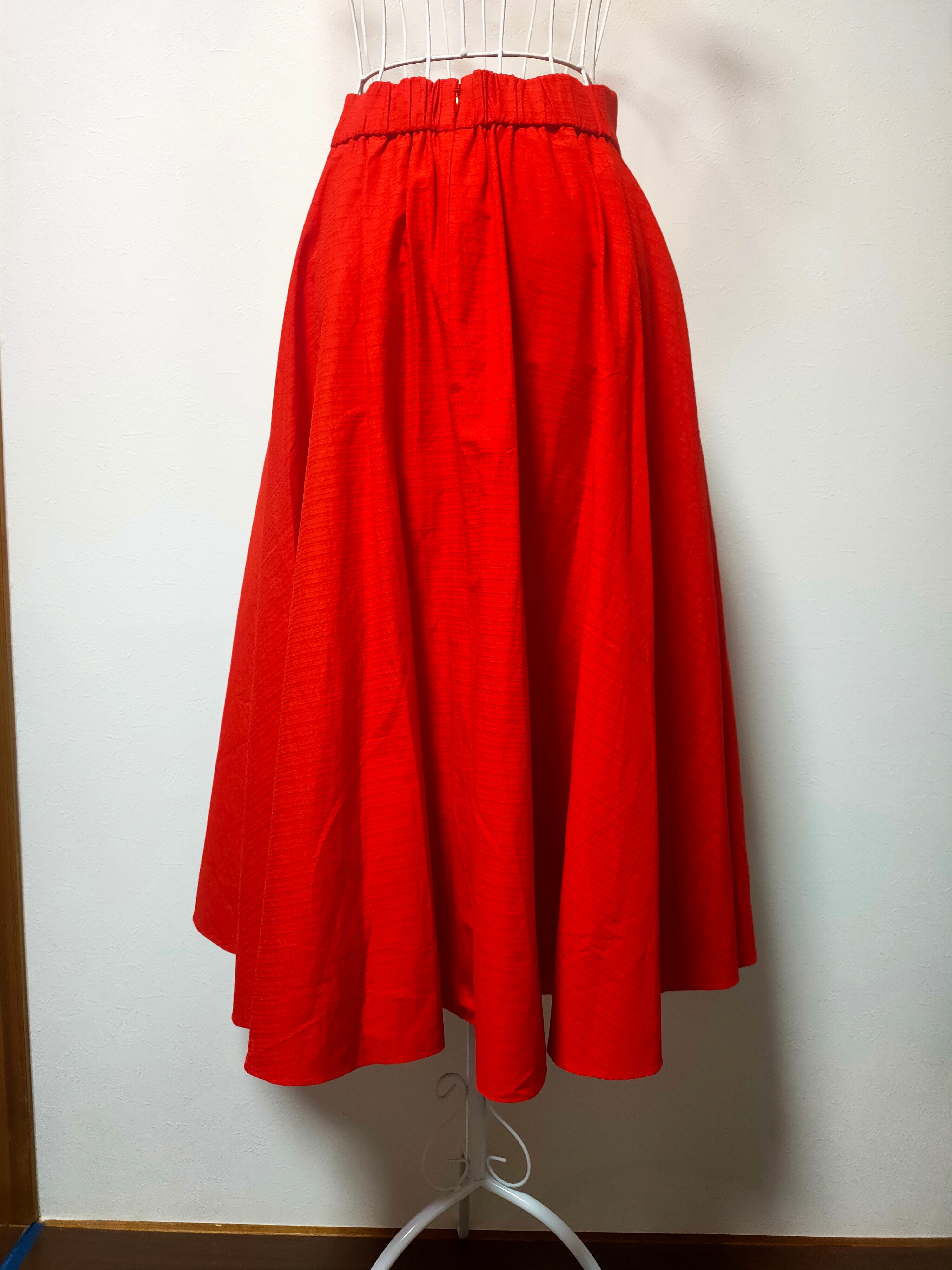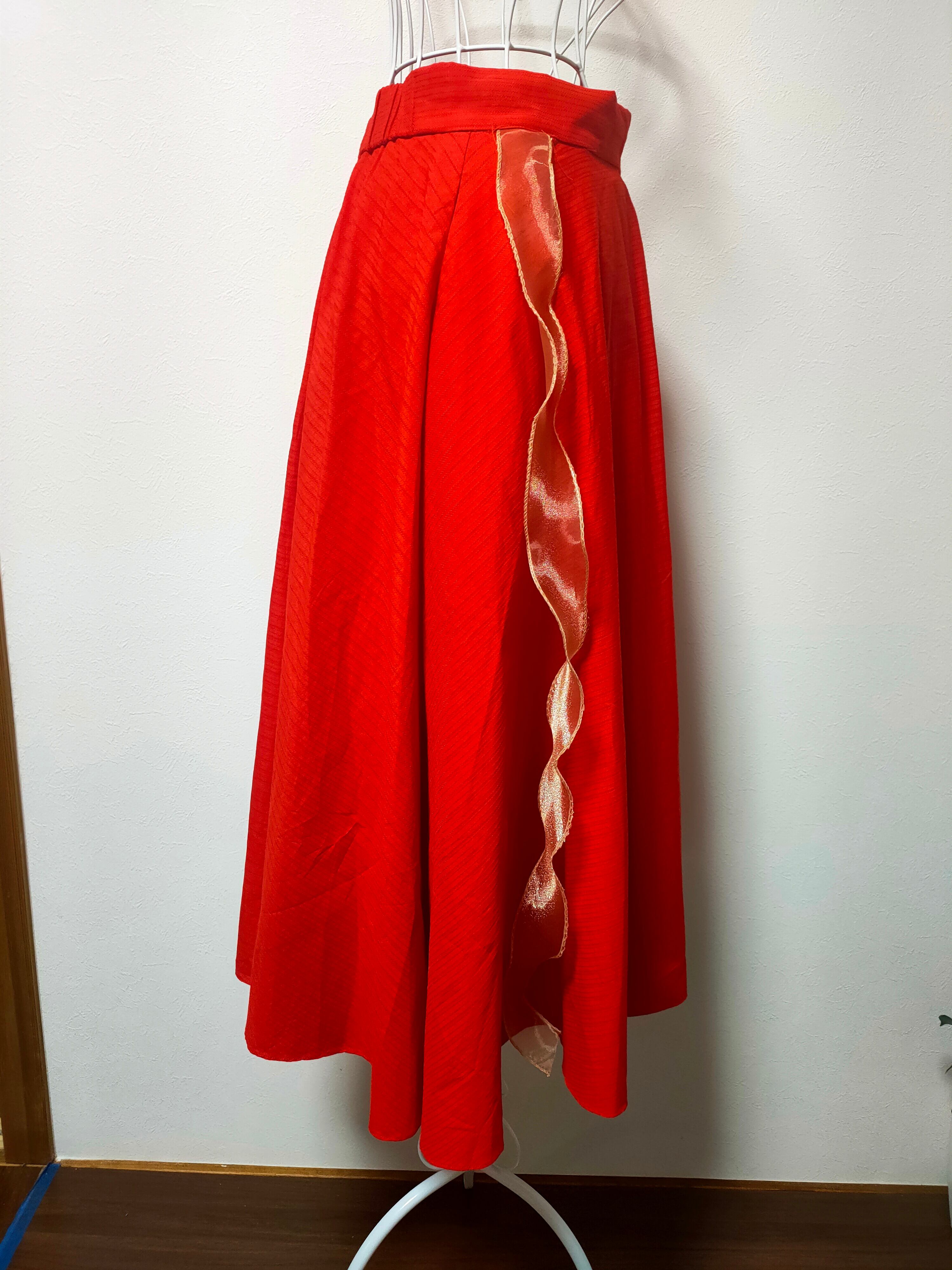 USED(古着)のオレンジスカートをベースにリメイクした一点物です。サイズはレディースM(ウェスト63~69cm)。状態は良好です。サイドにリボンを縫い付けました。リボンはウエスト部分にのみ固定されているため、歩くたびにひらひらと揺れ、フェミニンで華やかな動きを演出します。鮮やかなオレンジ色が目を引き、シンプルなトップスと合わせるだけでコーディネートの主役になります。
