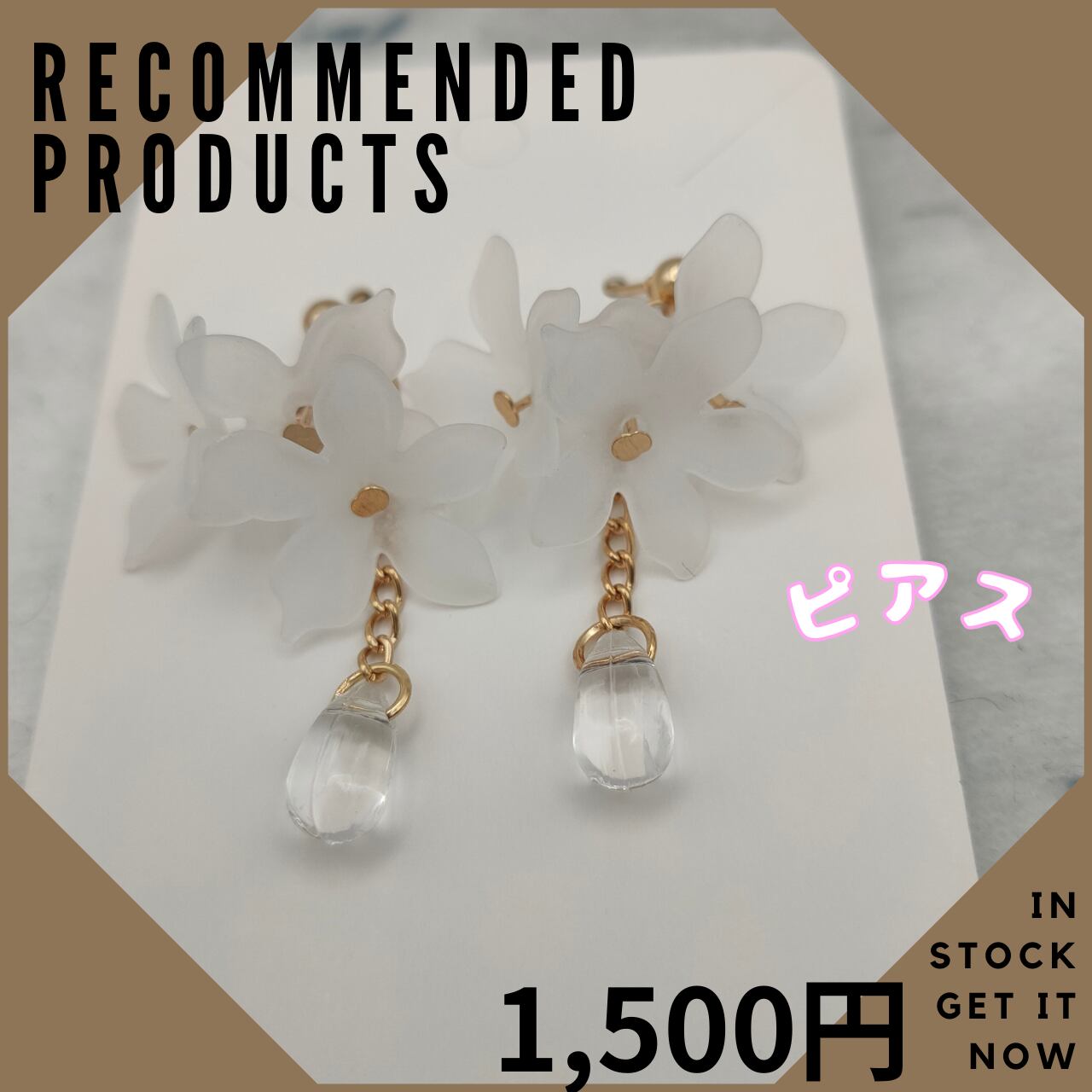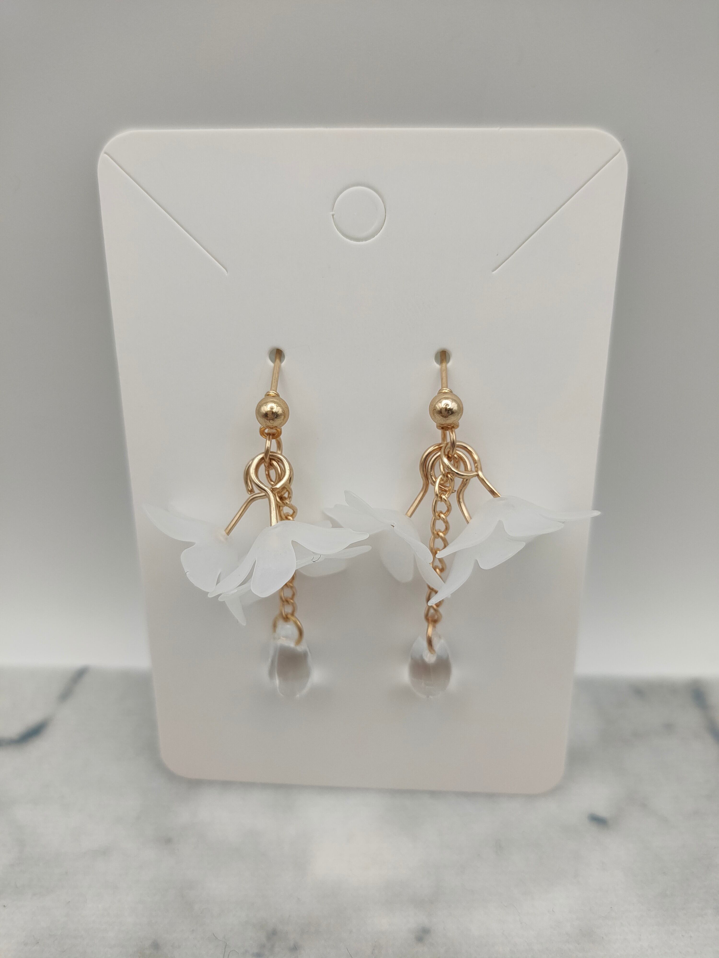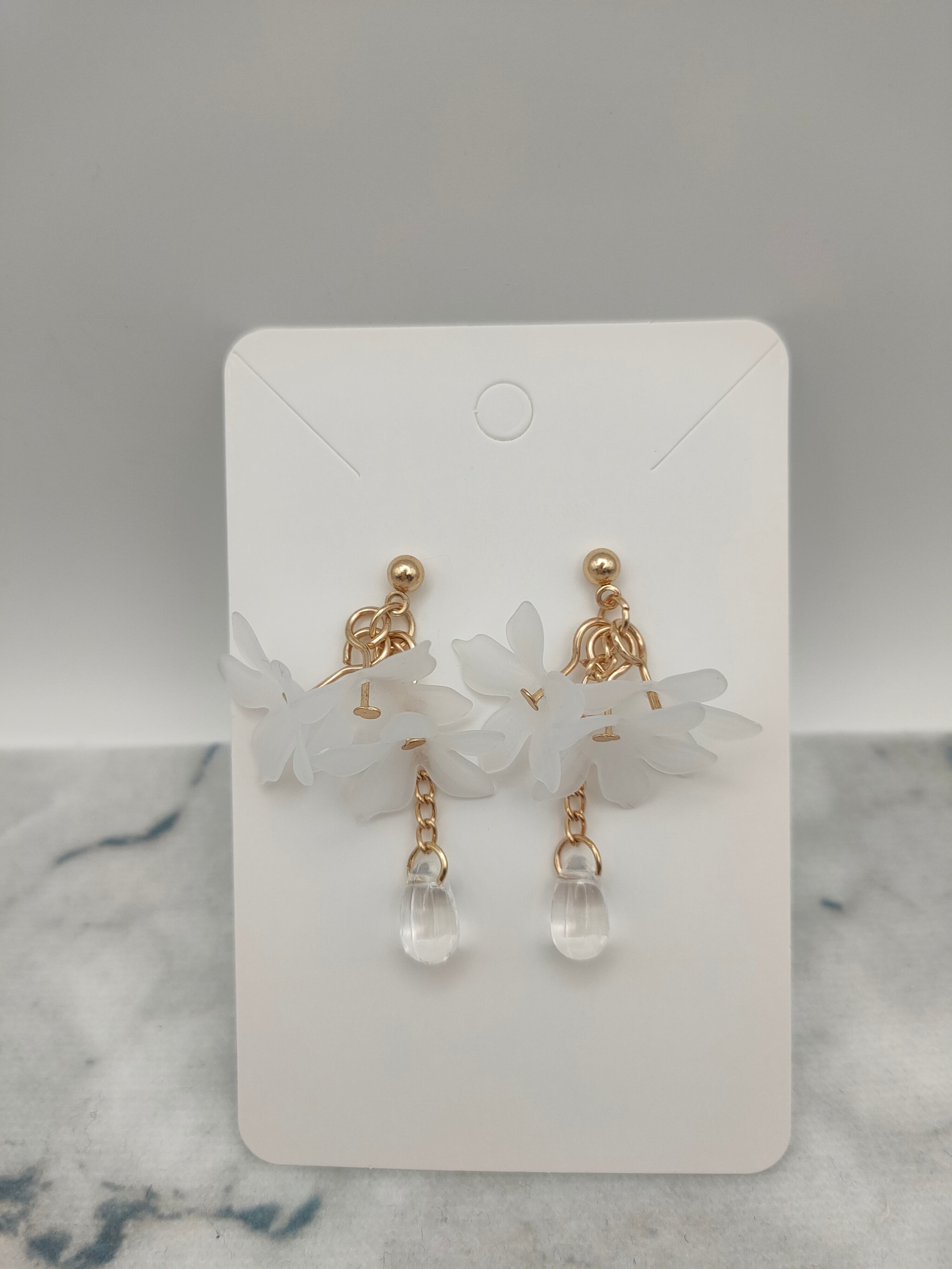 このピアスは、可憐な白い花と透明な雫を組み合わせた、繊細で上品なデザインです。耳元で軽やかに揺れるので、顔周りをぱっと明るく華やかに見せてくれます。