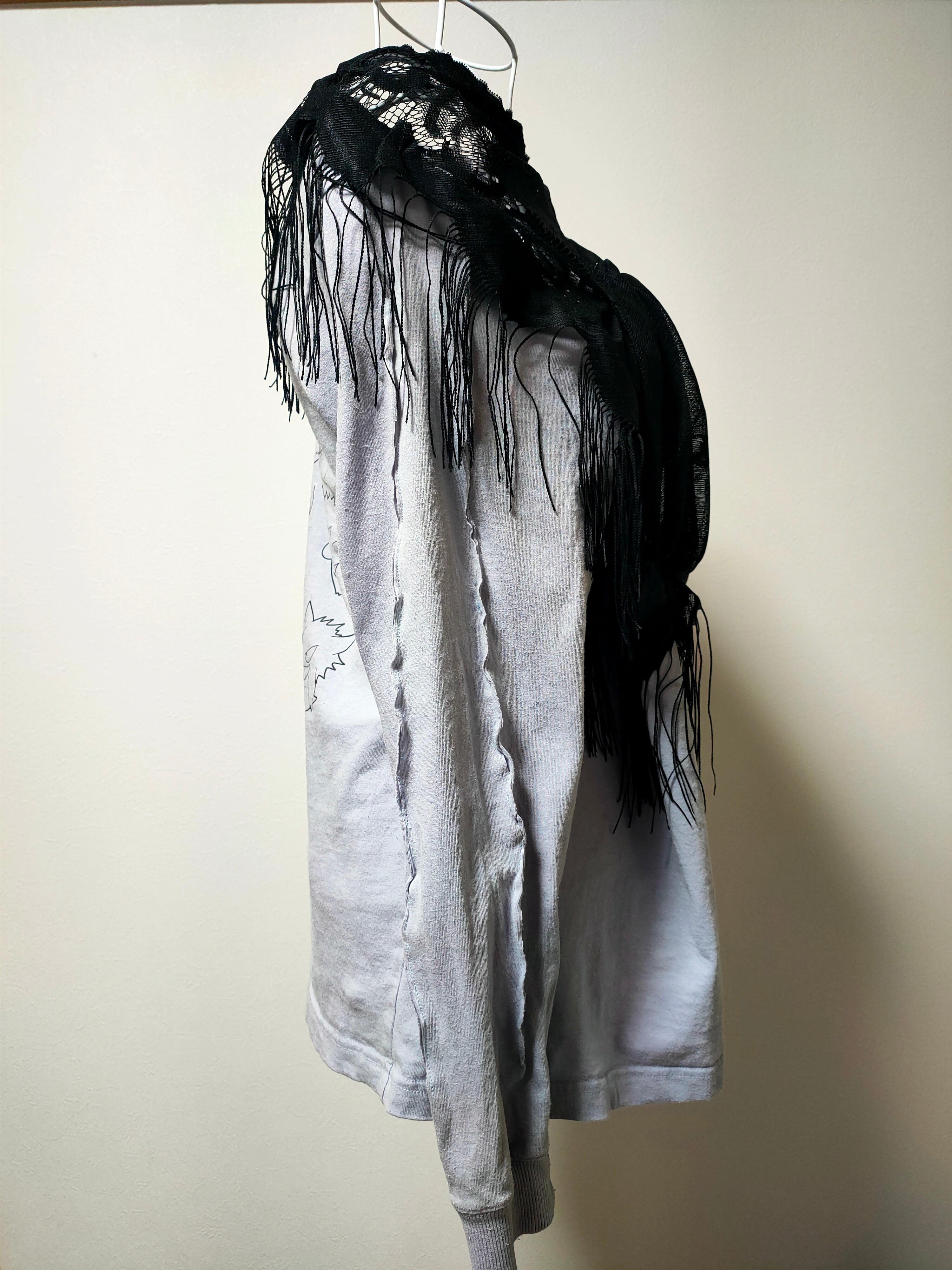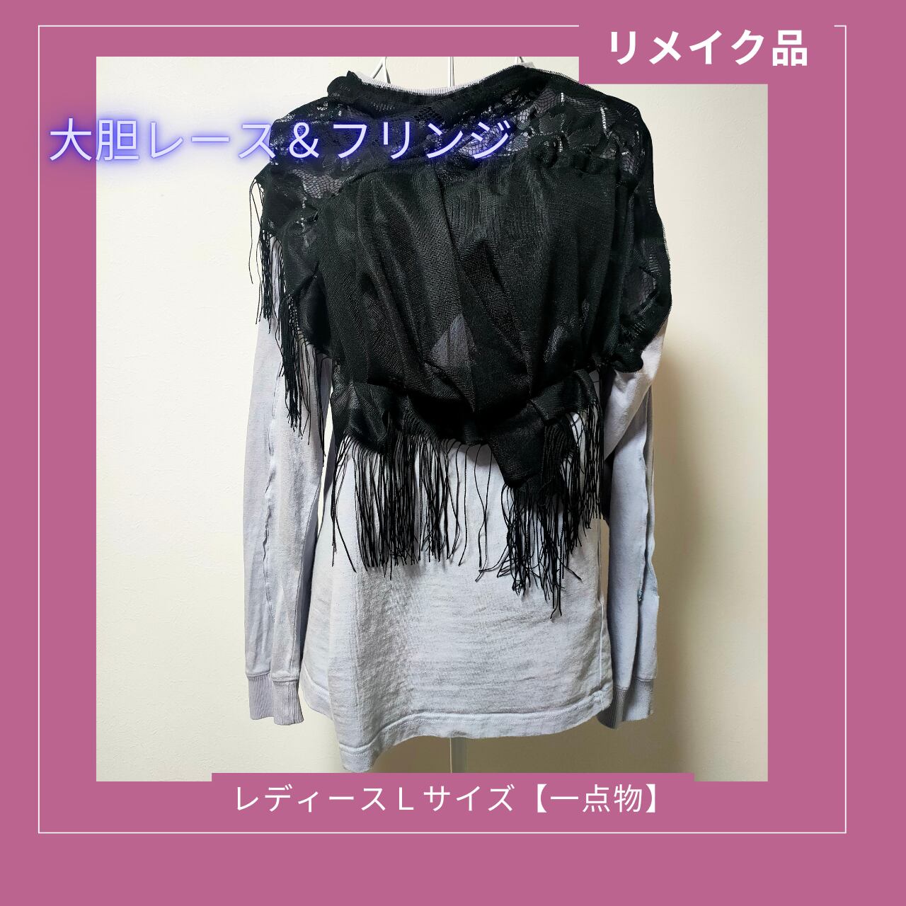 メンズMサイズのUSEDロンTをベースに、両袖と胸元を大胆にカットし、上から黒のレースとフリンジを重ねてリメイクしました。