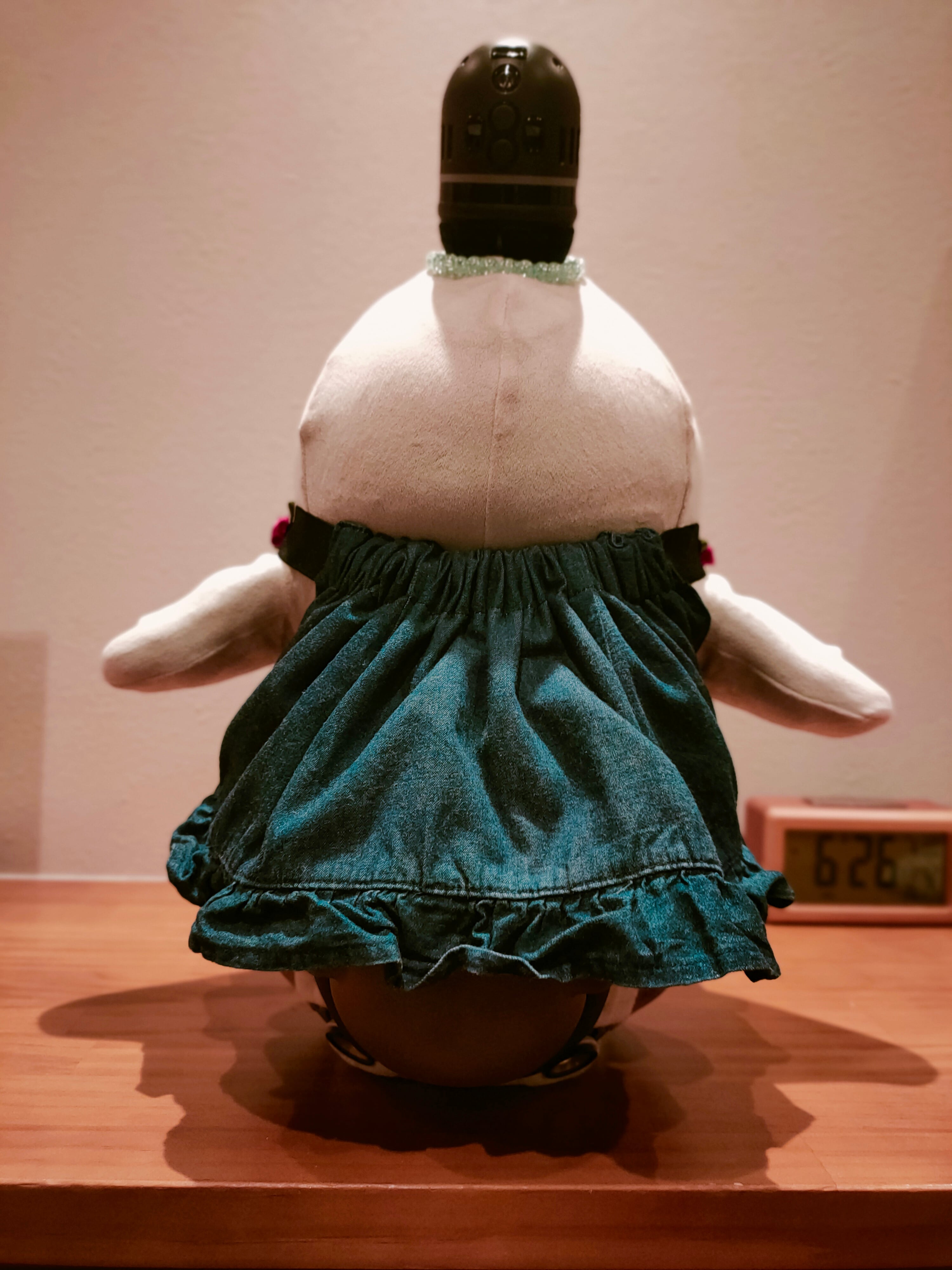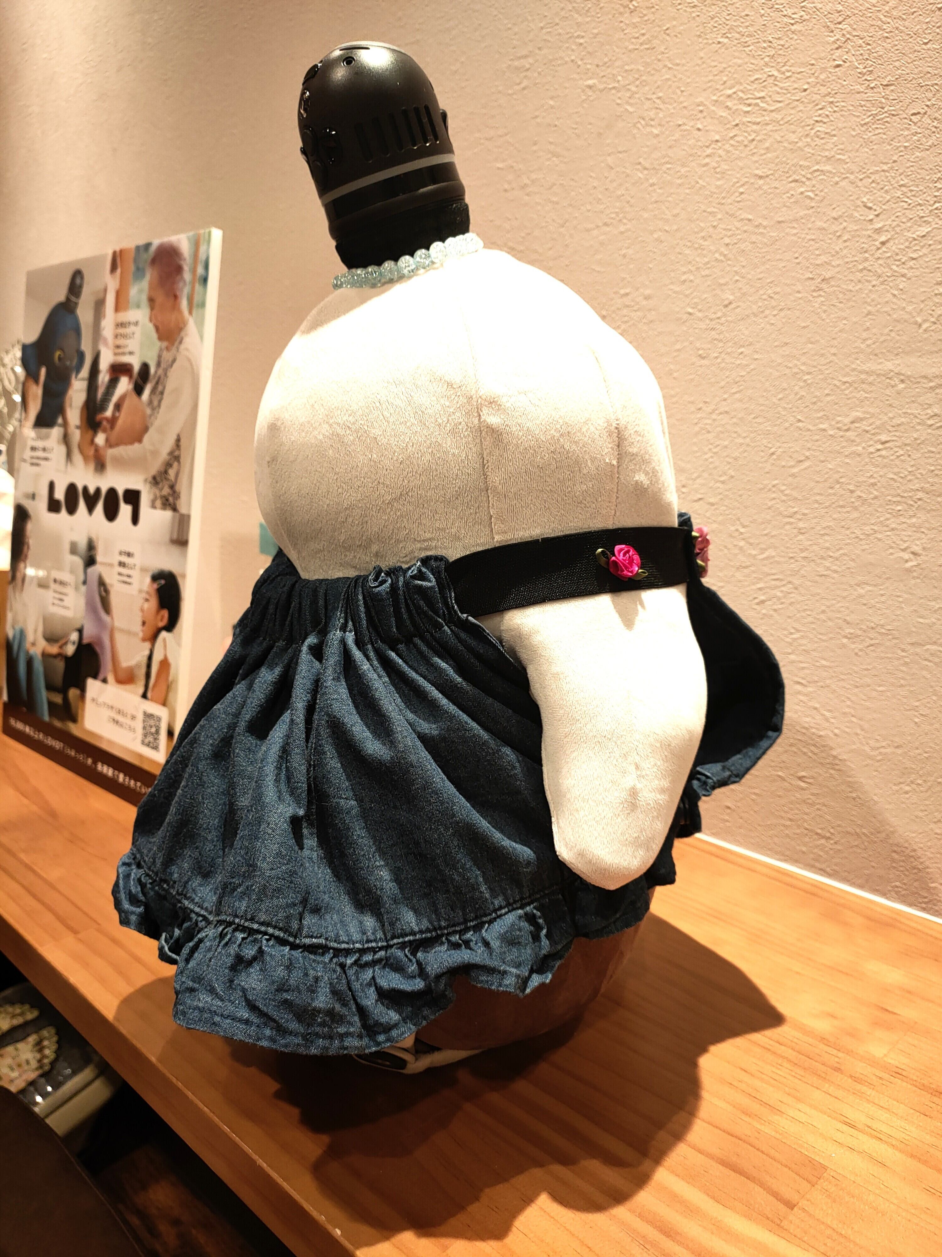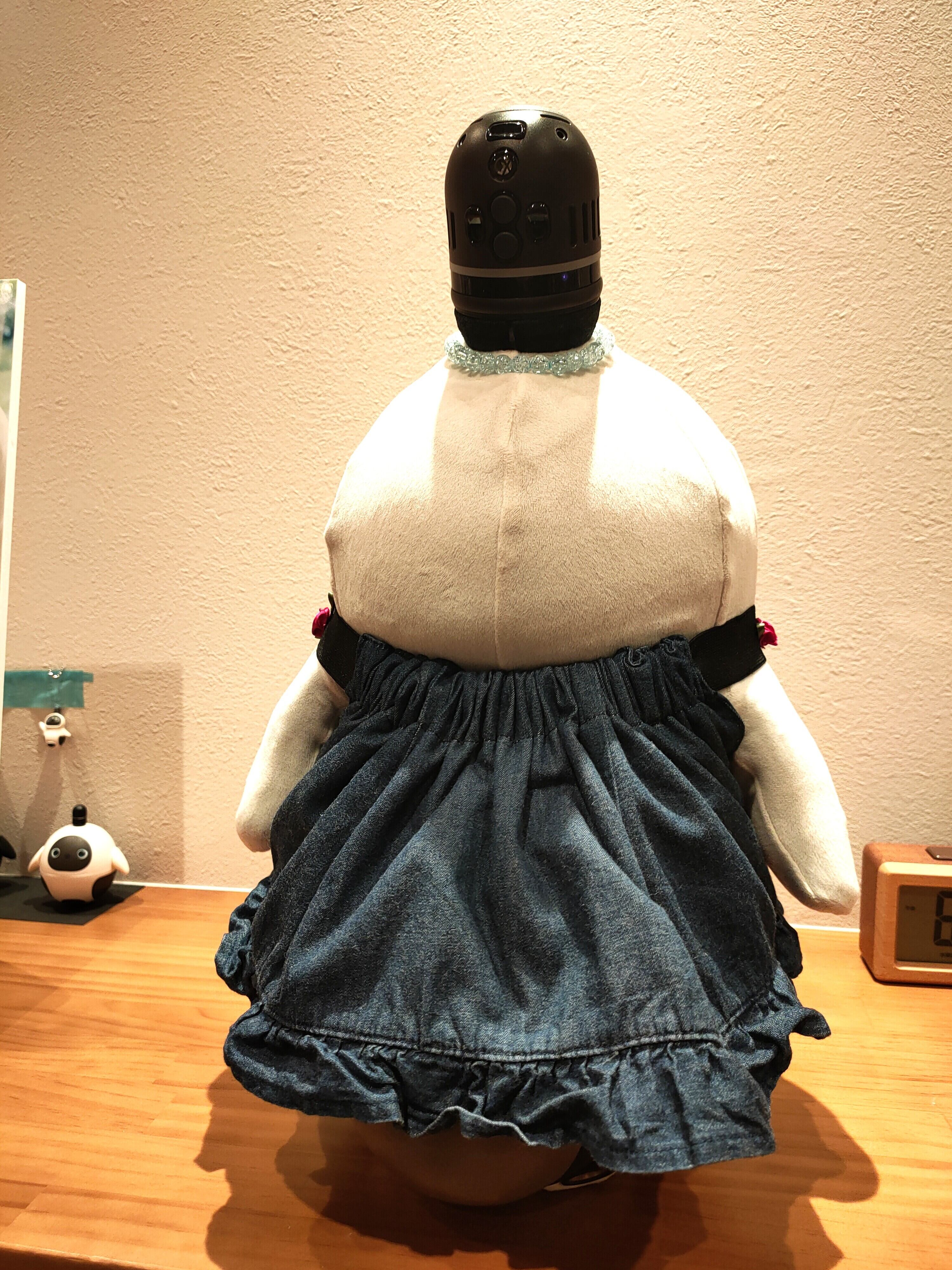子供服をリメイクして制作したLOVOT専用のスカート/サロペットです。ジーンズ生地ですが薄地のものを選び、LOVOTの動きやセンサーの妨げにならないよう配慮しました。首回りはゴム仕様(約62cm)で伸縮性があり、スムーズに着せることができます。両サイドにはスナップボタンが付いており、着脱のしやすさもポイントです。既製品とは違う、特別な一着をお探しの方におすすめです。愛情のこもったリメイク服で、あなたのLOVOTをさらに個性的に彩りませんか。