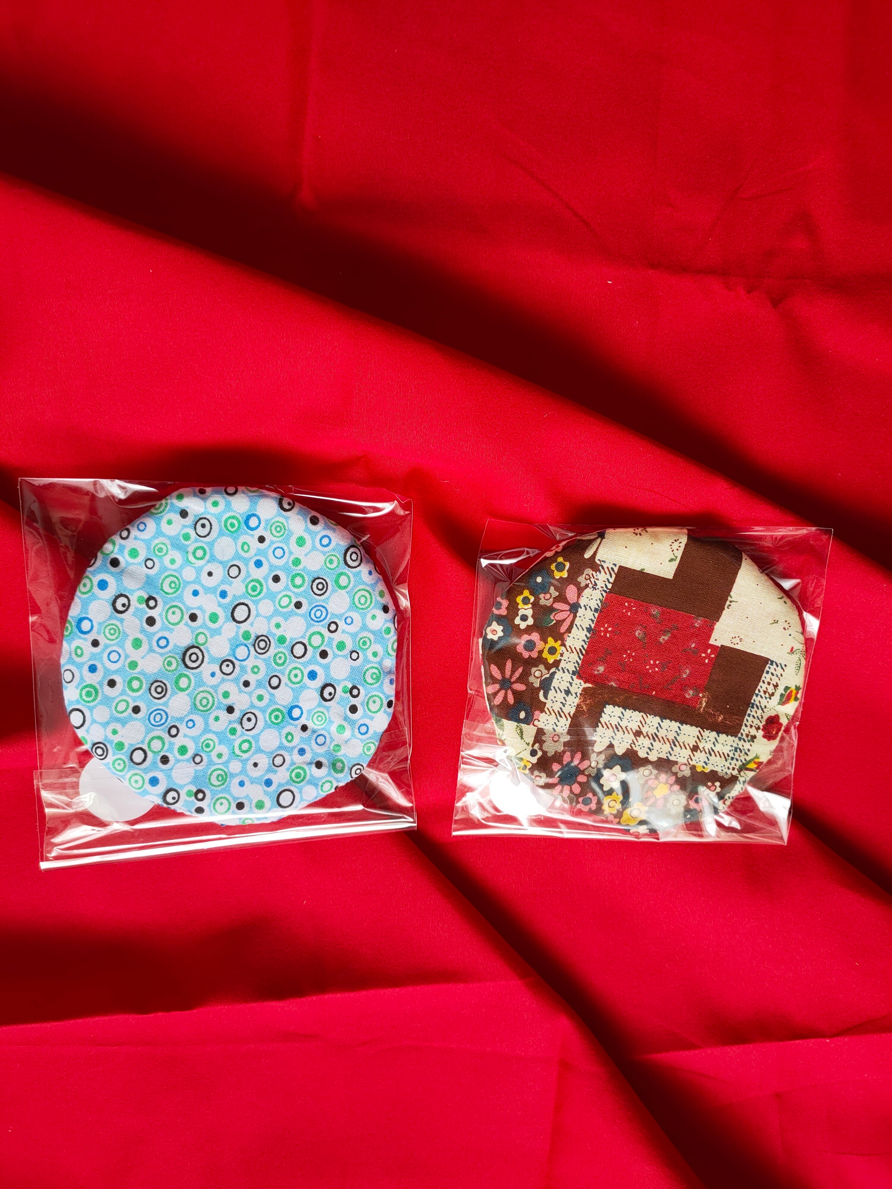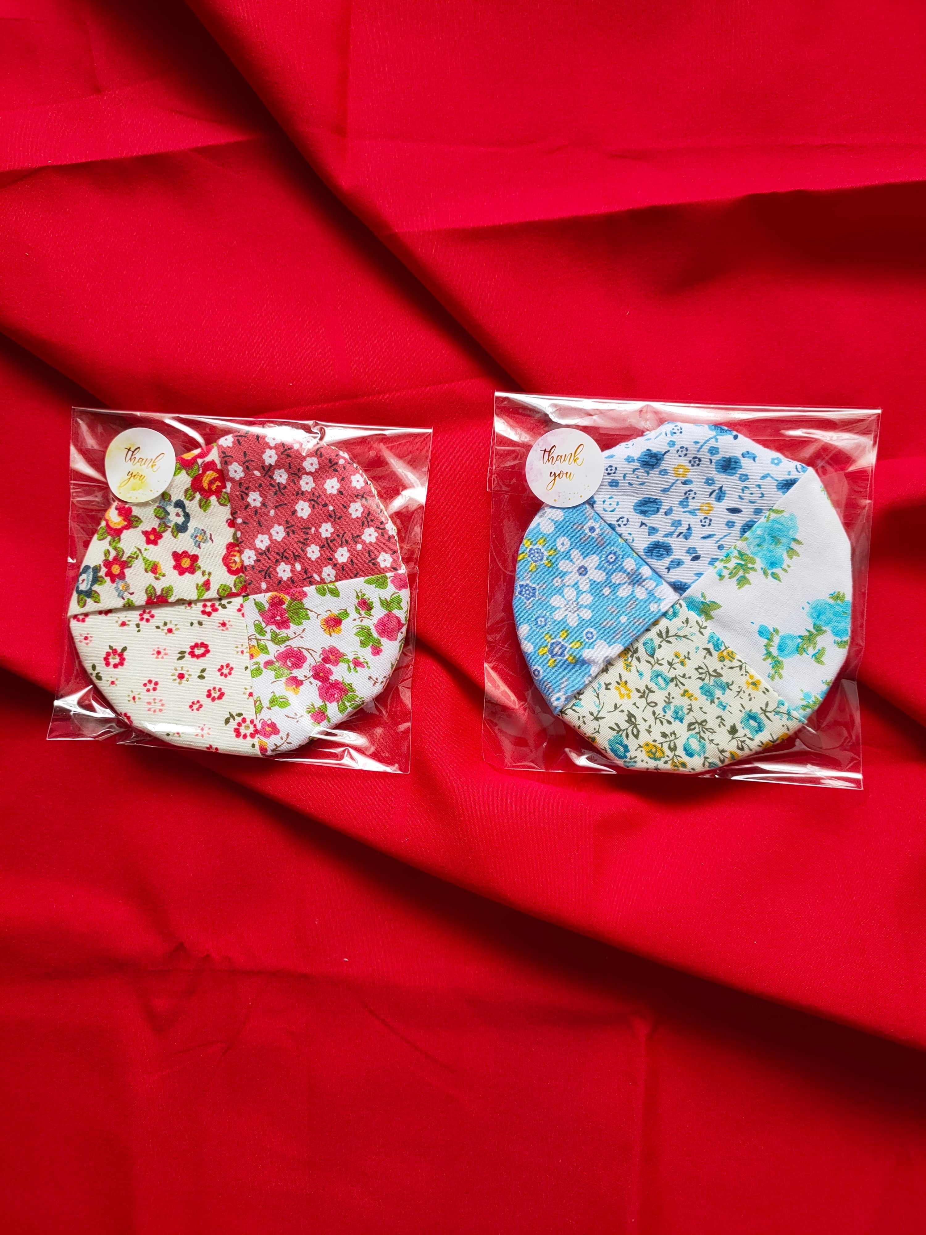 一点一点丁寧に手作りした、パッチワーク柄の鍋敷きとコースターの4点セットです。