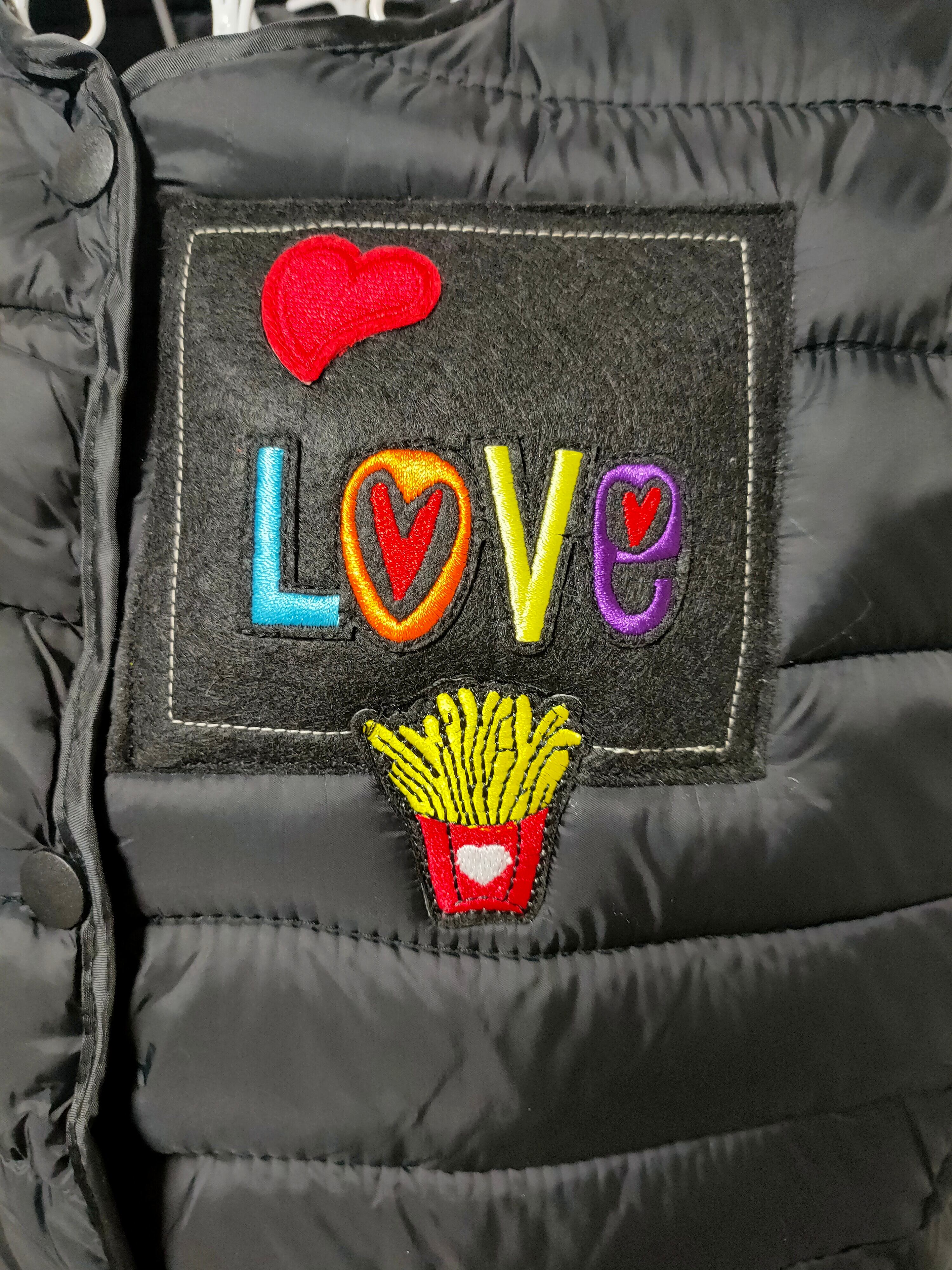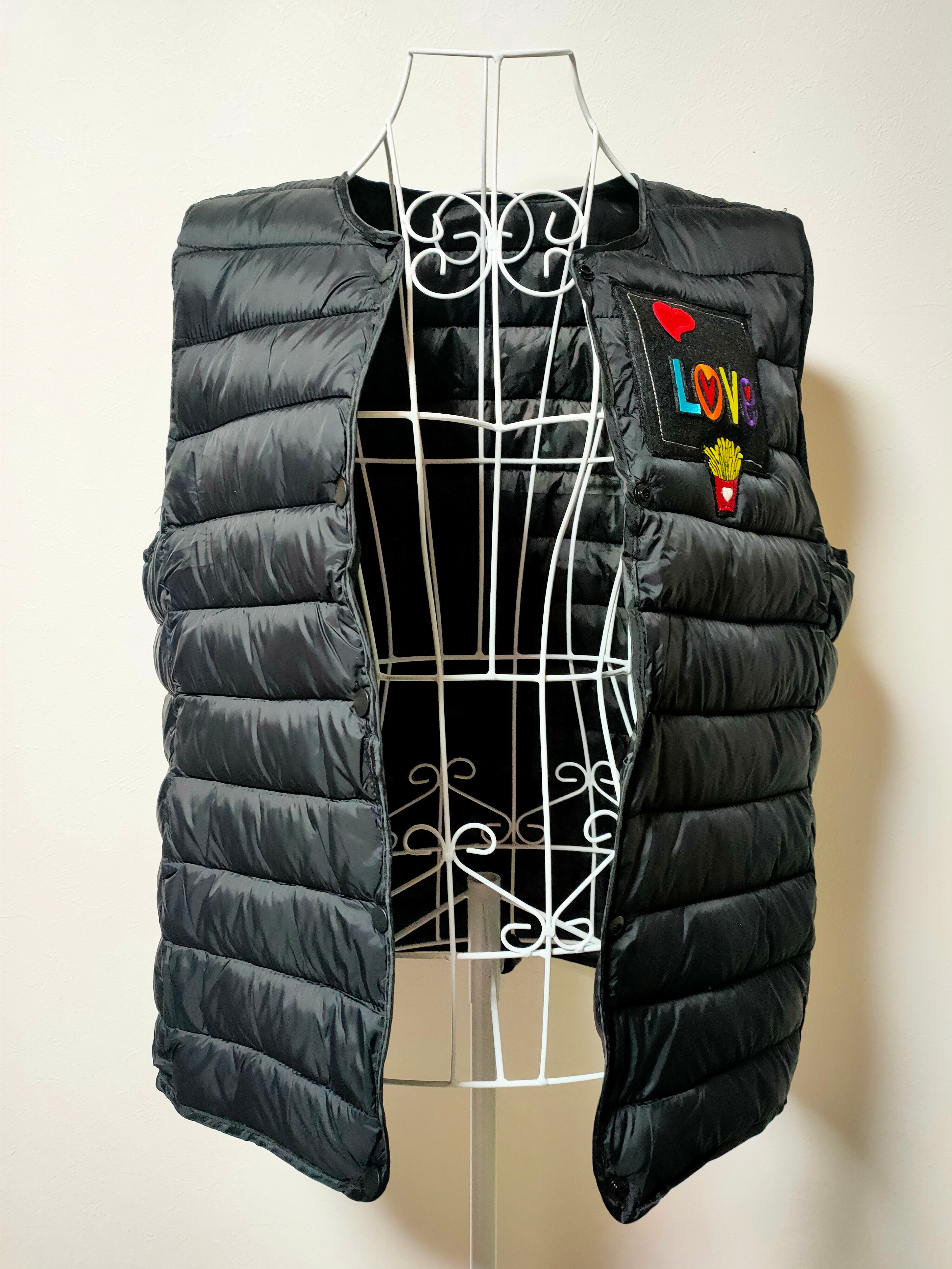 定番のブラックベストに、カラフルな「LOVE」の文字とフライドポテトのモチーフを大胆に配置。シンプルなアイテムでありながら、一瞬で目を引く遊び心あふれるデザインが、あなたのスタイルを格上げします。