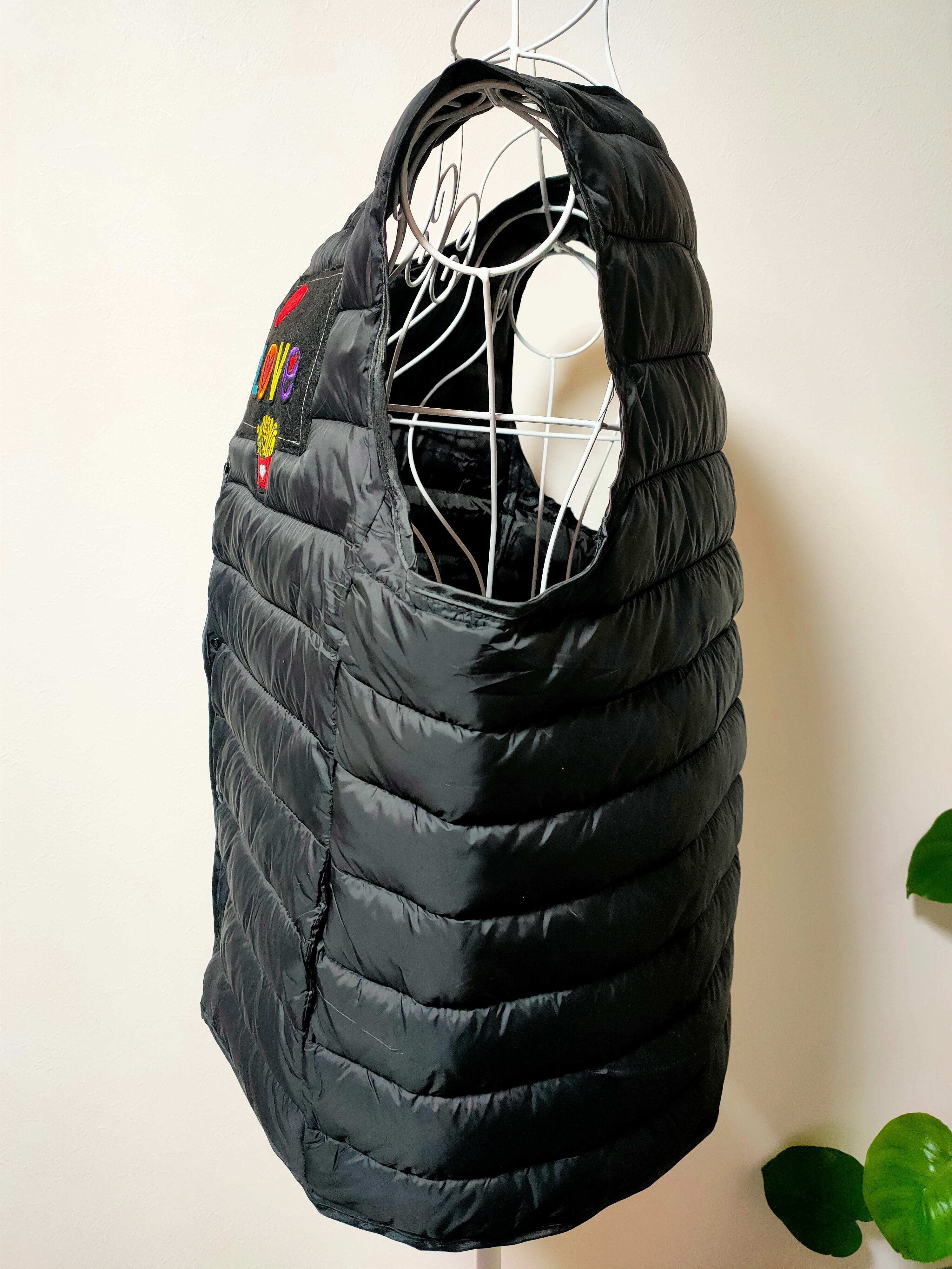 この冬、毎日のコーディネートに差をつける、**個性的なワッペン付きの軽量キルティングベスト(女性LLサイズ)**が登場しました。
