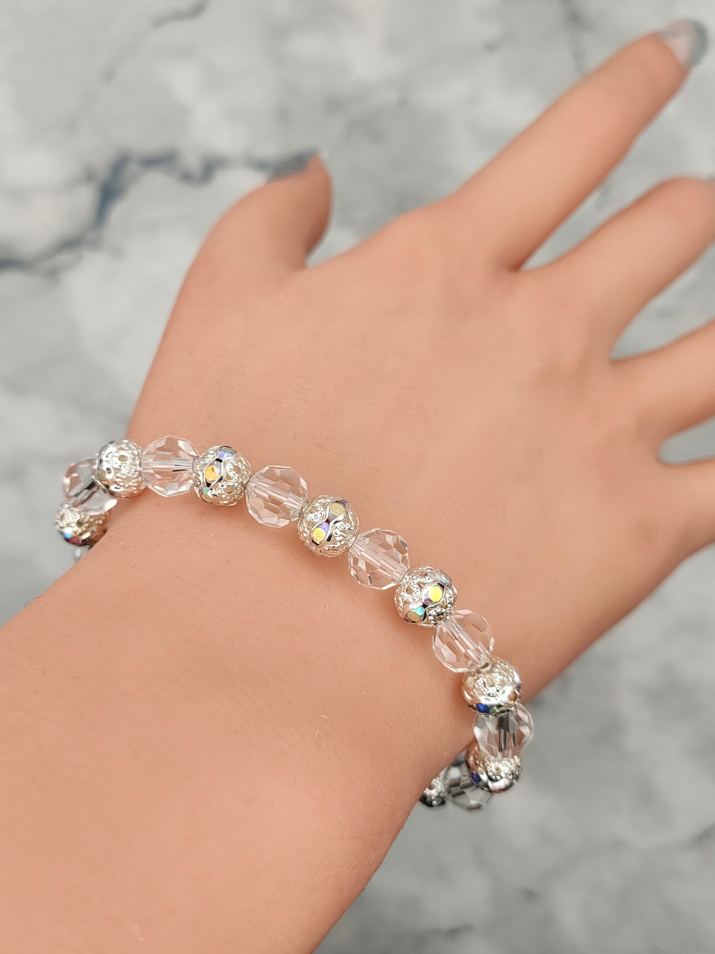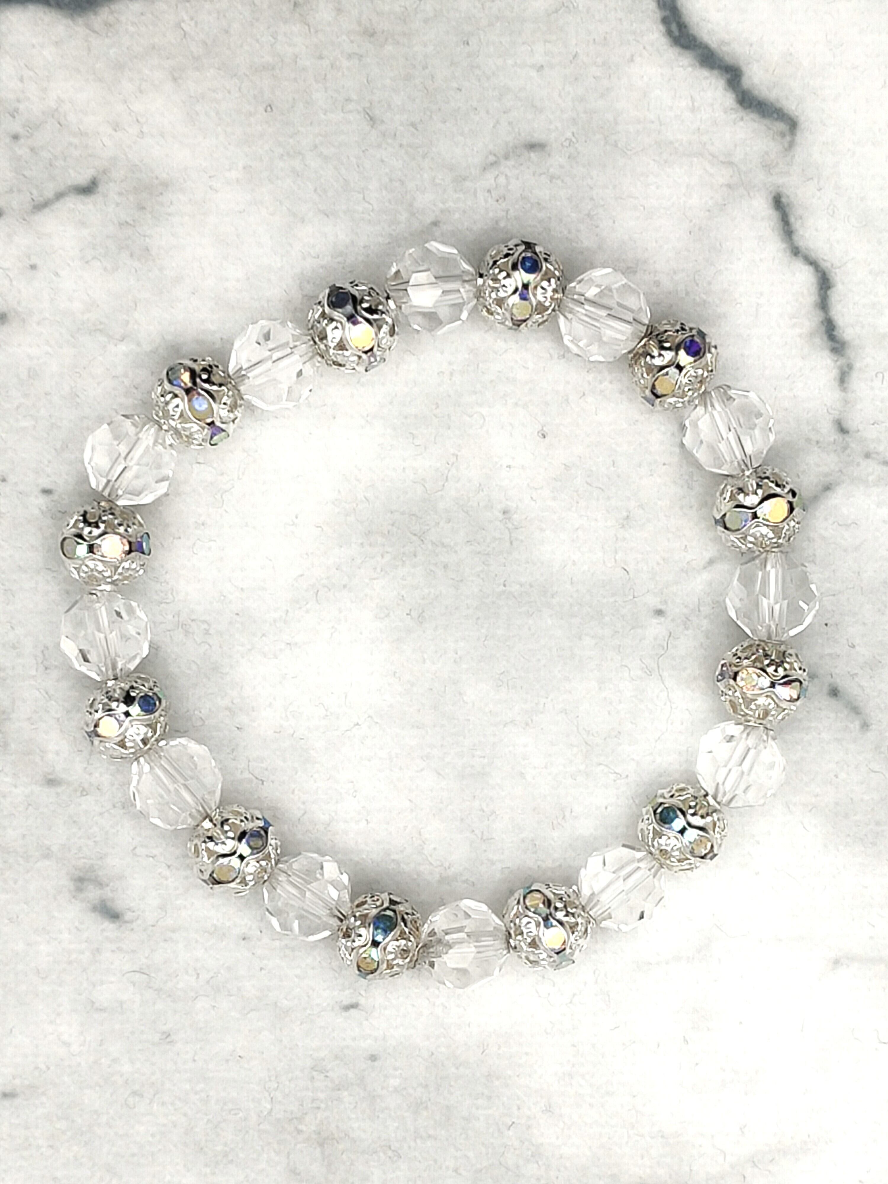 光を反射して美しく輝く多面カットのクリスタルと、繊細な透かし彫り(フィリグリー)を施したシルバーパーツを交互に配した、上品なブレスレットです。