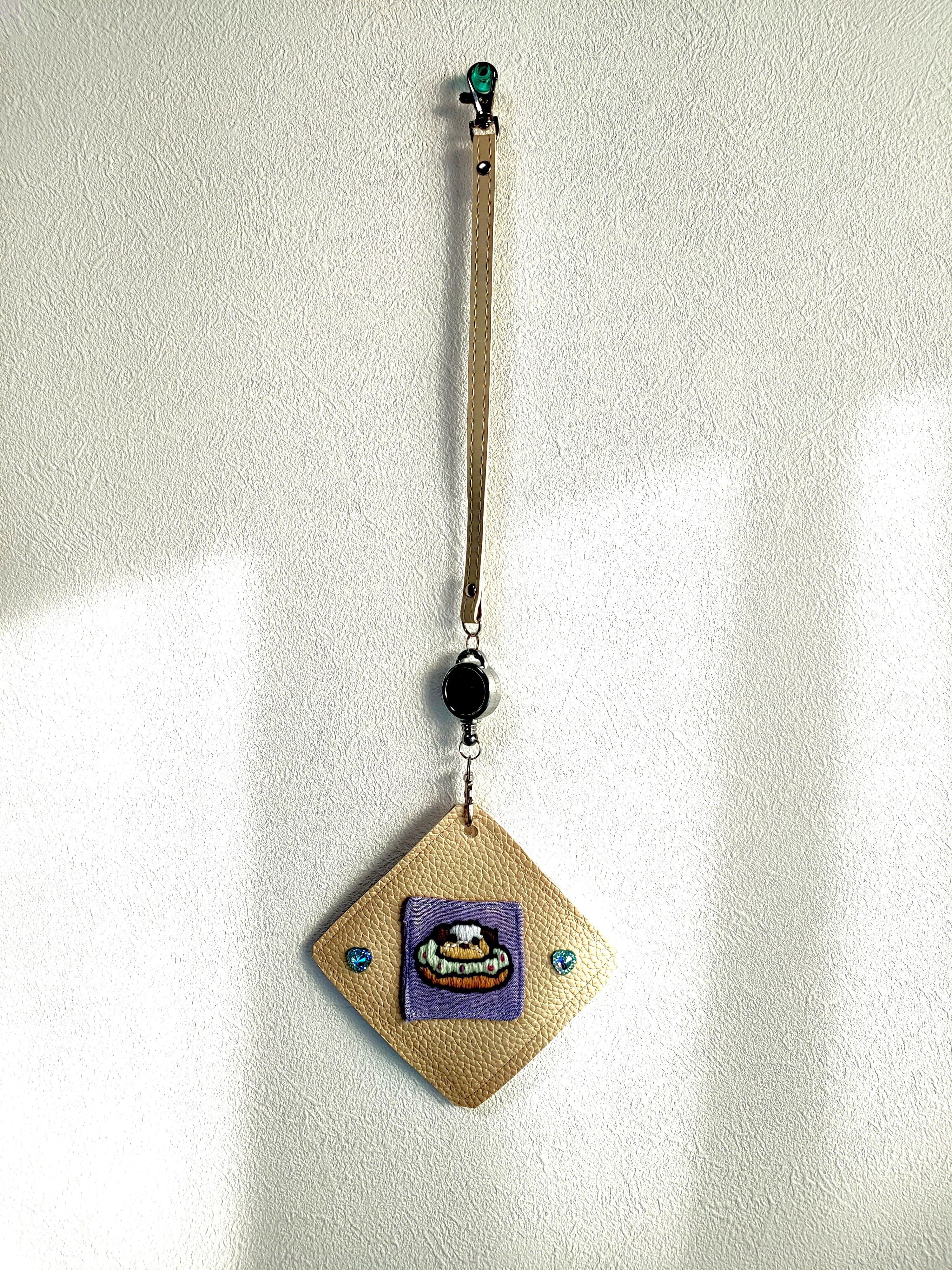 ドーナツからひょっこり顔を出した犬の刺繍を施した、大人可愛いリールキーホルダーです。 約10cm×10cmの大きめな合皮ベースを採用することで、バッグの中で鍵やカードケースが迷子になる問題を解決しました。手探りでもすぐに見つけられるサイズ感は、荷物の多い日や急いでいる時に大変便利です。
