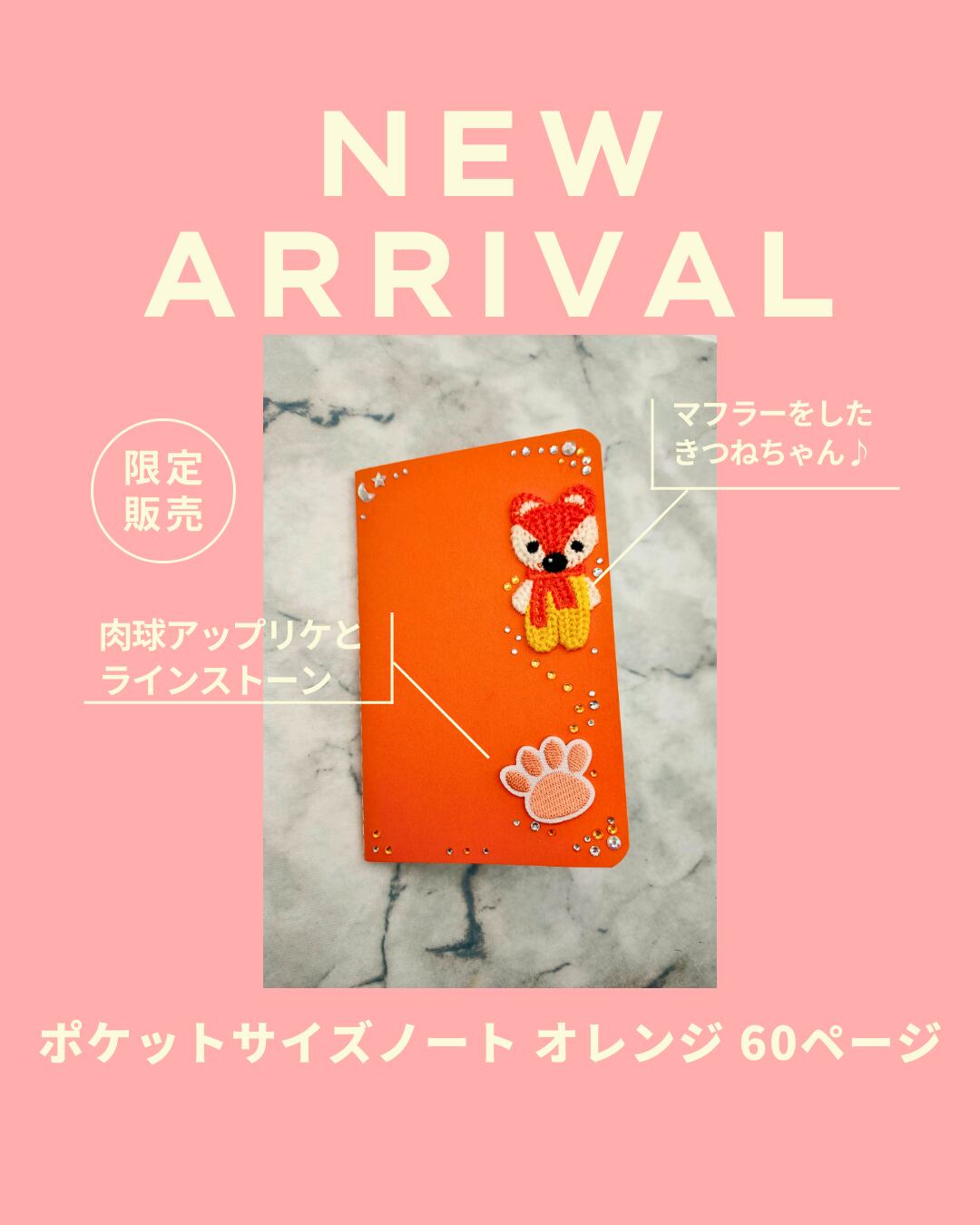 持ち運びに便利なポケットサイズのノートを、可愛いきつねのワッペンとキラキラ輝くラインストーンでデコレーションしました。
