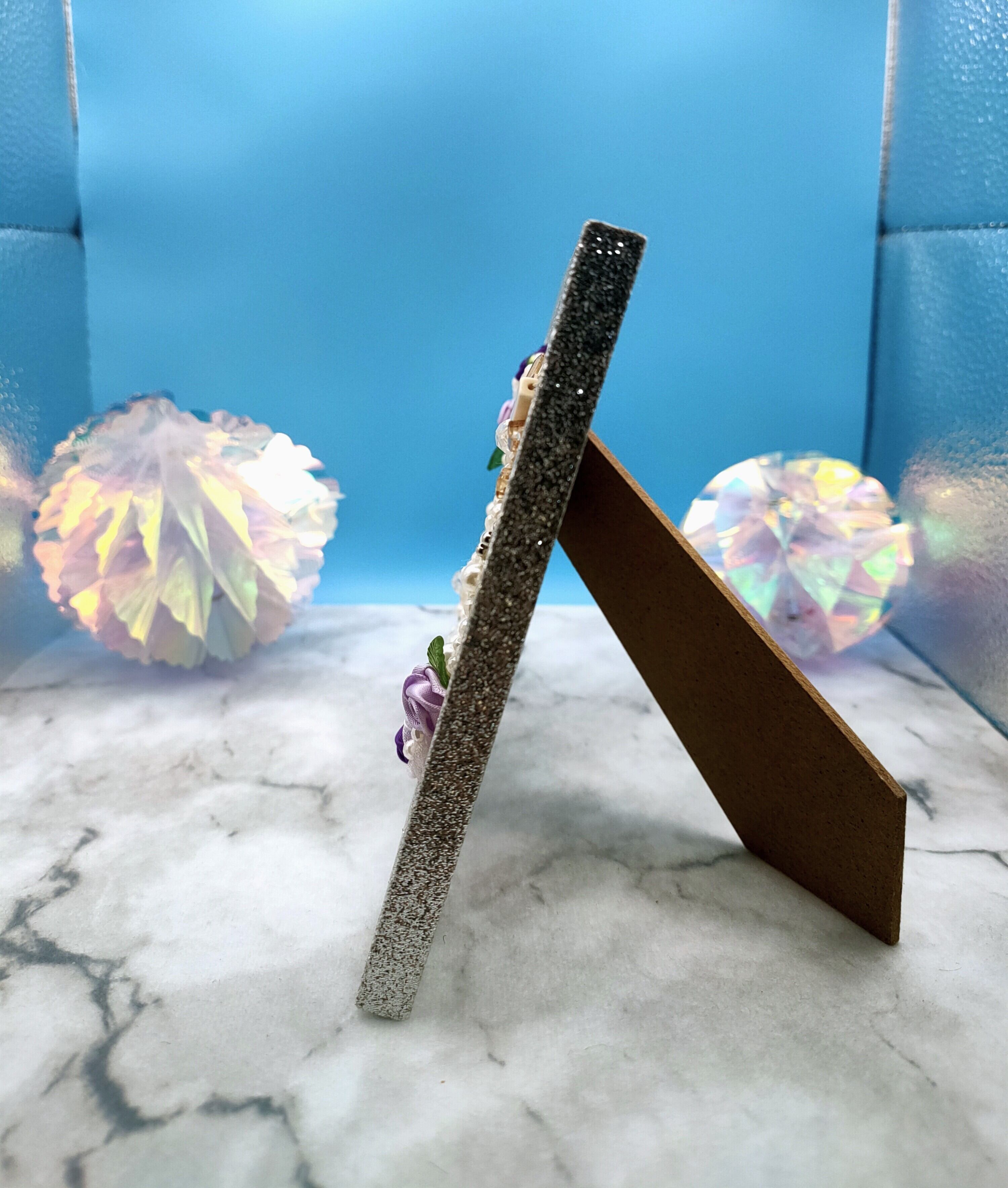 シルバーラメのフレームは、夢の中の光や、絶望の先に差す希望をイメージしています。 裏面にはシルバーの合皮を貼り、見えない部分まで美しく、贅沢に仕上げました。